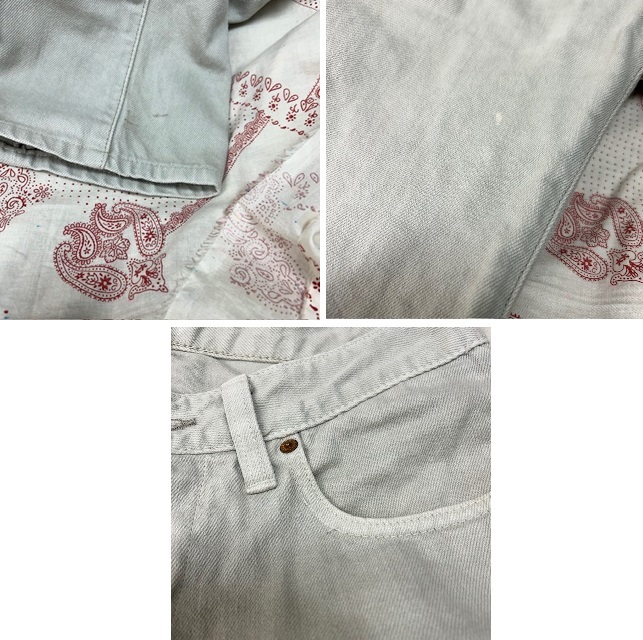 ●状態・・・USEDになりますが、丁寧に着られていた感じで、多少の着用感・一か所僅か色抜け・裾付近に小さな薄汚れ・2~3cmのポケットのステッチ飛びは見られますが、USEDデニムの風合いで、目立つ汚れやダメージなどは見られず、USEDを着られる方でしたら問題なく着ていただける、綺麗なほうの状態だと思います。