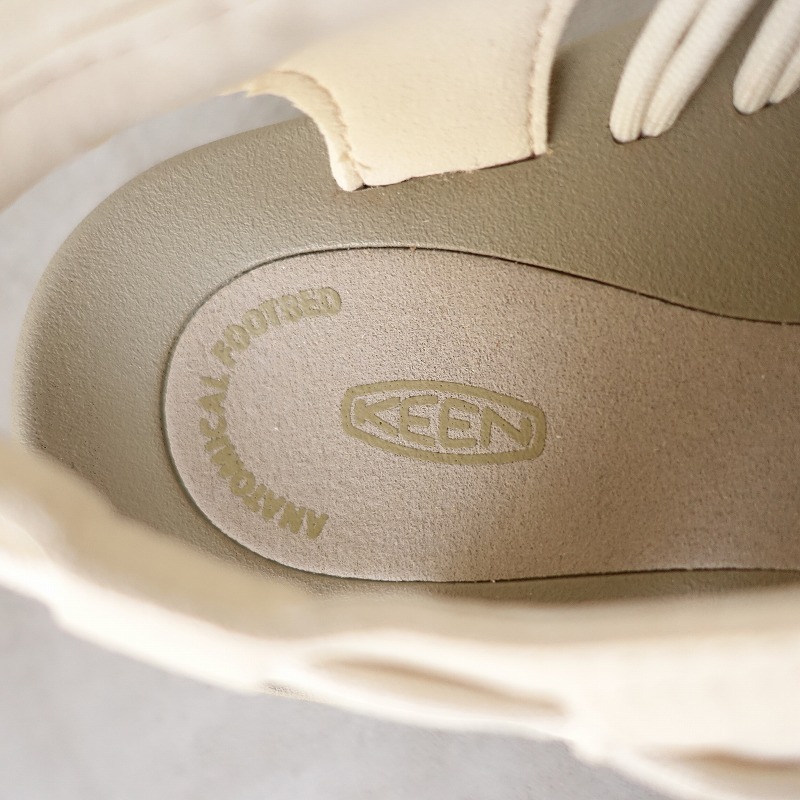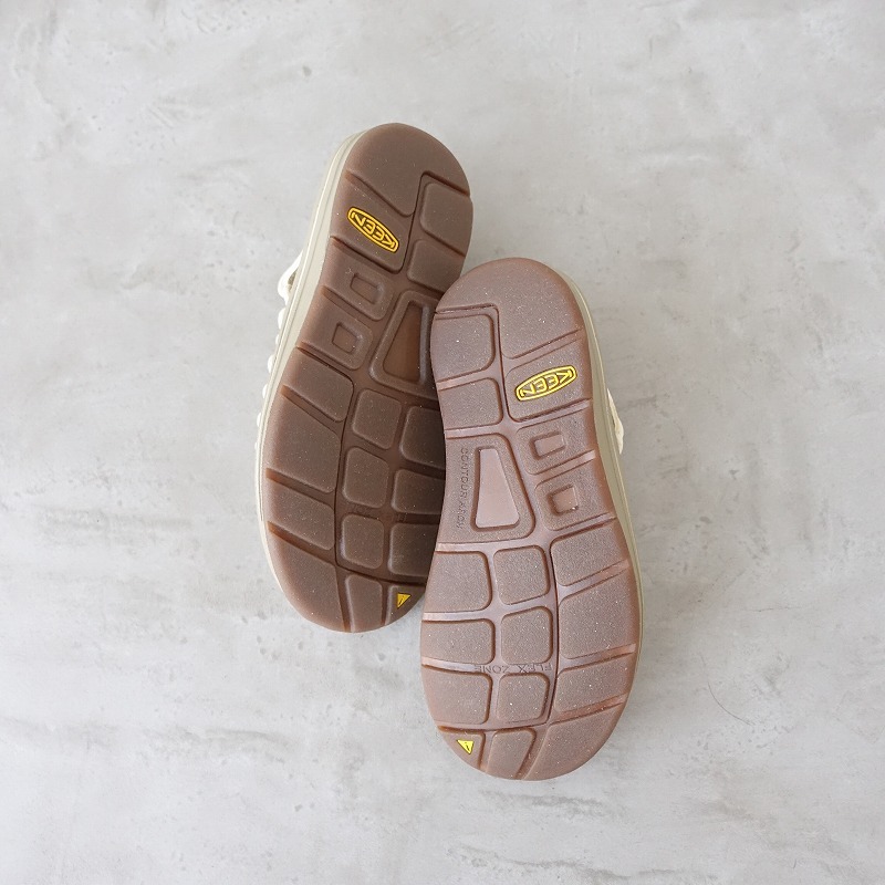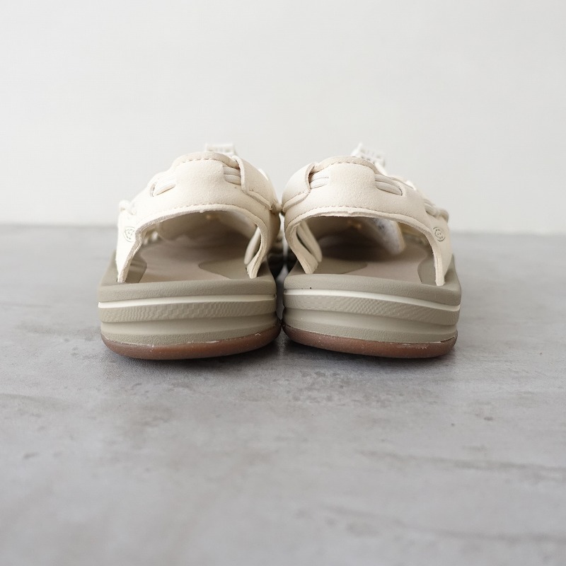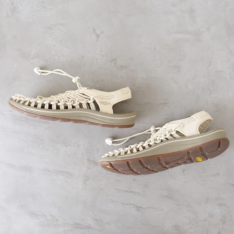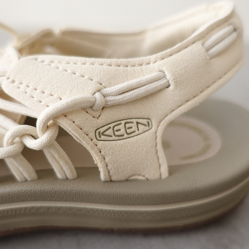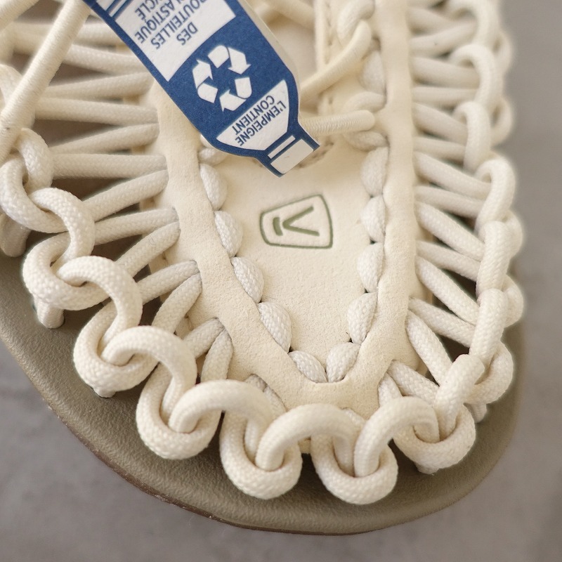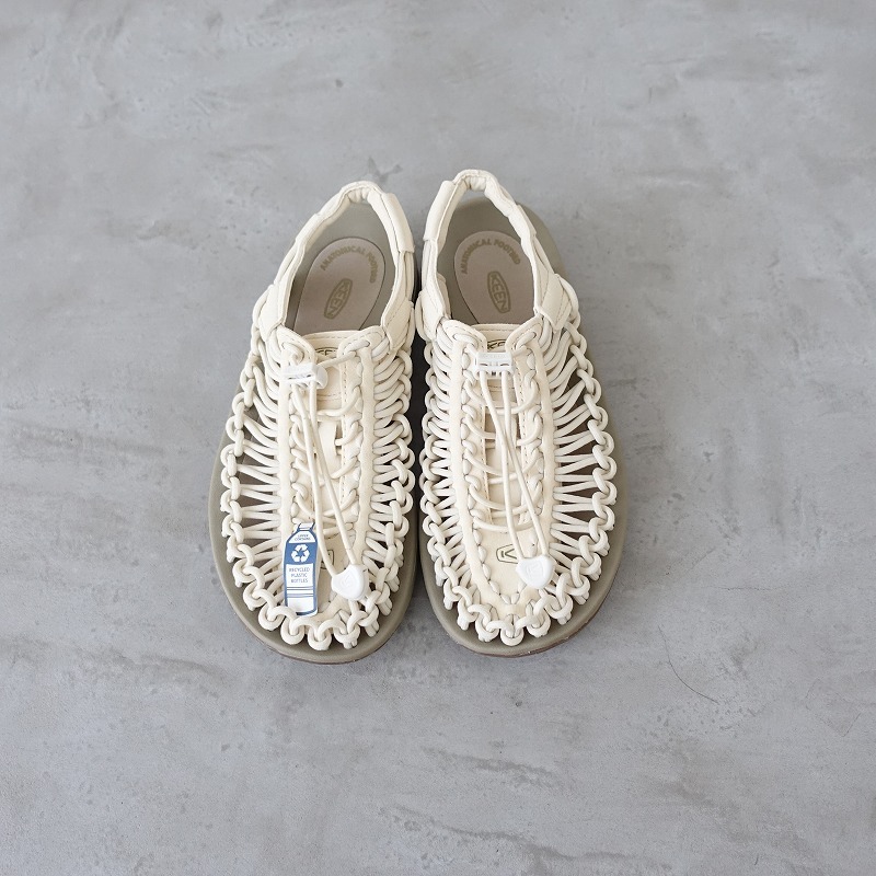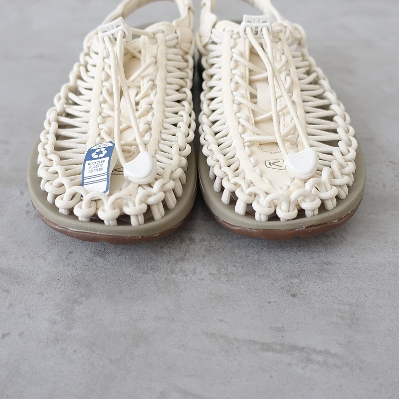 | KEENのUNEEK WHITE CAP/CORNSTALK メッシュサンダルです。カラーはアイボリーで、伸縮性のある紐で甲部分が編み込まれたデザインです。中央のトグルで固定して着用できます。 |