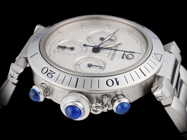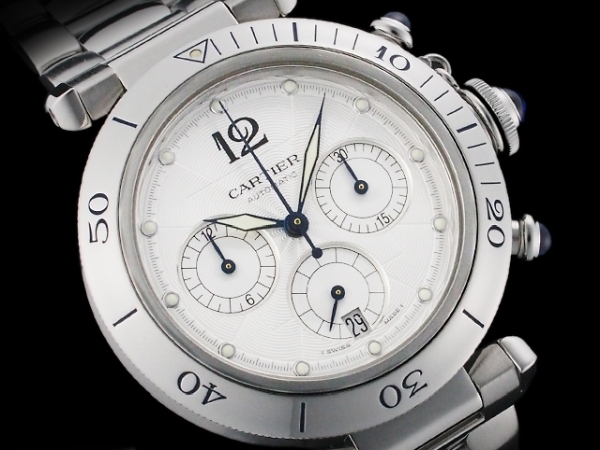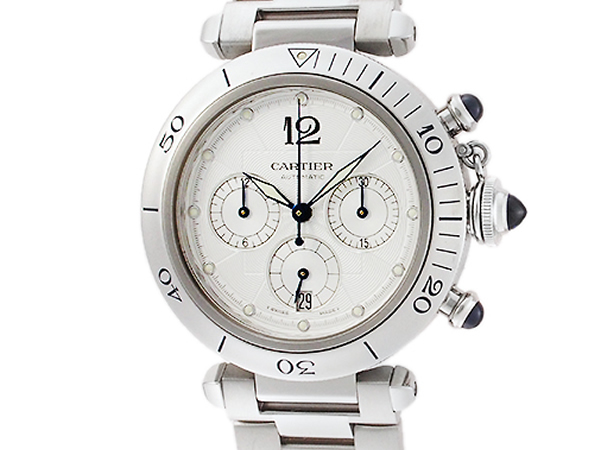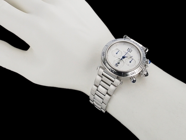 備考:爽やかで美しいシルバーギョーシェフェイスにスポーティーさとエレガントさが融合した「パシャ38mm」。バンドに傷残りが見られますが、仕上済でクロノグラフが搭載された、機能的でカルティエの中で高い人気を誇る上品でエレガントなモデルです。