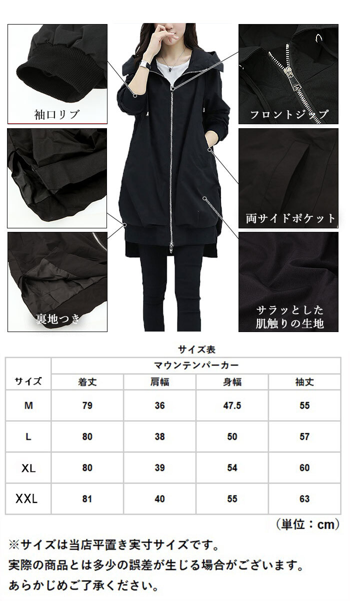 商品説明 | ・ロング丈で体型カバーができるフード付きのマウンテンパーカーが登場。 ・きれいめスタイルはもちろん、カジュアルスタイルとも相性のよいシンプルデザインで、着回し力◎ ・サラッとした肌触りの生地で快適な着心地。両袖部分にも裏地が付いているので、腕を通しやすくサッと羽織れる。 ・袖口のリブがしっかりしていて腕まくりをしても落ちにくい。 ・フロントジップを開けたままルーズめに、ジップを閉めてかっちり着こなしてもOK!シンプルなのに表情の変化が楽しめる♪ ・1枚持っているだけでコーデの幅が広がるアイテム。 |