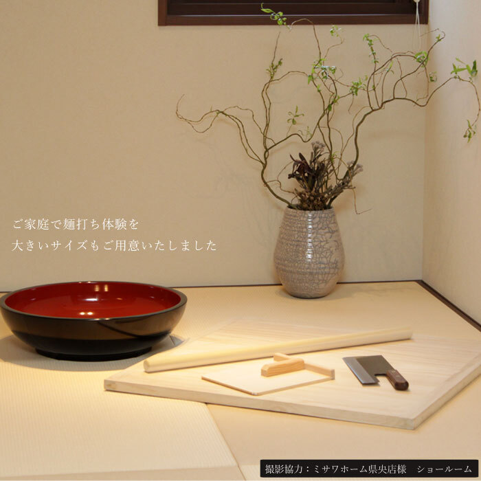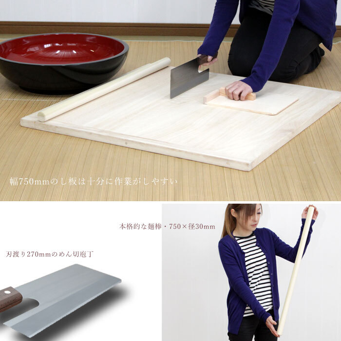 | [のし板]幅75×奥行75×高さ2.5cm [めん棒]直径3×長さ75cm [こね鉢]直径48cm×高さ12.6cm [めん切庖丁]刃渡り 27cm 約370g [コマ板]20×24.5cm |