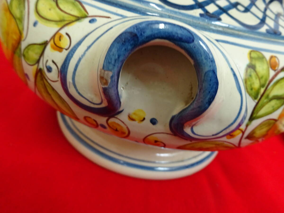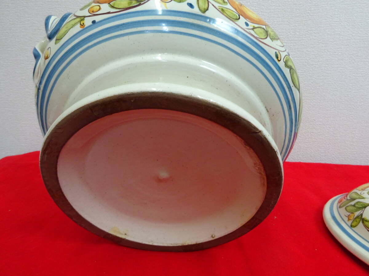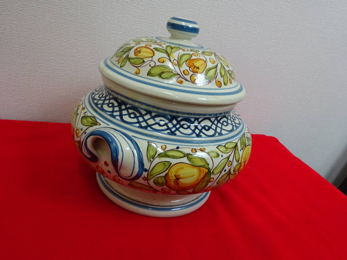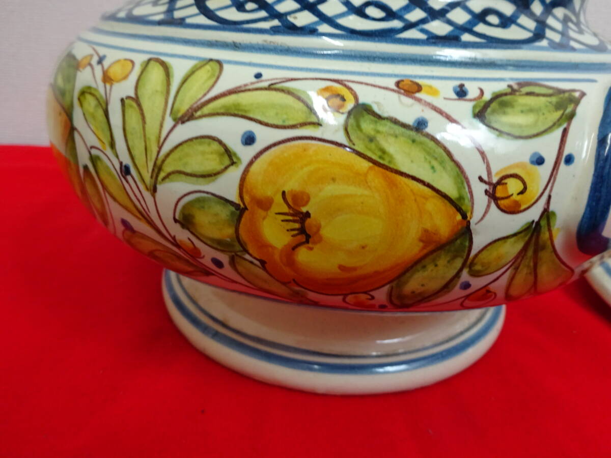 | イタリア グッビオ 蓋つき 陶器 壺 花器 入れ物 持ち手つき 手描き インテリア 豊かな歴史溢れる美しい山と陶器の町で知られるイタリアの町、グッビオ(イグウィウム)の陶器です。 ころんと丸みのあるフォルムに大ぶりの鮮やかな手描きの絵で置くだけで空間のアクセントとなる存在感です。 【サイズ】 (約)幅300×奥行270×高さ270ミリ(フタなし175ミリ) 口径(約)180ミリ 【コンディション】 USEDです。 多少の汚れや表面のハゲ・小さなカケ等ありますが、大きく美観を損なうダメージなく、程度良好のお品です。 商品画像をよくご確認の上、ご入札ください。 USED品(未使用品含む)になりますので完璧を求める方、 美品・完品を求める方、神経質な方はご入札はご遠慮ください。 尚、画像の色は、ご使用になる機器により多少変化する場合もございます。 経年劣化による汚れ、キズ等ある場合がございます。 説明と画像の矛盾、見落としが、ある場合がございますが、あくまでも画像でご判断のうえ、 ノークレーム・ノーリターン・ノーキャンセルでのお取引をお願いいたします。 ★写真掲載の白い丸等はフラッシュの光の反射です。 PC環境や写真撮影時の光の環境によって画像と若干色目が違って感じる場合がありますので、ご了承ください。 ☆タイトルの 検 以降は商品テイストとしての検索用キーワードになりますので、 本商品とは関係ない場合が御座います。 ★携帯からご覧の場合は、必ずパソコンからもご確認下さい。 ☆写真掲載枚数に限りがありますので実用に差し支えない部分や、あまりに細かい傷などは 記載できない場合があります。予めご了承下さい。 ※光加減によって色が変わって見えます。 | ||