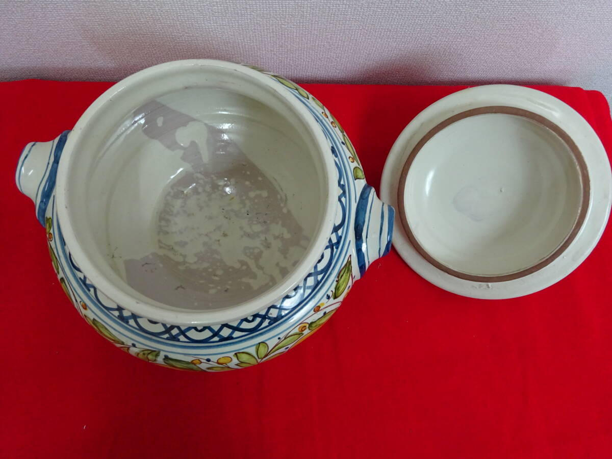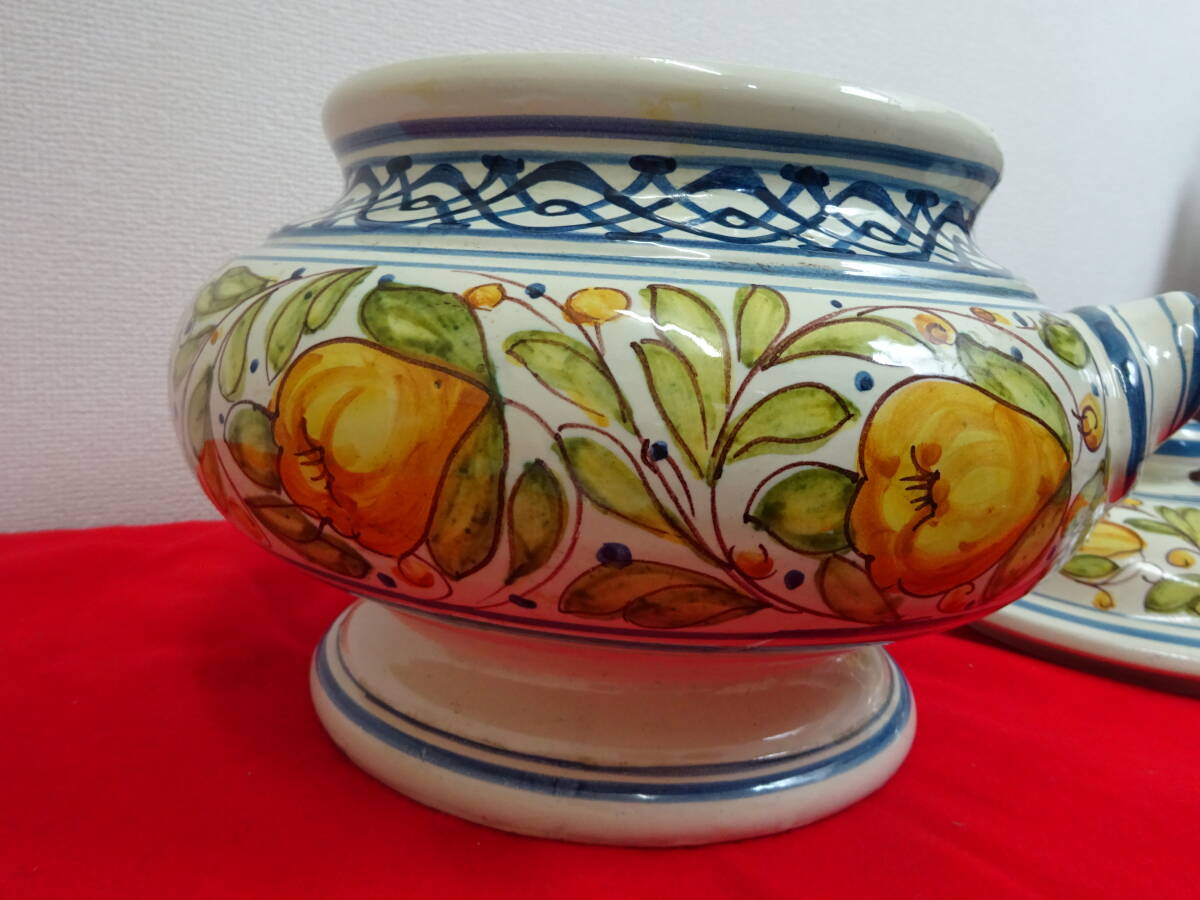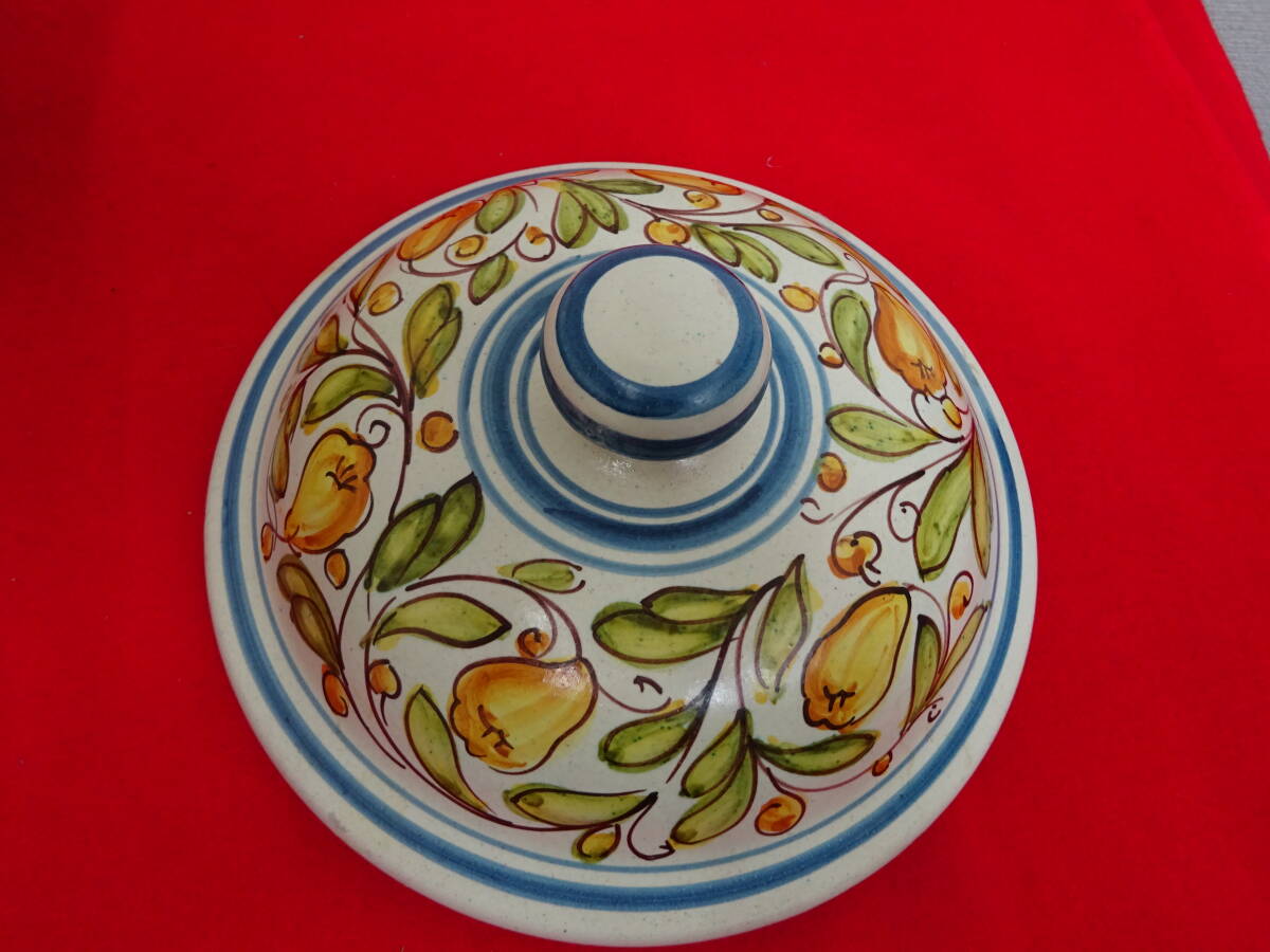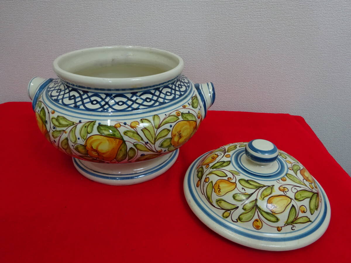 | イタリア グッビオ 蓋つき 陶器 壺 花器 入れ物 持ち手つき 手描き インテリア 豊かな歴史溢れる美しい山と陶器の町で知られるイタリアの町、グッビオ(イグウィウム)の陶器です。 ころんと丸みのあるフォルムに大ぶりの鮮やかな手描きの絵で置くだけで空間のアクセントとなる存在感です。 【サイズ】 (約)幅300×奥行270×高さ270ミリ(フタなし175ミリ) 口径(約)180ミリ 【コンディション】 USEDです。 多少の汚れや表面のハゲ・小さなカケ等ありますが、大きく美観を損なうダメージなく、程度良好のお品です。 商品画像をよくご確認の上、ご入札ください。 USED品(未使用品含む)になりますので完璧を求める方、 美品・完品を求める方、神経質な方はご入札はご遠慮ください。 尚、画像の色は、ご使用になる機器により多少変化する場合もございます。 経年劣化による汚れ、キズ等ある場合がございます。 説明と画像の矛盾、見落としが、ある場合がございますが、あくまでも画像でご判断のうえ、 ノークレーム・ノーリターン・ノーキャンセルでのお取引をお願いいたします。 ★写真掲載の白い丸等はフラッシュの光の反射です。 PC環境や写真撮影時の光の環境によって画像と若干色目が違って感じる場合がありますので、ご了承ください。 ☆タイトルの 検 以降は商品テイストとしての検索用キーワードになりますので、 本商品とは関係ない場合が御座います。 ★携帯からご覧の場合は、必ずパソコンからもご確認下さい。 ☆写真掲載枚数に限りがありますので実用に差し支えない部分や、あまりに細かい傷などは 記載できない場合があります。予めご了承下さい。 ※光加減によって色が変わって見えます。 | ||