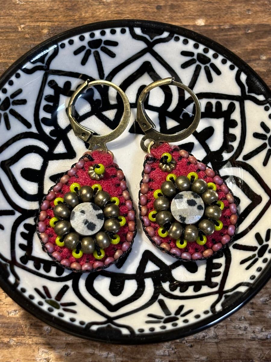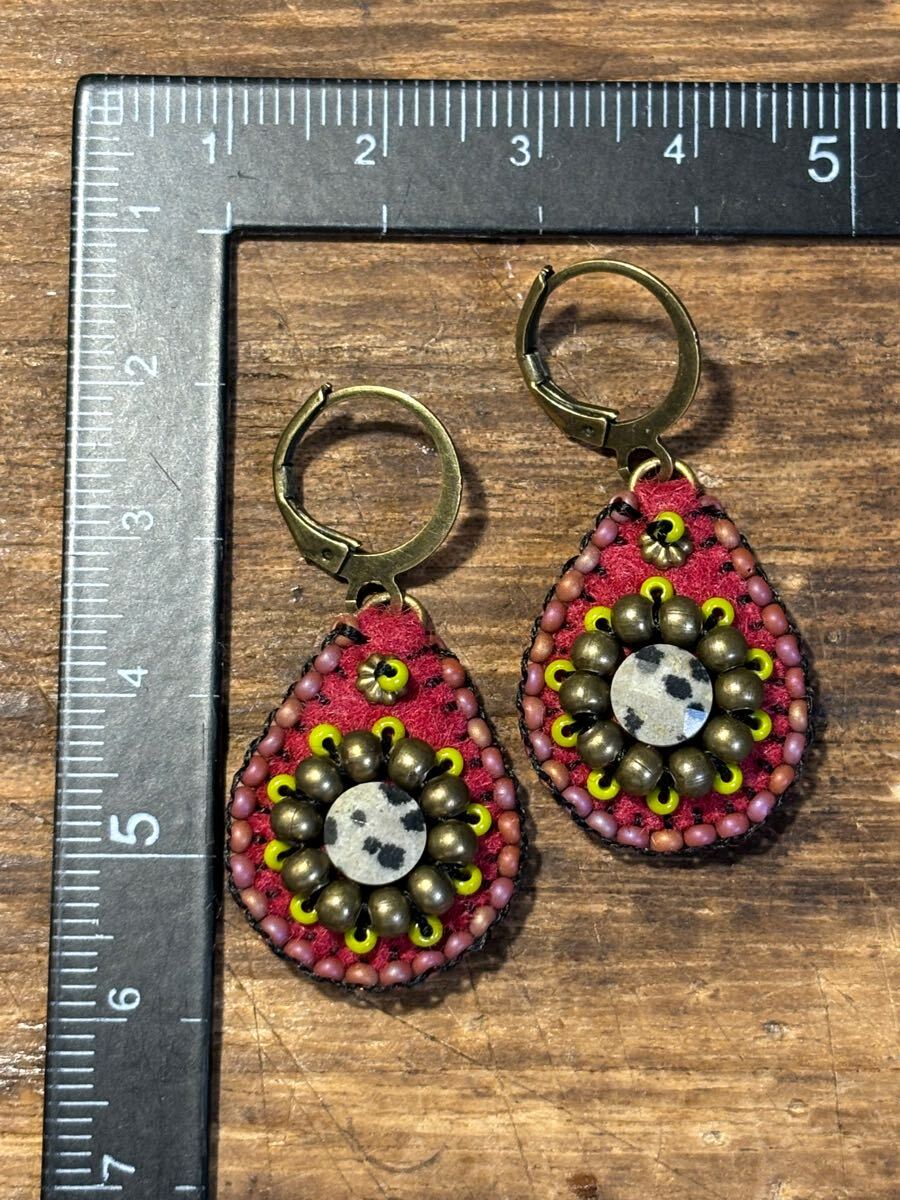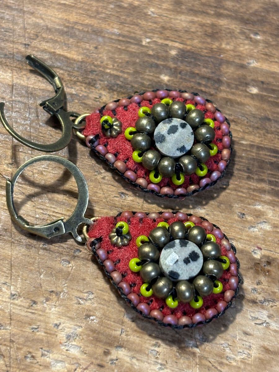 とても可愛いピアスが出来上がりました。天然石ダルメシアンジャスパーのコインカットをビーズ刺繍でボヘミアン調のフックピアスに仕上げました。他の石でも制作中です。