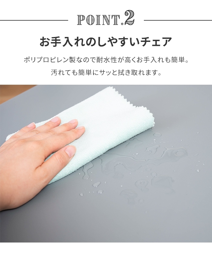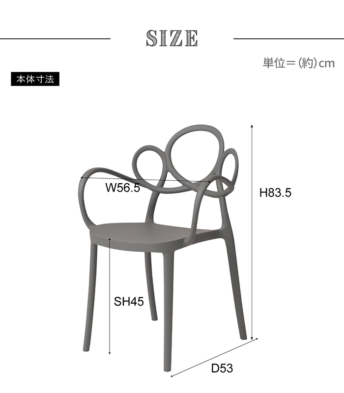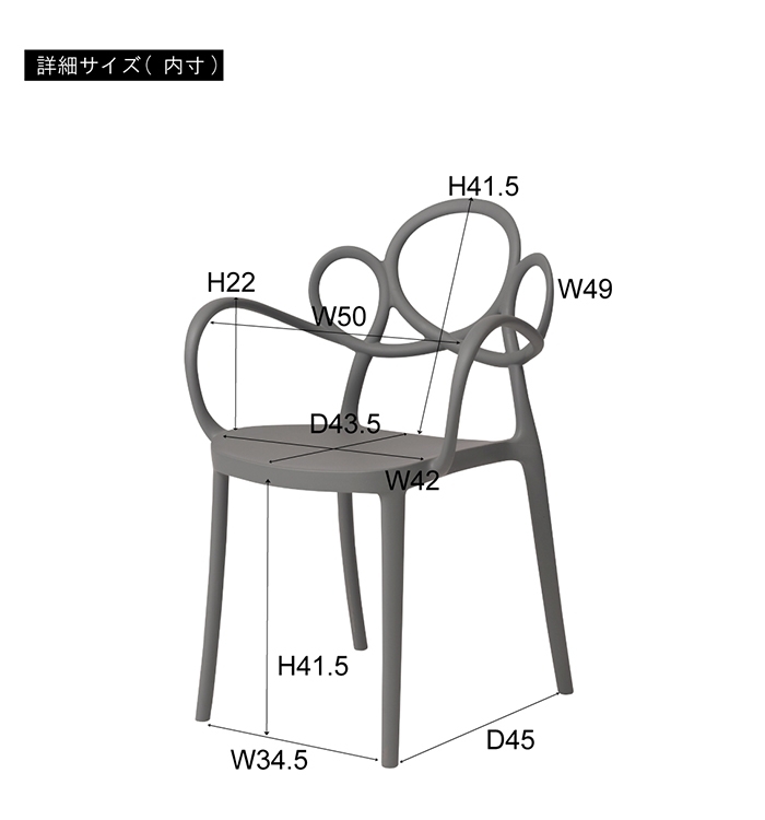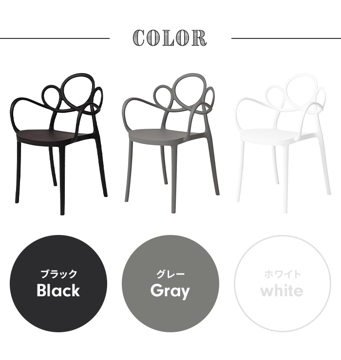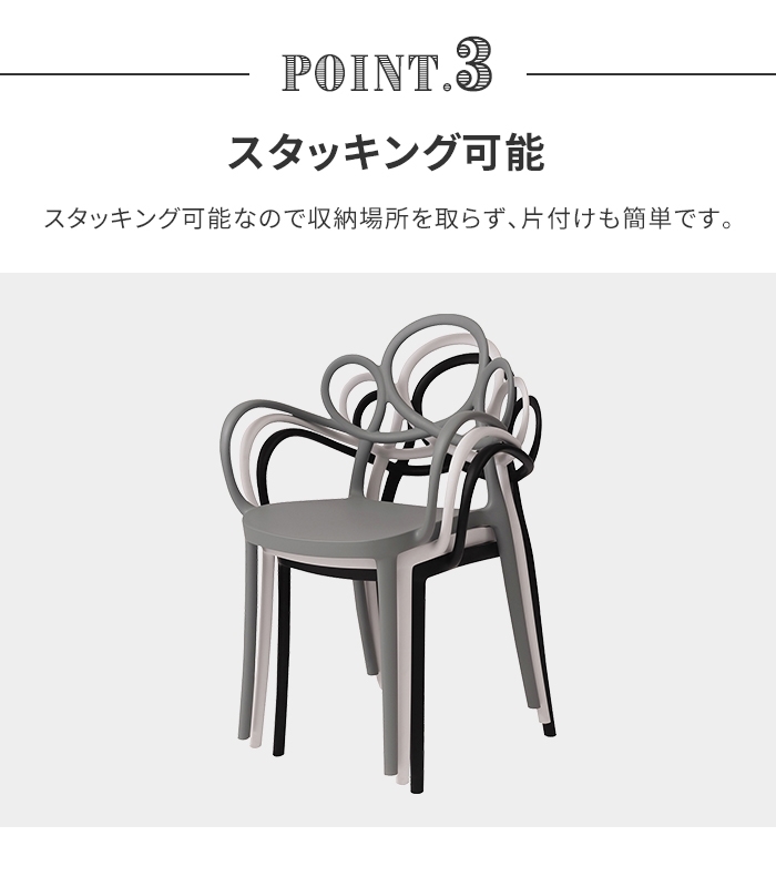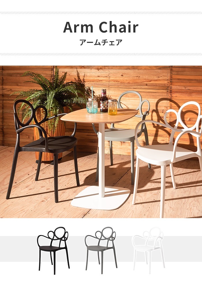 | アーム部分の曲線がひじや手にぴったりと沿うデザイン。 汚れてもお手入れのしやすいポリプロピレンを使用しており、スタッキング可能なのでコンパクトに収納できます。 |