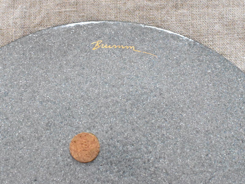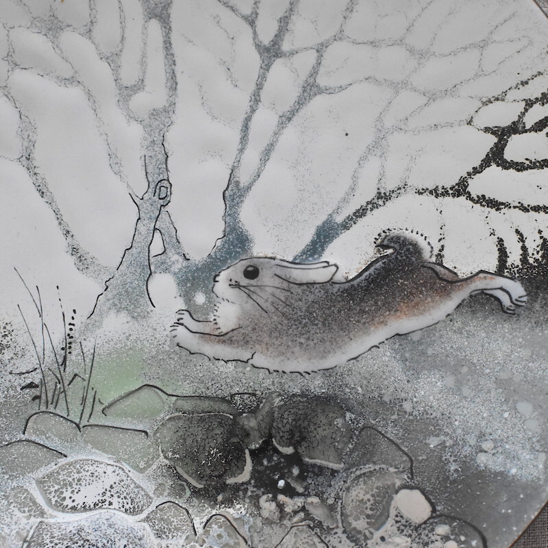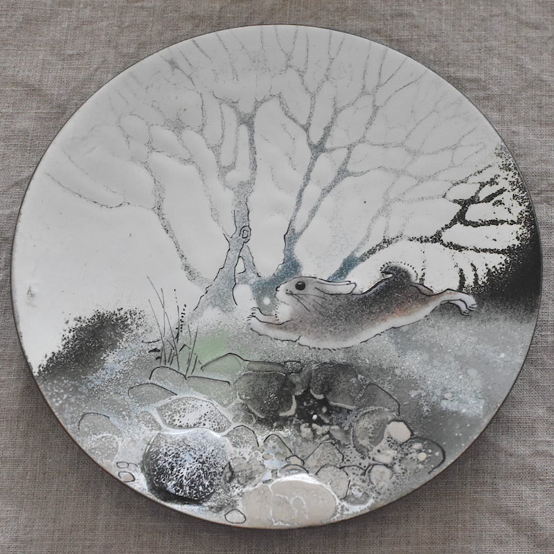 アメリカのアーティスト、ノーマン・ブルム (Norman brumm, 1938 - 2008) による絵皿です。銅皿にエナメルで自然のなかで躍動するうさぎが描かれています。