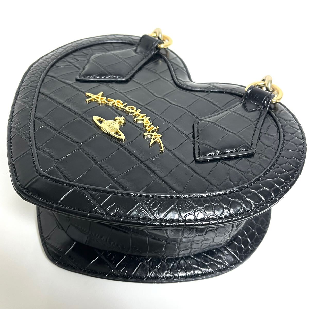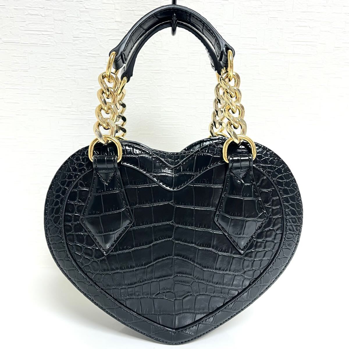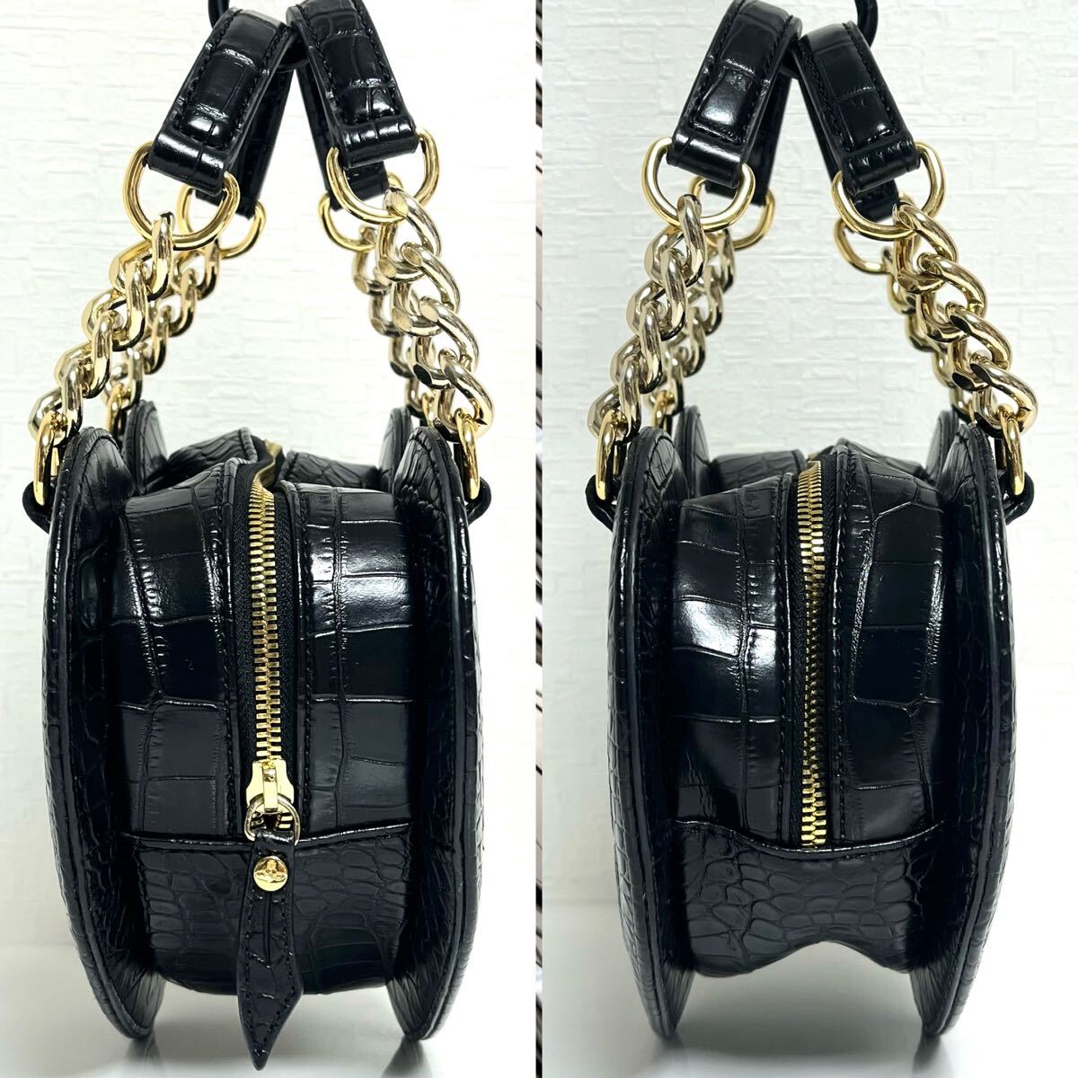 縁をパイピングしたように切り替え、よりハートの形を強調。クロコ型押しエナメルメゴールドカラーのチェーンのコントラストが目を引きます。ハンド×ショルダ一の2Way仕様。