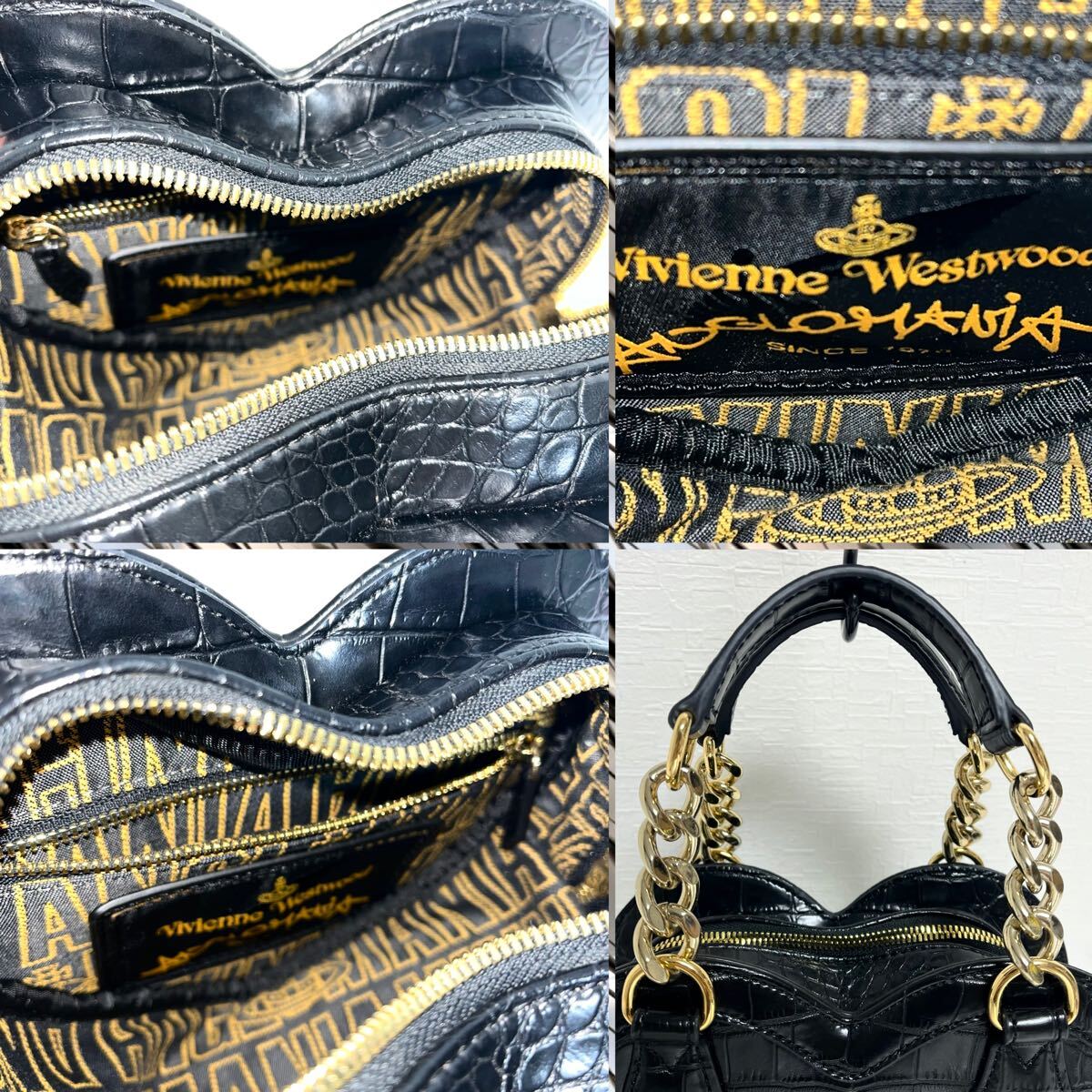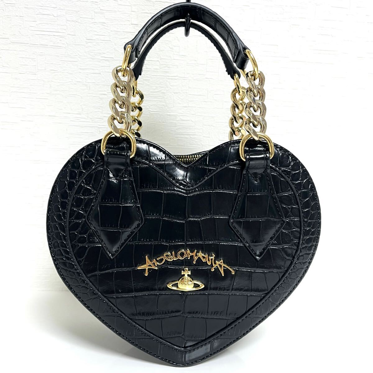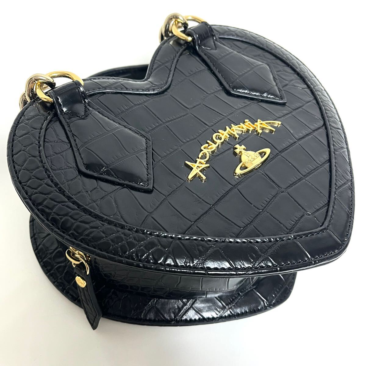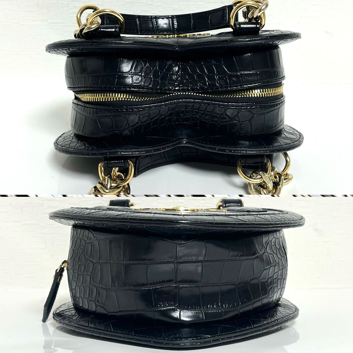 縁をパイピングしたように切り替え、よりハートの形を強調。クロコ型押しエナメルメゴールドカラーのチェーンのコントラストが目を引きます。ハンド×ショルダ一の2Way仕様。