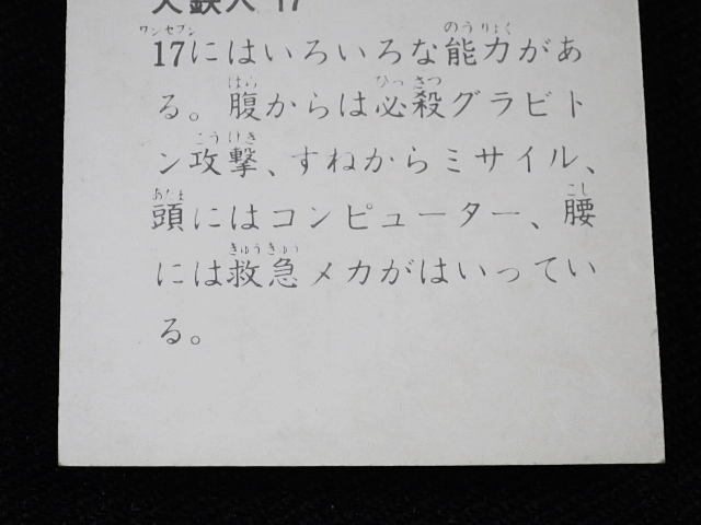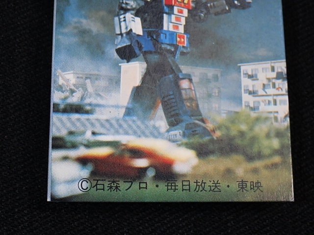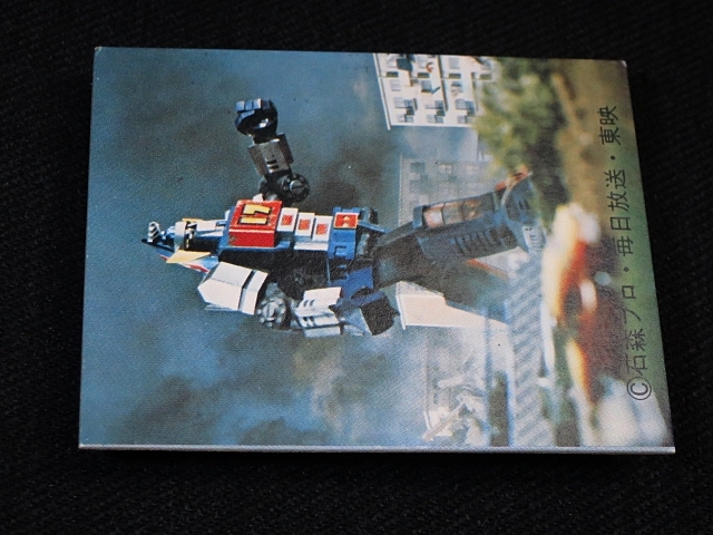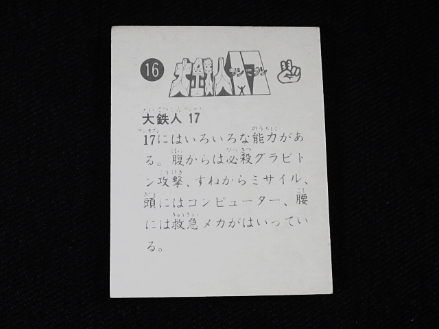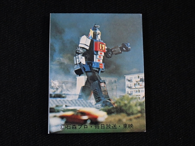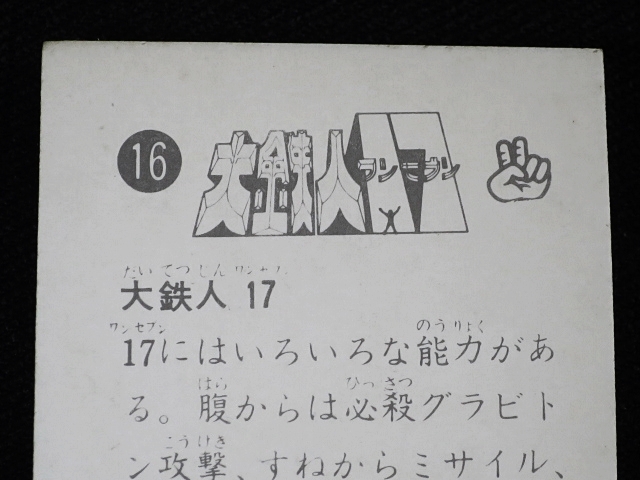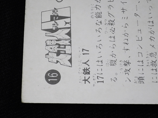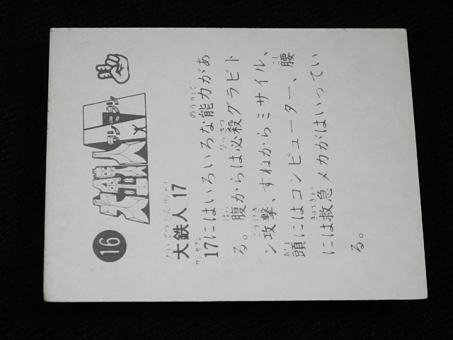 大鉄人 ミニカード バラ売り 1枚 1970年代 ・メーカー:天田 ・サイズ: 6.6 cm x 5.1 cm (裁断により若干誤差有り) ・発売時:1976年頃、当時の放送時に販売 ・構成:全60種シリーズ(1-60番.AL3種) ・発送:〒・各規格のサイズ内、重量内での同梱可能です。 〓参考項目〓 ・原作石森章太郎 ・脚本 伊上勝、上原正三、江連卓、熊谷節、安斉あゆ子 ・監督山田稔、若林幹、内田一作 ・放送局:TBS系列 ・放送期間:1977年3月18日-11月11日 ・全35話 ※出演者 ・南三郎 -神谷政浩 ・佐原千恵 -竹井みどり ・佐原博士 -中丸忠雄 ・剣持隊長 -原口剛 ・村中隊員 - 三井俊吾 ・海野隊員 - 菅野直之 ・小野隊員 - 大槻純子 ・岩山鉄五郎 -高品正広 ・岩山鉄次 -高橋仁 ・岩山エミ - 渡辺麻由美 ・佐原ルミ -島田歌穂 ・キャプテンゴメス -平田昭彦 ・ブラックタイガー -山本麟一 ・チーフキッド -山口あきら ・ハスラー教授 -大月ウルフ ・ピンクジャガー -三東ルシア ・ブルージャガー -太田美緒 ・ブレイン、ビッグエンゼル(声) -水島弘 ・ロボター(声) - 村松美枝子 ・ナレーター、ワンセブン(声) -小林恭治 | ||
