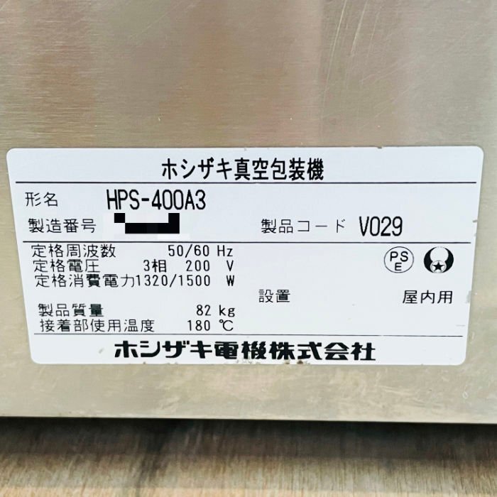 <仕様> 商 品 名 :真空包装機 メーカー:ホシザキ 型 番:HPS-400A3 年 式:2016年 寸 法:約 幅 520mm × 奥行 720mm × 高さ 450+12mm 重 量:約 82kg 電 源:三相200V 50/60Hz 最大袋寸法:約 幅400mm × 長さ600mm 付 属 品 :スペーサー欠品 写真に掲載されているものが全てとなります。 <動作確認> ・袋に物を入れ、真空包装されることを確認しました。 <状態> ・細かな傷や取り切れない汚れがあります。 ・操作部のフィルムに破れがあります。 ・電源プラグがない状態です。 ・オイル、シールヒータは現状でのお渡しとなります。 ・商品の状態は写真にてご確認ください。 ・専門店ではないため、商品の詳細等のご質問にはお答え出来ない場合があることをご了承ください。 |