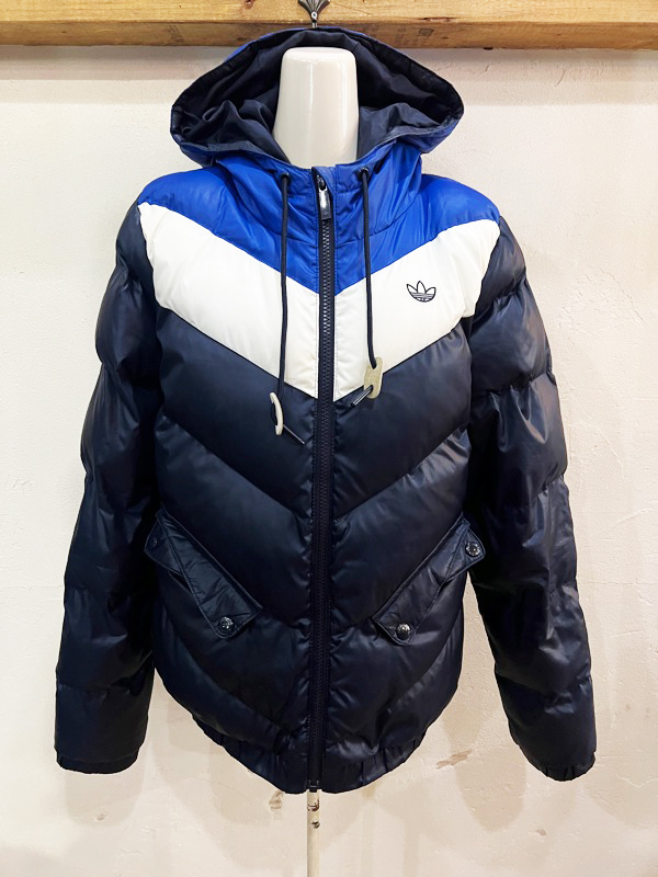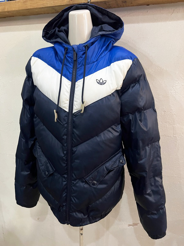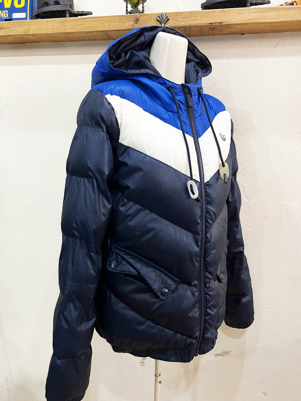 F10★adidas/アディダス ブロックカラー切り替えフード付き中綿ジャケット ブルゾン ネイビー×ブルー系 レディース Lサイズ相当★