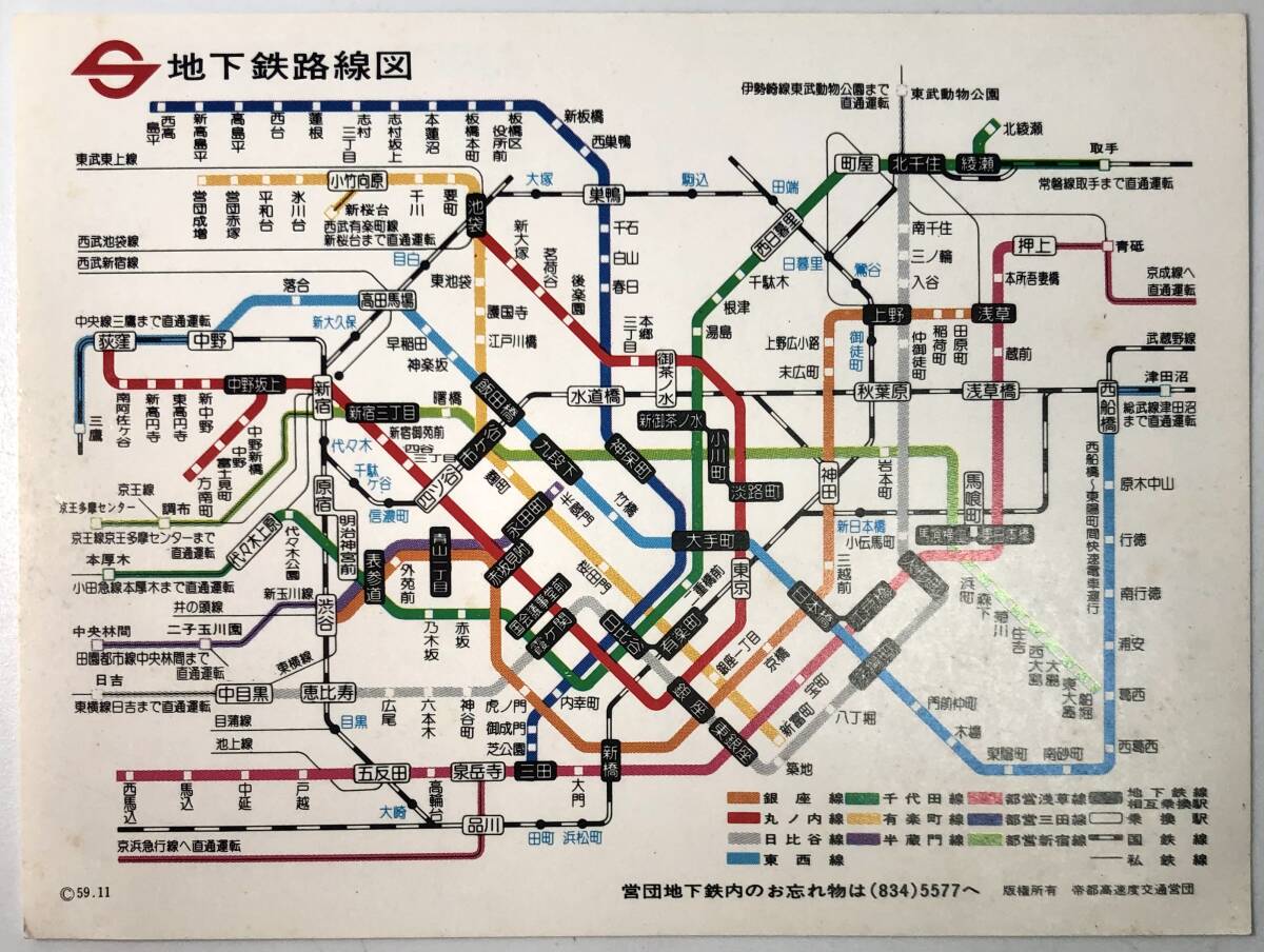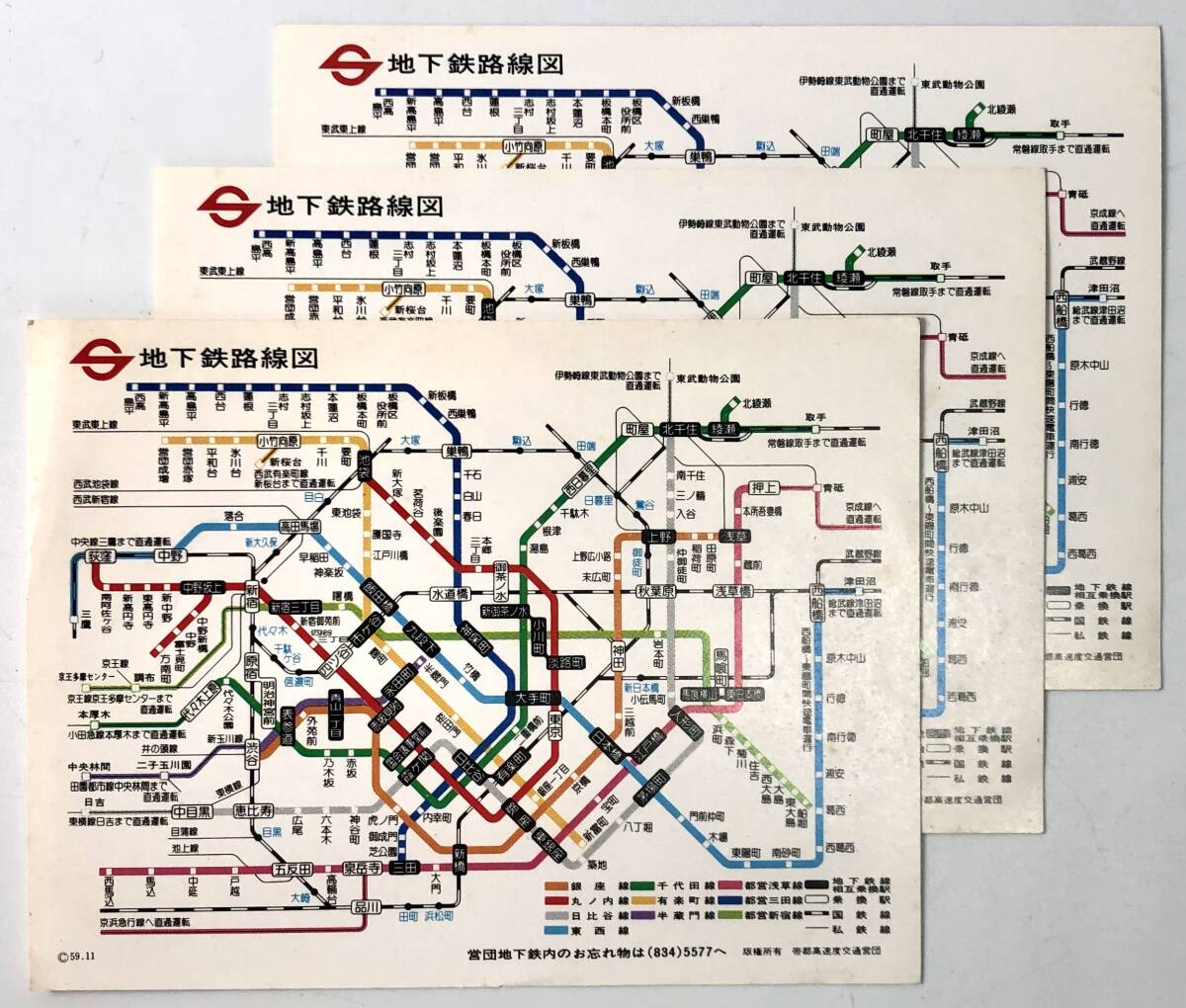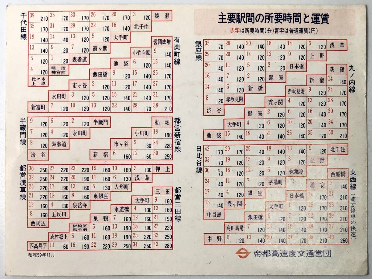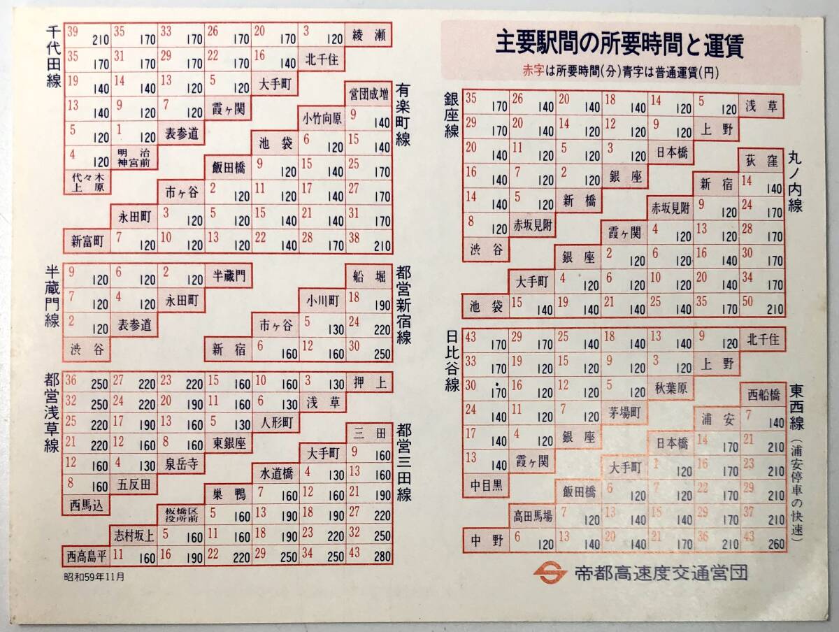 帝都高速度交通営団 地下鉄線路図3枚(1/営団地下鉄/昭和59年11月/1984年/主要駅間の所要時間と運賃/レトロ/JUNK)