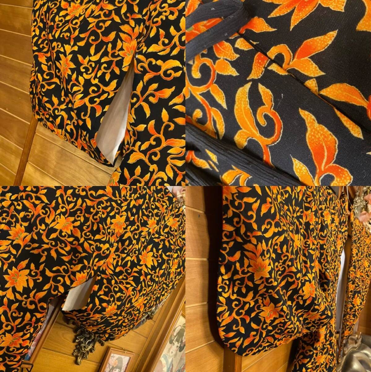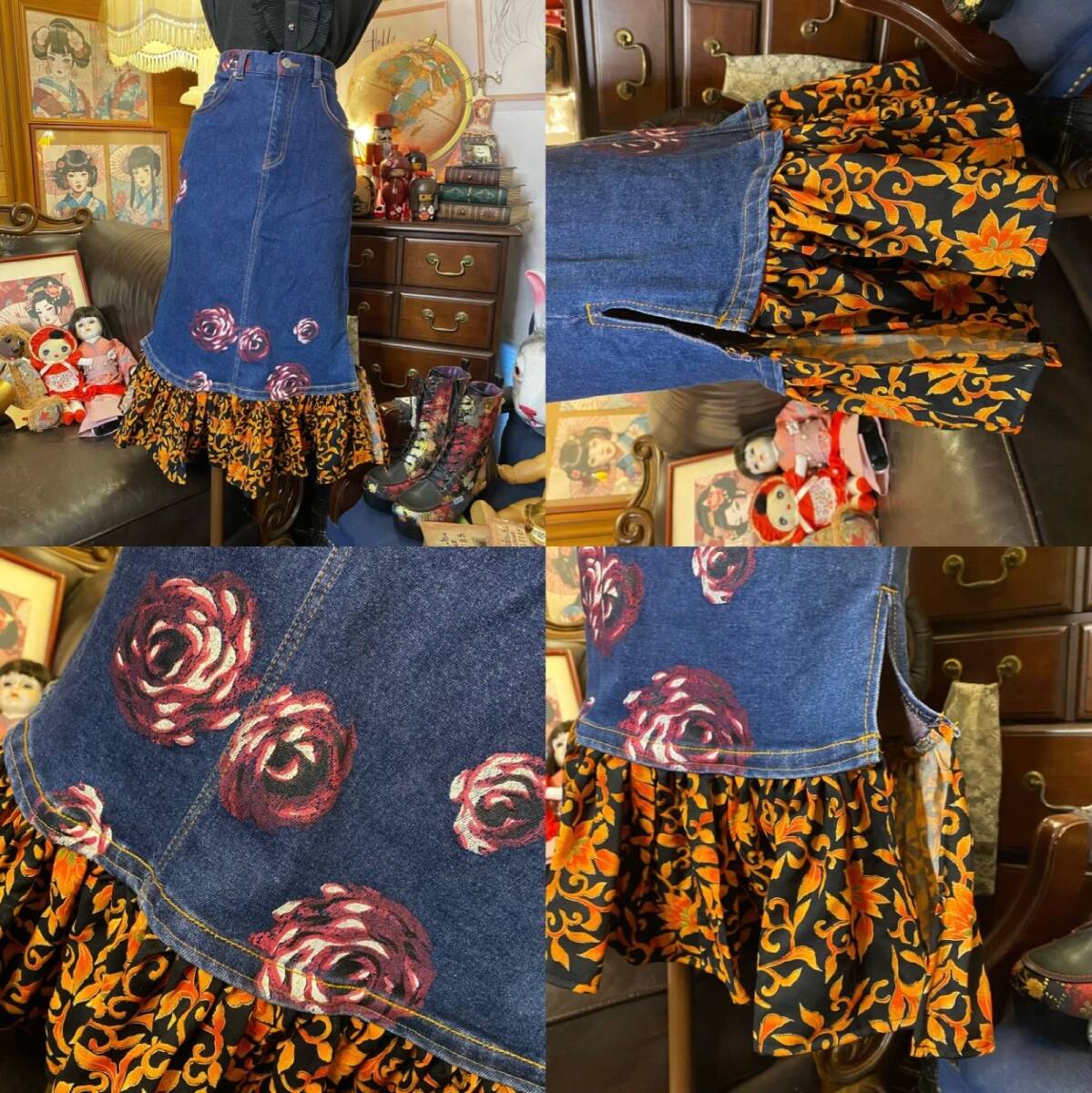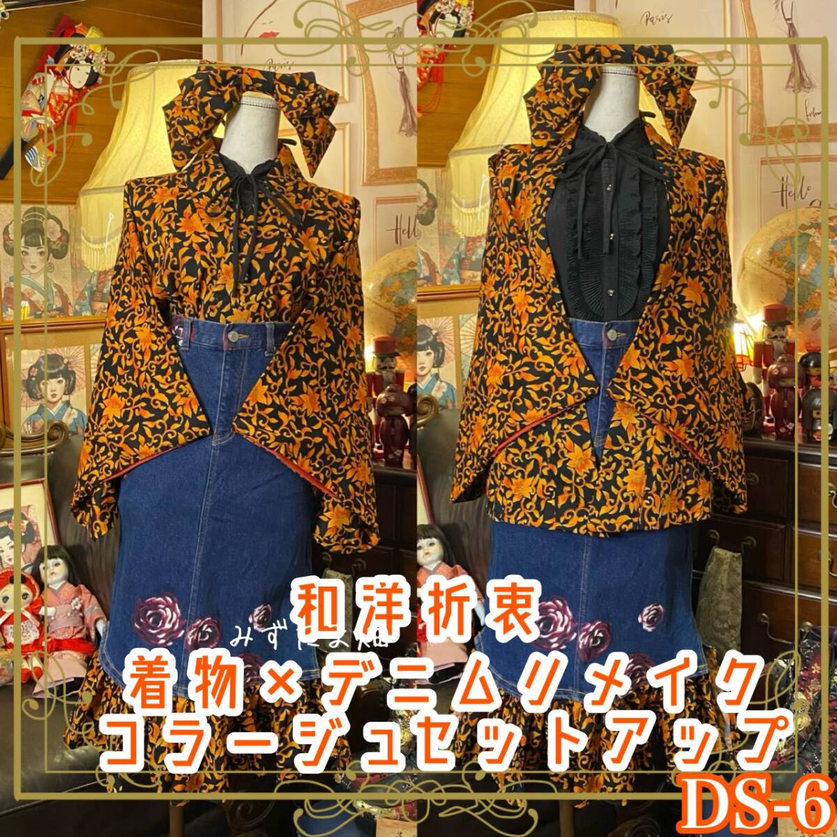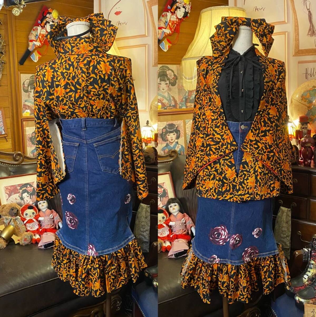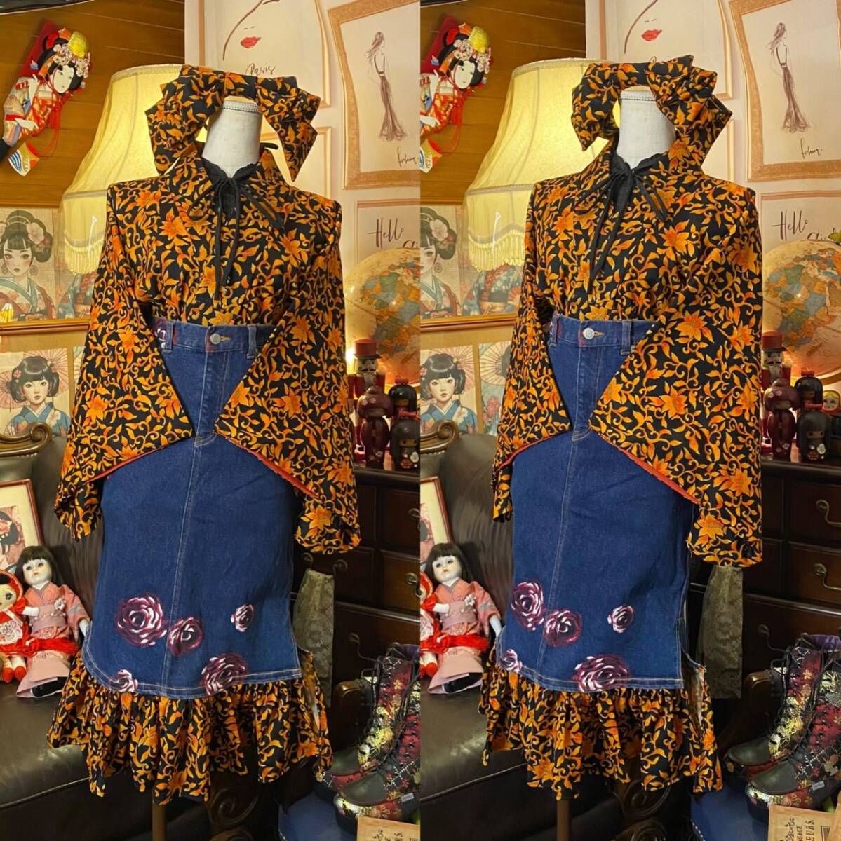 【 着物 デニム リメイク セットアップ ツーピース 2部式 コラージュ パッチワーク 刺繍 レトロ 古着 和洋折衷 ハンドメイド 唐草模様×薔薇×素敵なオレンジと黒のコントラスト DS-6 】