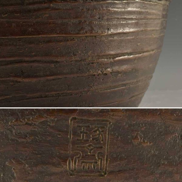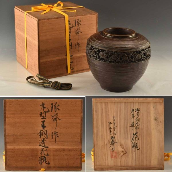 C07241 本間琢斎 斑紫銅丸形唐草透し花瓶:真作