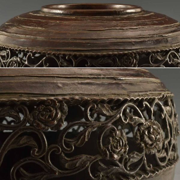 C07241 本間琢斎 斑紫銅丸形唐草透し花瓶:真作。
