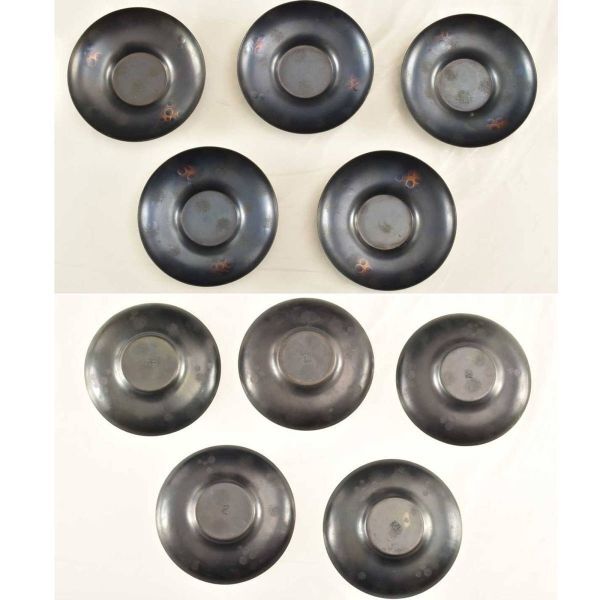 状態:各小擦れ少々あり。1枚に緑青少々あり。他、大体良好。各底に刻印「玉川堂」とあり。箱に虫食い、箱蓋に反れあり。