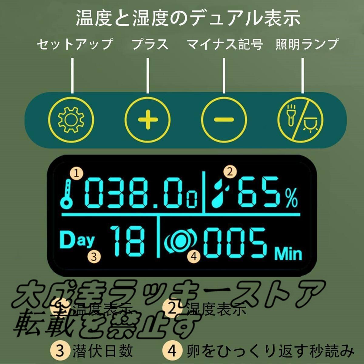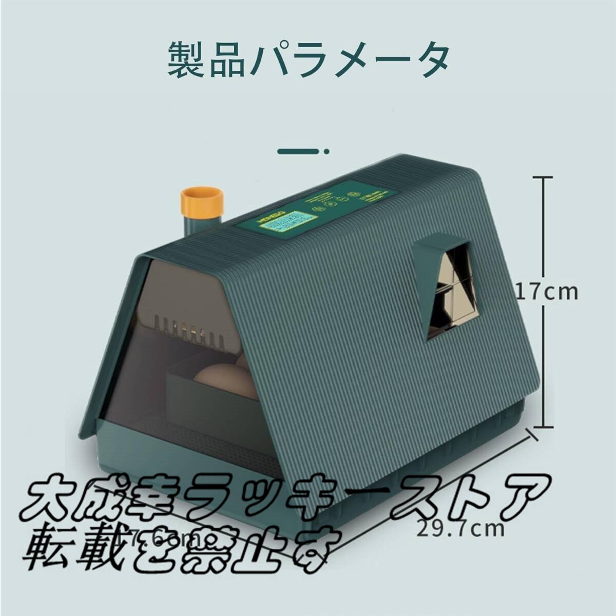 【製品仕様】自動孵卵器サイズは29.7*17.6*17CM、重量は1.23kgです。 電圧は110V、温度調節範囲は20℃?40℃で、卵は10個まで入ります。 多機能で調節可能な卵トレイ。 さまざまな種類の卵を孵化させる。