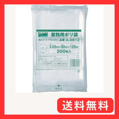 「TRUSCO(トラスコ) 小型ポリ袋 縦120×横80×t0.05 透明 200枚入 A-0812」▼4989999382693▼(商品説明)・透明 120×80×0.05 A0812・色:透明 縦(mm):120 横(mm):80・厚み:0.05mm・ポリエチレン(PE)説明 中身がよく見える透明タイプです。 非塩ビ素材を使用し、焼却時ダイオキシン、塩素ガスが発生しません。 部品などの保管、管理。