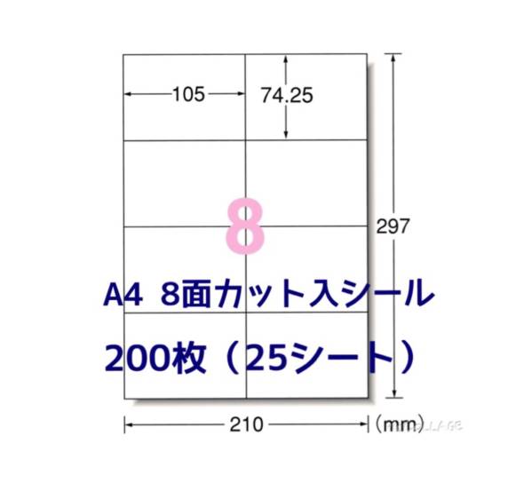 A4サイズ 8面カット入り、ラベルサイズ105mm×74.25mm。はがし易い楽貼加工のシールで宛名シールに最適です。