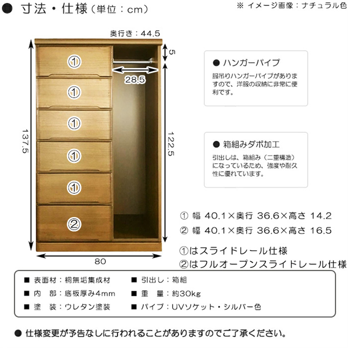 特  徴桐無垢集成材を使った、国産6段ハンガーチェスト