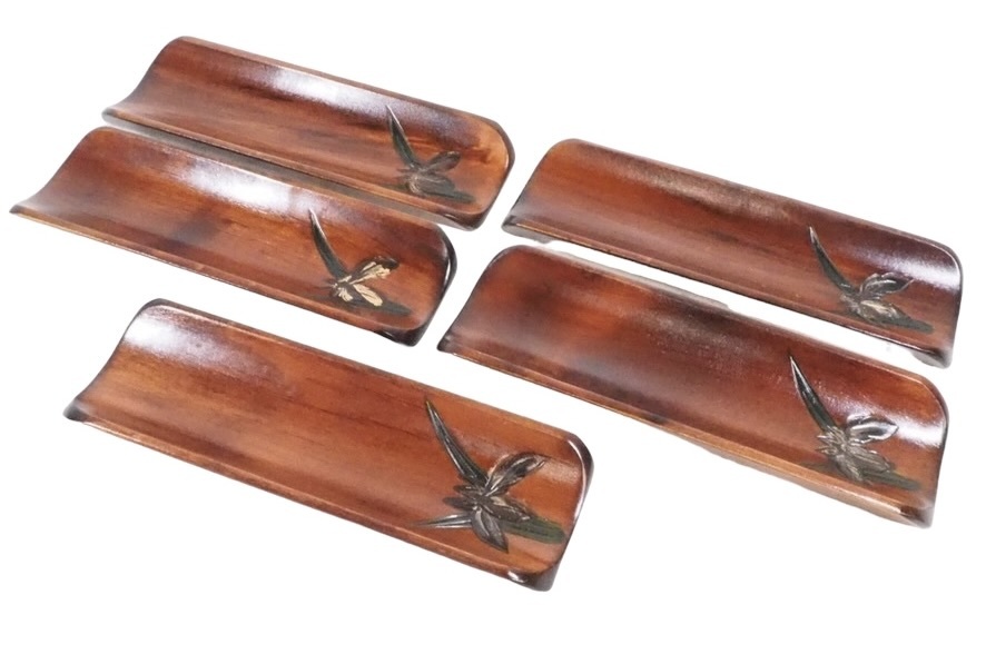 昭和ビンテージ 天然木製漆器 あやめ彫おしぼり置き 五枚セット 共箱付 TEF609