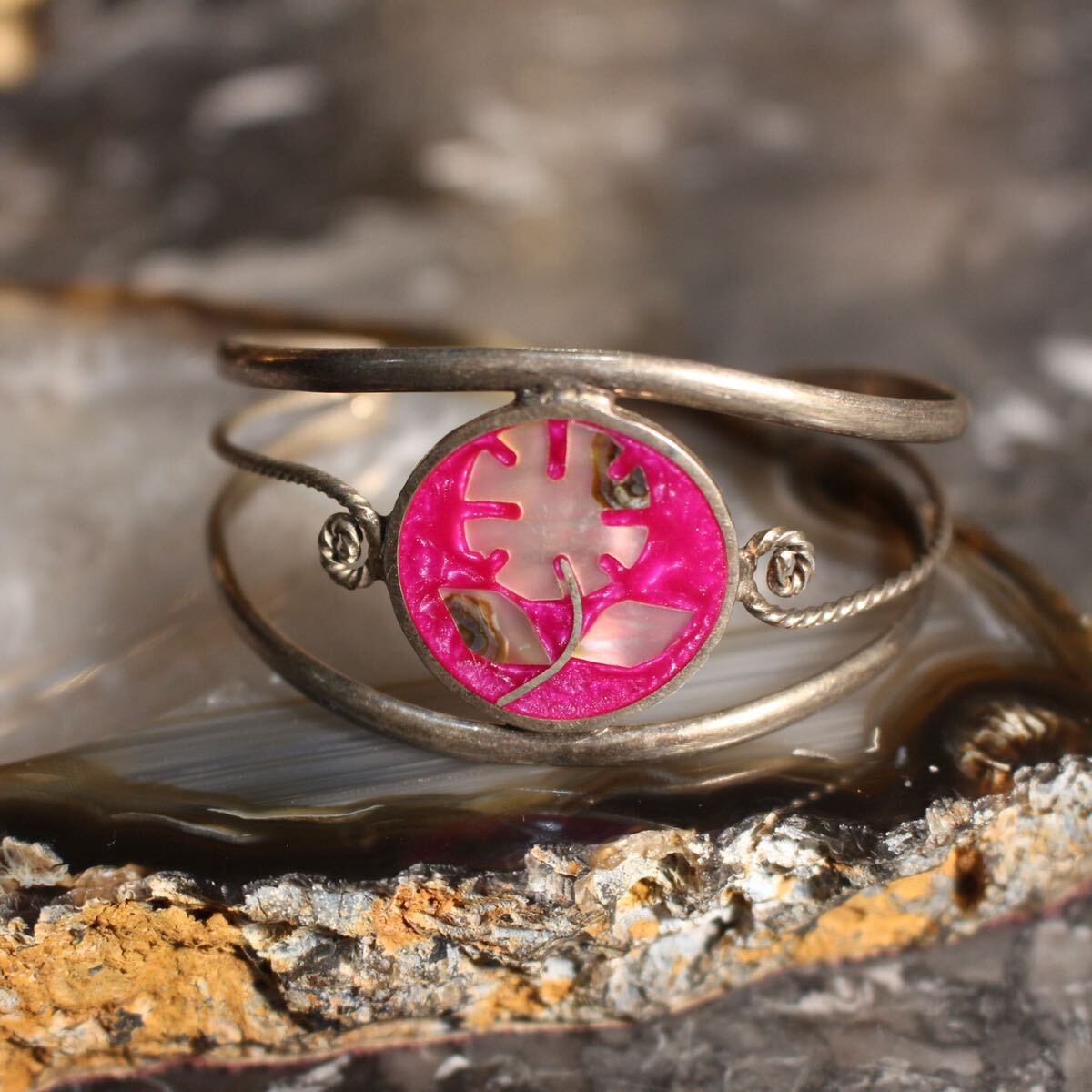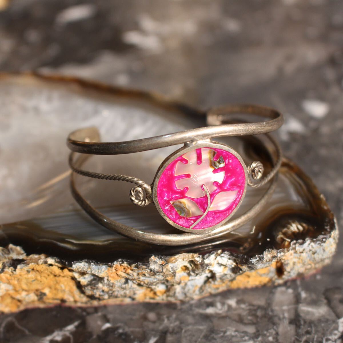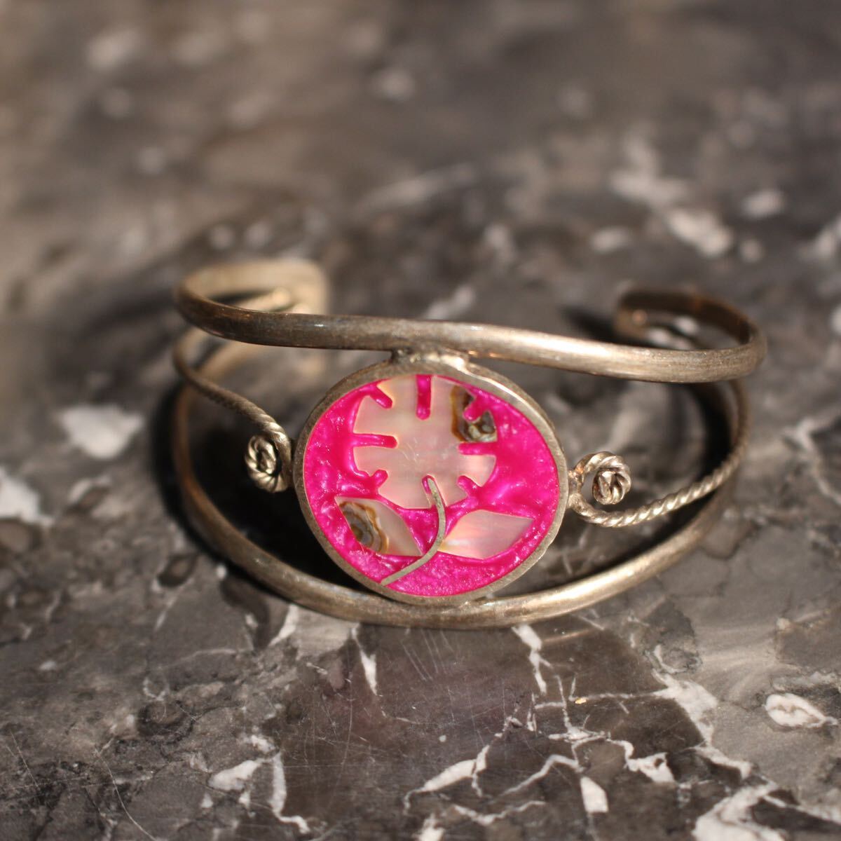 USA VINTAGE FLOWER STONE INLAY DESIGN BANGLEアメリカ古着お花ストーンインレイデザインバングル