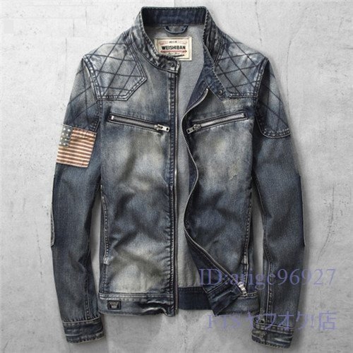 S948☆新品メンズ 立衿デニムジャケット 国旗柄 スリム ダメージ加工 ジージャン 刺繍 おしゃれ M~5XL