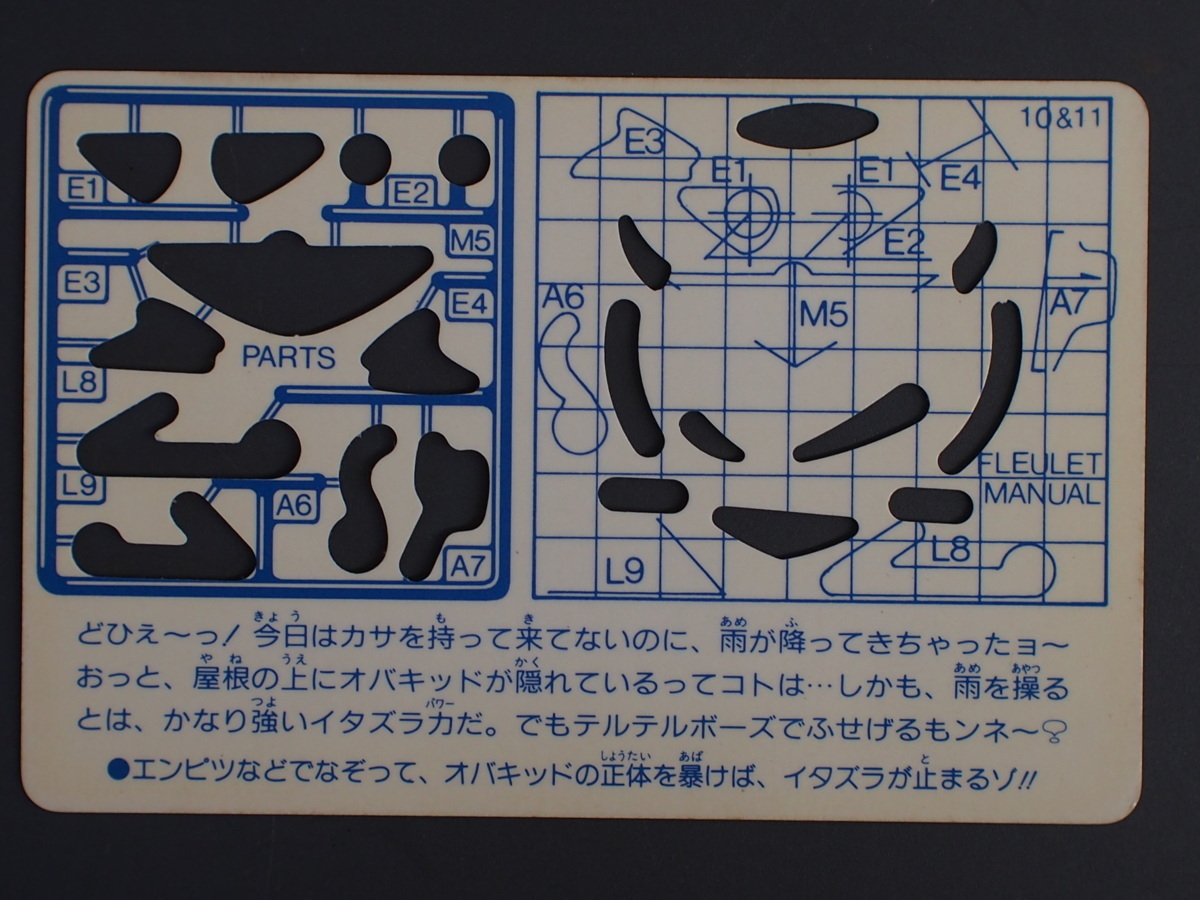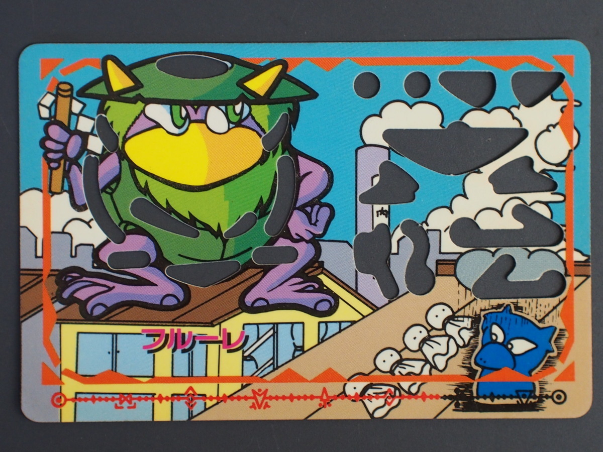 | 商品説明・コメント | 超マイナーカード、カネボウ食品の君はオバキッドをみたか?!のカードです。 「君のまわりにオバキッドはひそんでる。」のキャッチフレーズでカネボウ食品から発売された妙なカードです。 最近、身のまわりにおかしなことがよく起こっているキミ、それは、オバキッドのイタズラのせいなんだ。 彼らの正体を見つけ出し、イタズラをやめさせて、楽しくいこうぜ!! と言った触れ込みでカードの空洞を鉛筆等でなぞるとオバキッドの正体が暴けてイタズラが止まるとの実にくだらないカードでは御座いましたが流石に不人気で実存数も減ってきたカードです。 出品物は前述の通り、穴をなぞりオバキッドの正体を暴いた跡は御座いませんのでご安心下さいませ。 カードブームの中の最後発のカードに位置し一部では人気でしたがコレクションカードとしての知名度は低く、現存数は中々残っていないのが現状のマイナーカードです。 依って必然的にコンプリートがかなり困難なカードシリーズでもあります。 当時物なので状態は年式相応にはなりますがコレクションして頂くには充分だと思われます。 前述の通り、現存も少なくなり中々市場に現れる事が無くなって来ましたのでマニア必見です。 商品の仕様の詳しくは御自身でお調べ頂きます様にお願い致します。 古いカードになりますので全てに於いてオリジナルを保証する物では御座いません。 状態に尽きましては写真にて御確認頂けます様御願い致します。 写真では御確認頂けない不具合等もある前提で原則ジャンク扱いにて御考慮下さい。 上記の通り、原則瑕疵担保責任はお受け致しませんので御了承下さいます様御願い致します。 上記の条件を御理解頂けない方の入札はお断り致します。 |