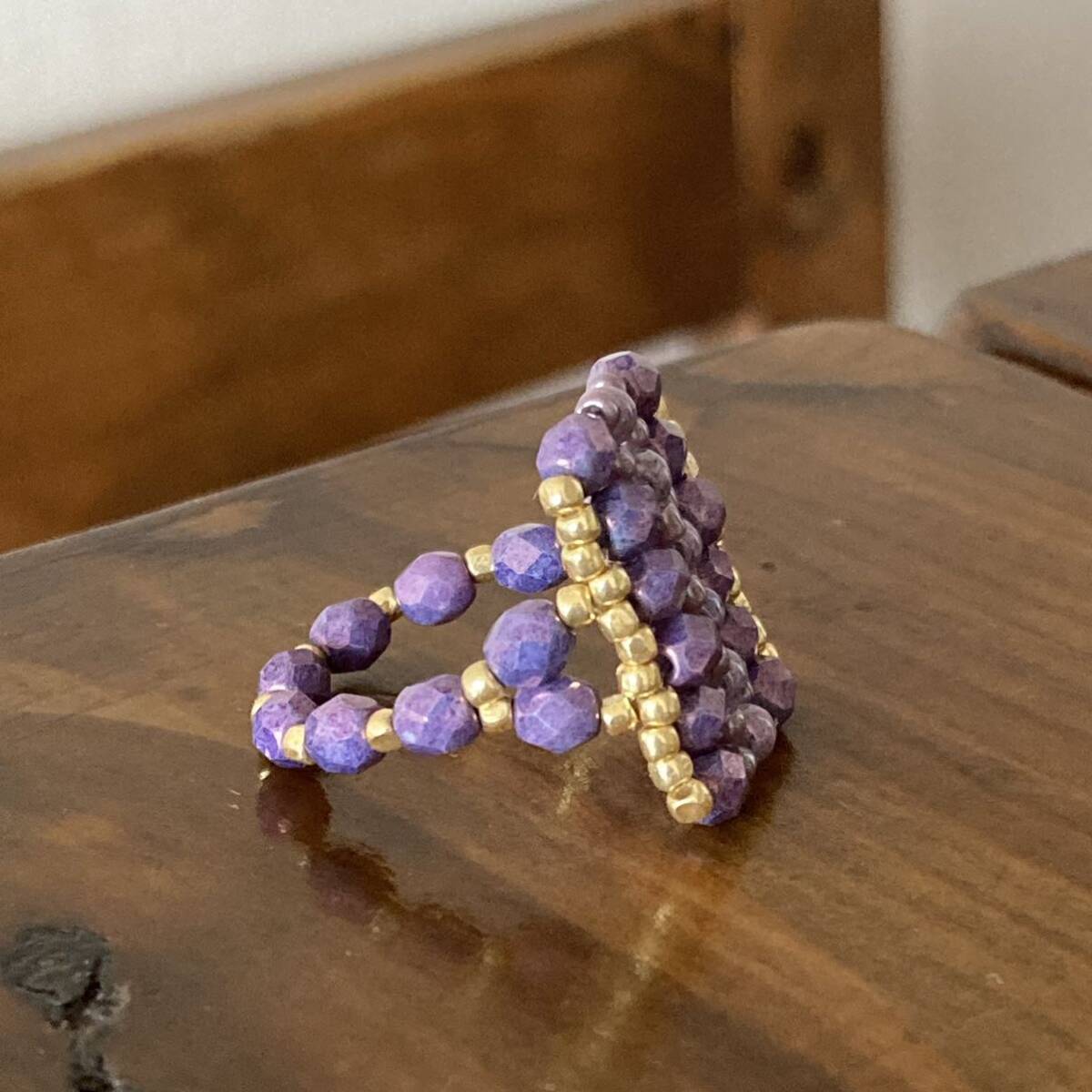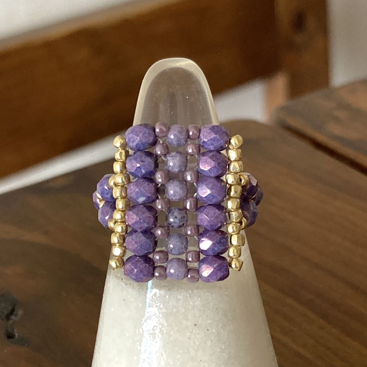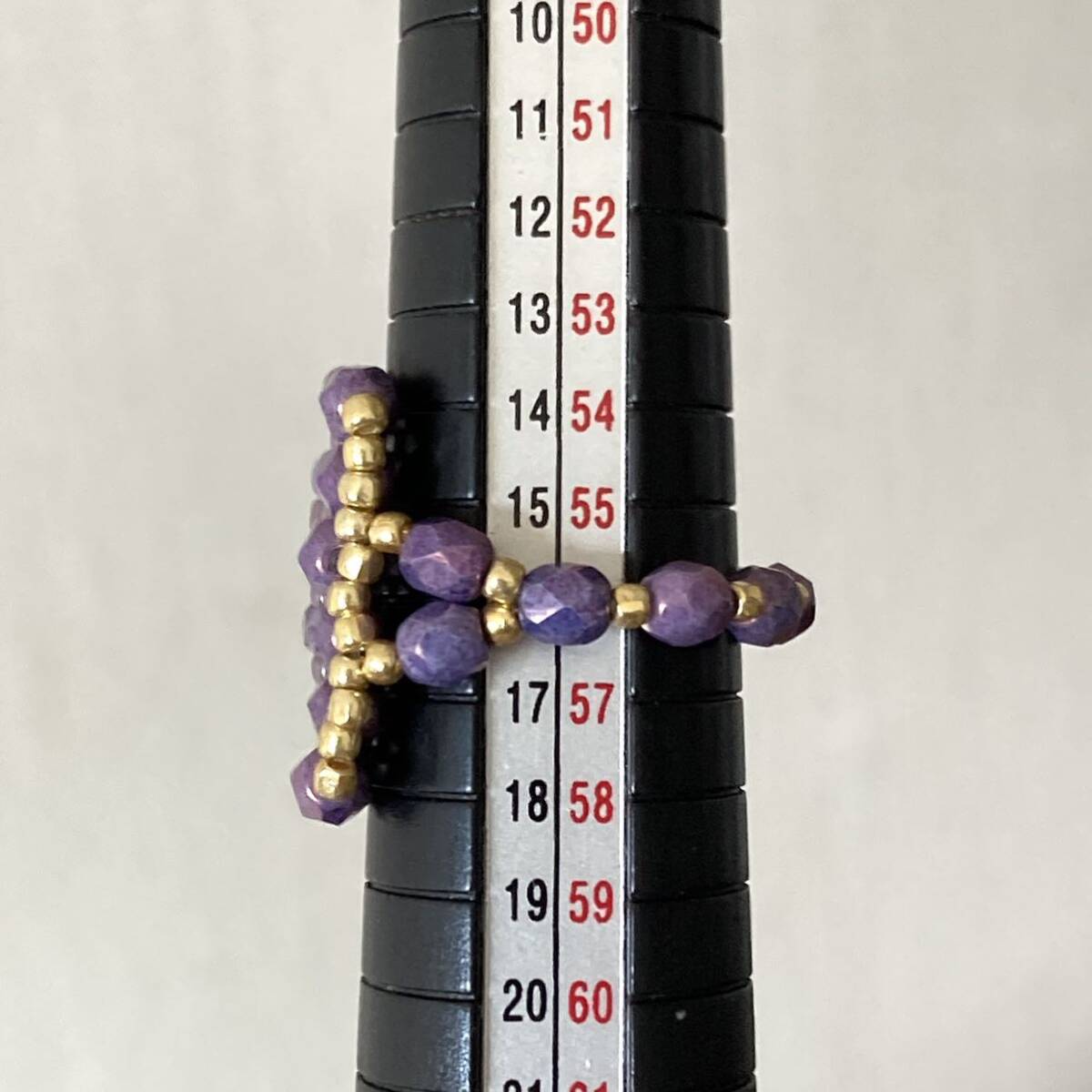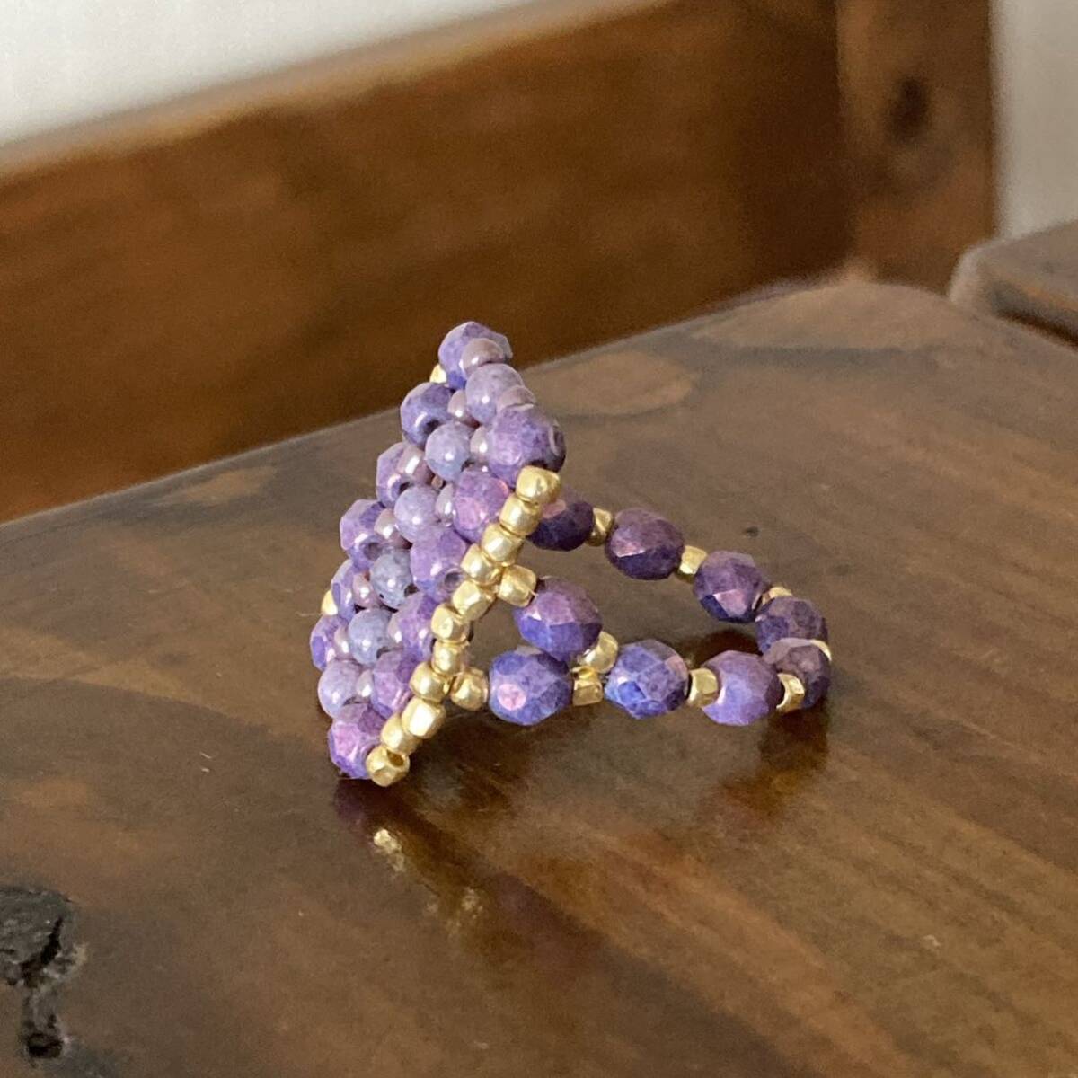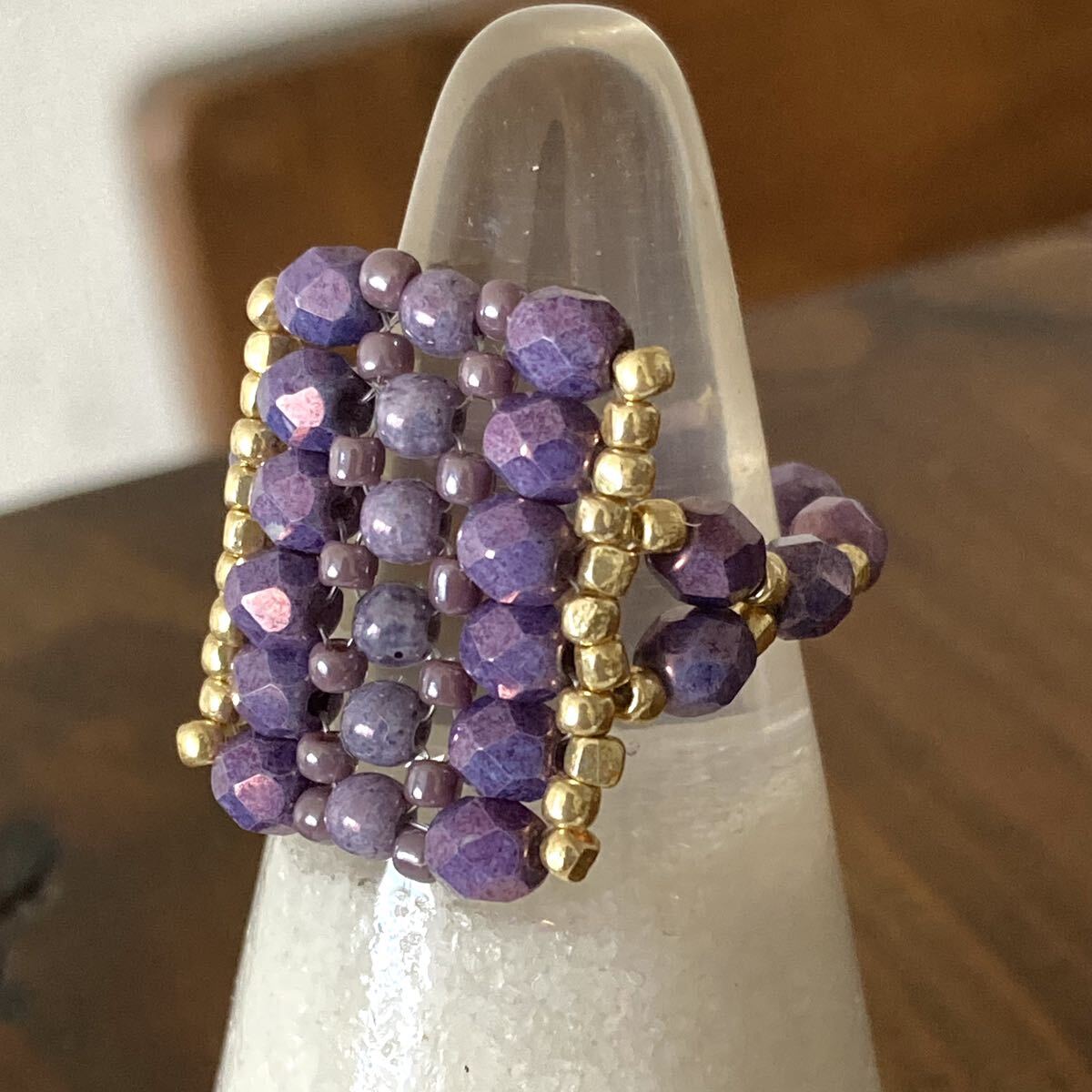 4mmのパープルのチェコビーズ、3mmのパープルのラウンドチェコビーズ、ゴールドのスリーカットビーズ等で作ったリングです。