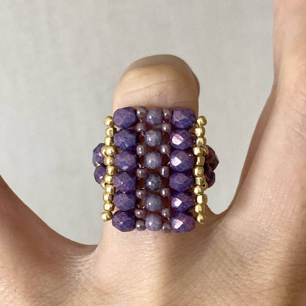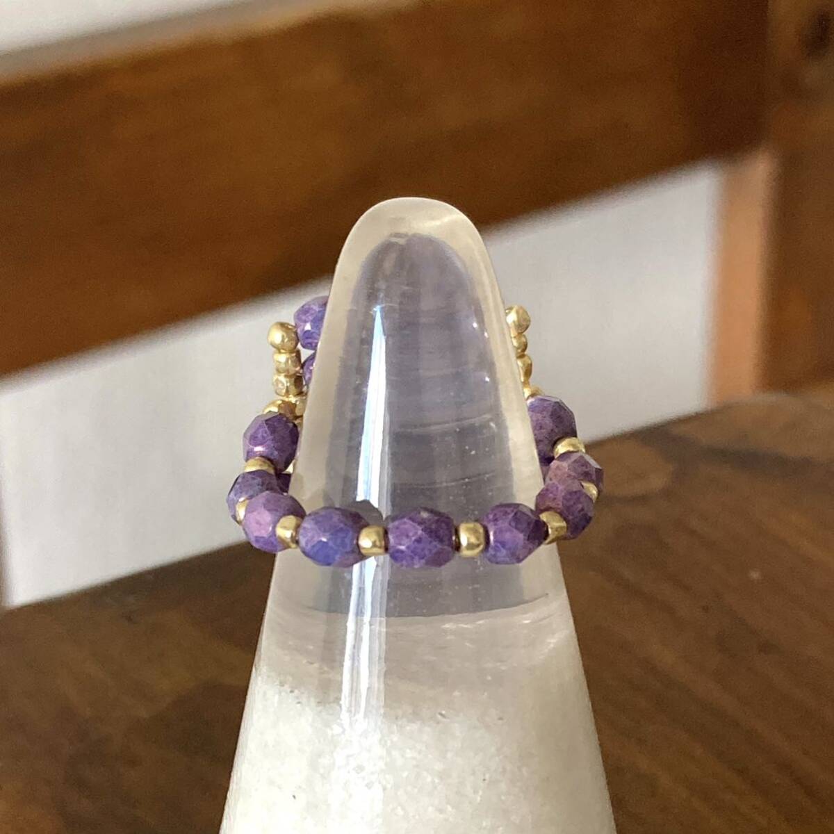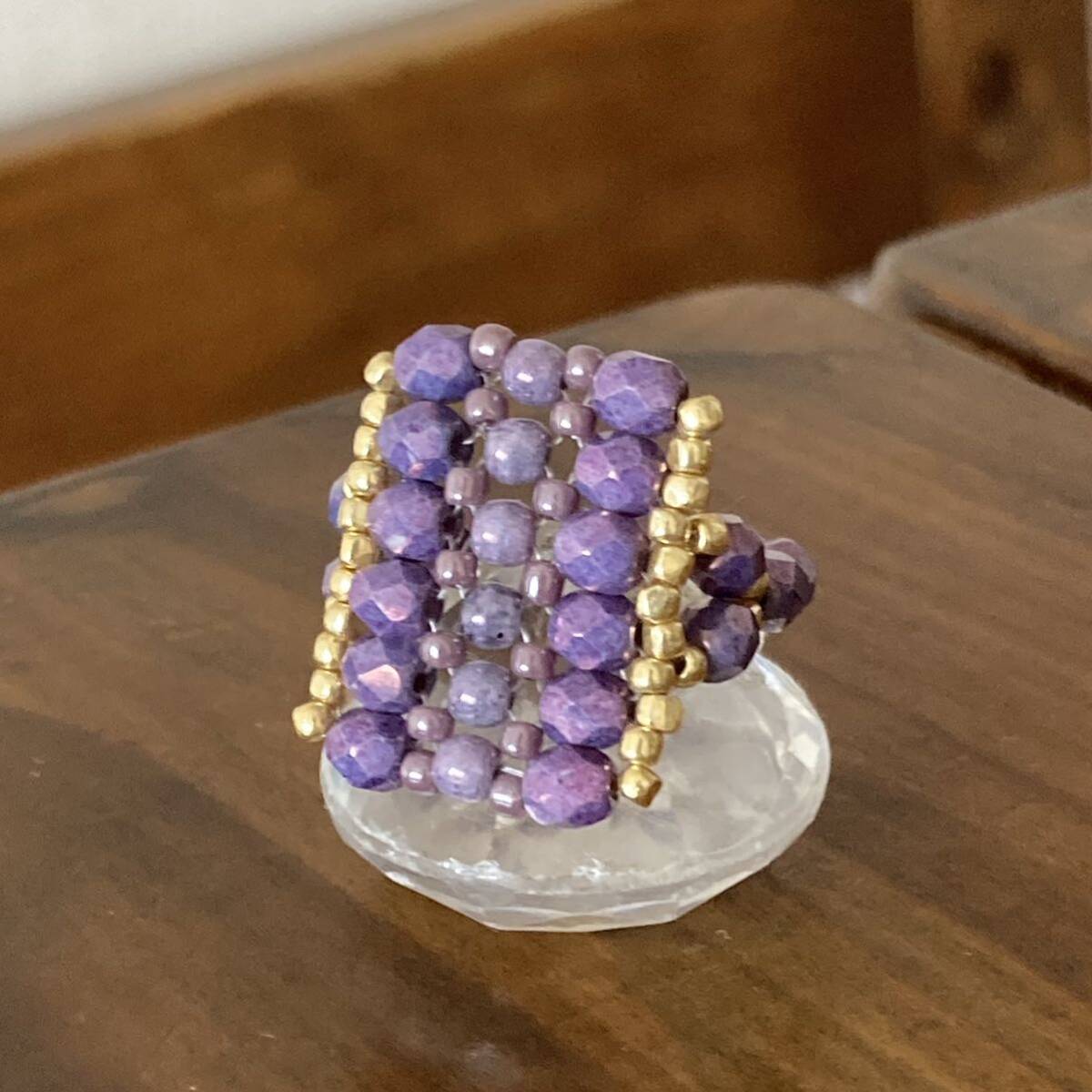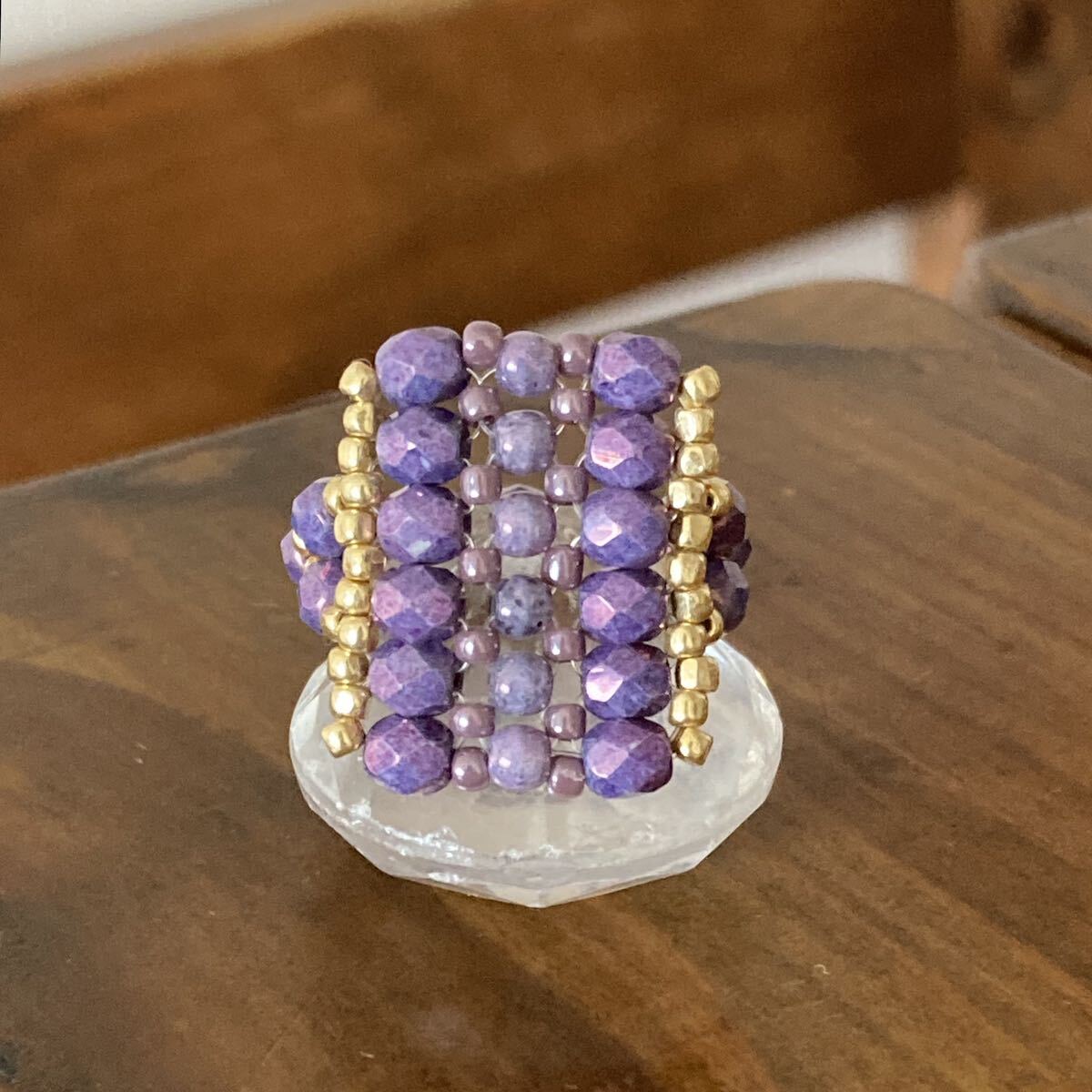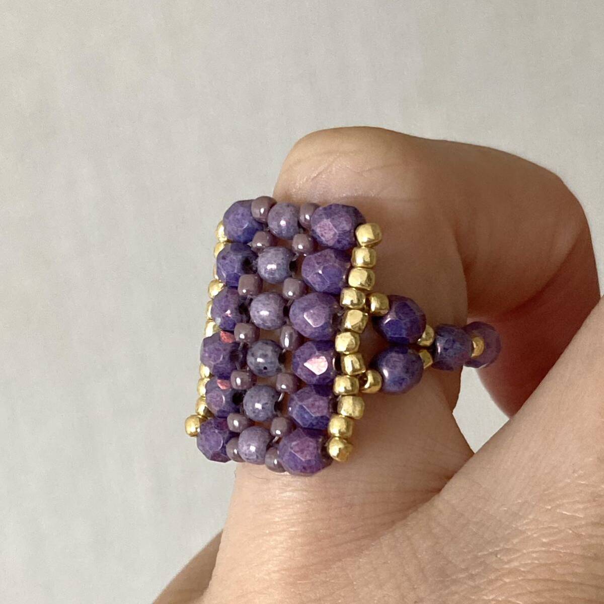 4mmのパープルのチェコビーズ、3mmのパープルのラウンドチェコビーズ、ゴールドのスリーカットビーズ等で作ったリングです。