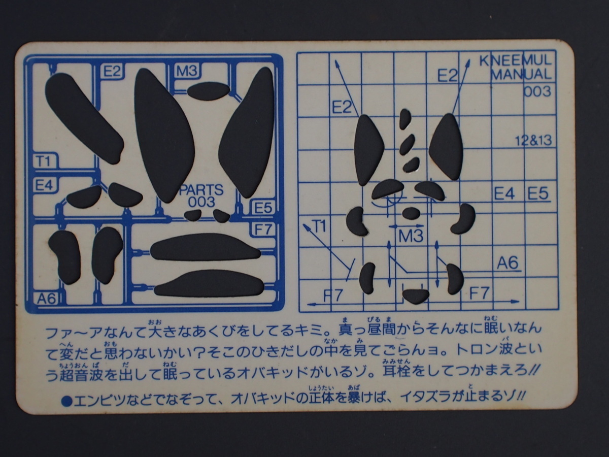| 商品説明・コメント | 超マイナーカード、カネボウ食品の君はオバキッドをみたか?!のカードです。 「君のまわりにオバキッドはひそんでる。」のキャッチフレーズでカネボウ食品から発売された妙なカードです。 最近、身のまわりにおかしなことがよく起こっているキミ、それは、オバキッドのイタズラのせいなんだ。 彼らの正体を見つけ出し、イタズラをやめさせて、楽しくいこうぜ!! と言った触れ込みでカードの空洞を鉛筆等でなぞるとオバキッドの正体が暴けてイタズラが止まるとの実にくだらないカードでは御座いましたが流石に不人気で実存数も減ってきたカードです。 出品物は前述の通り、穴をなぞりオバキッドの正体を暴いた跡は御座いませんのでご安心下さいませ。 カードブームの中の最後発のカードに位置し一部では人気でしたがコレクションカードとしての知名度は低く、現存数は中々残っていないのが現状のマイナーカードです。 依って必然的にコンプリートがかなり困難なカードシリーズでもあります。 当時物なので状態は年式相応にはなりますがコレクションして頂くには充分だと思われます。 前述の通り、現存も少なくなり中々市場に現れる事が無くなって来ましたのでマニア必見です。 商品の仕様の詳しくは御自身でお調べ頂きます様にお願い致します。 古いカードになりますので全てに於いてオリジナルを保証する物では御座いません。 状態に尽きましては写真にて御確認頂けます様御願い致します。 写真では御確認頂けない不具合等もある前提で原則ジャンク扱いにて御考慮下さい。 上記の通り、原則瑕疵担保責任はお受け致しませんので御了承下さいます様御願い致します。 上記の条件を御理解頂けない方の入札はお断り致します。 |