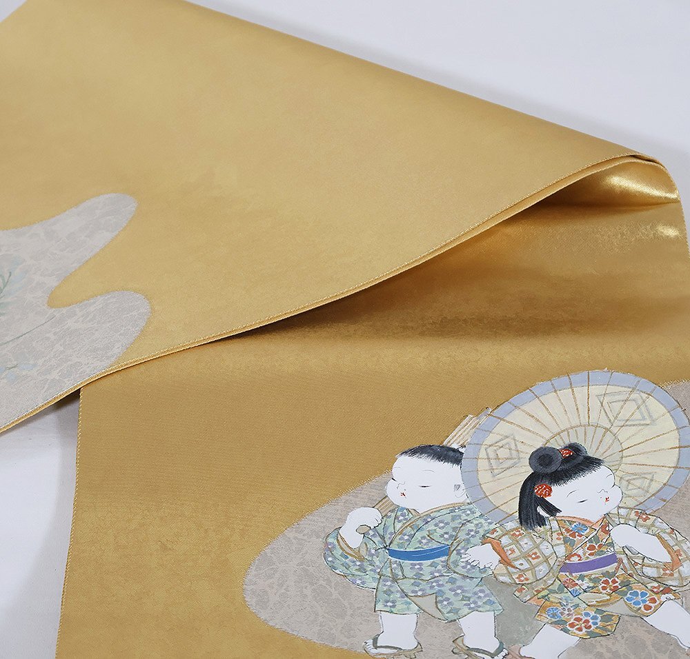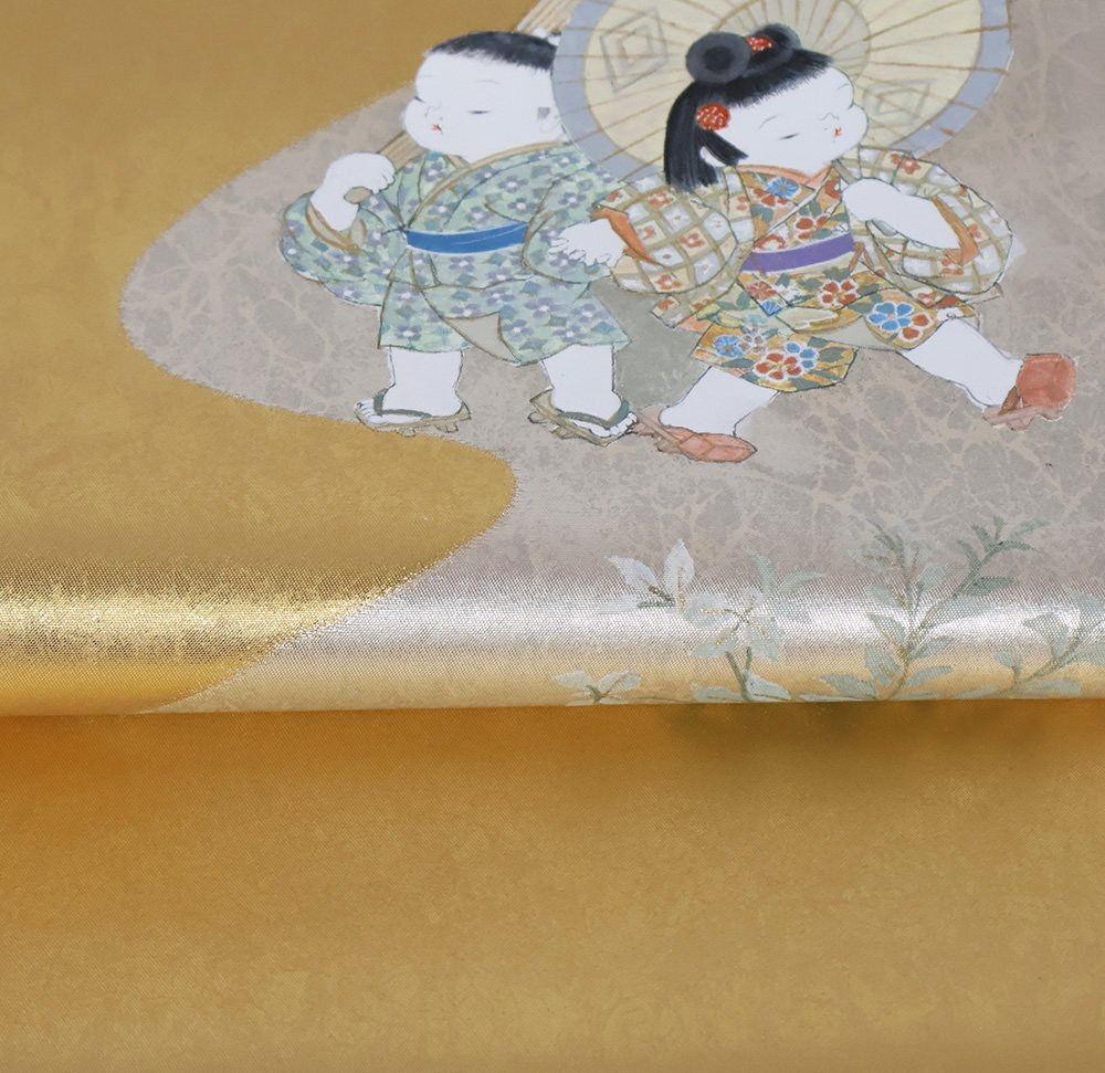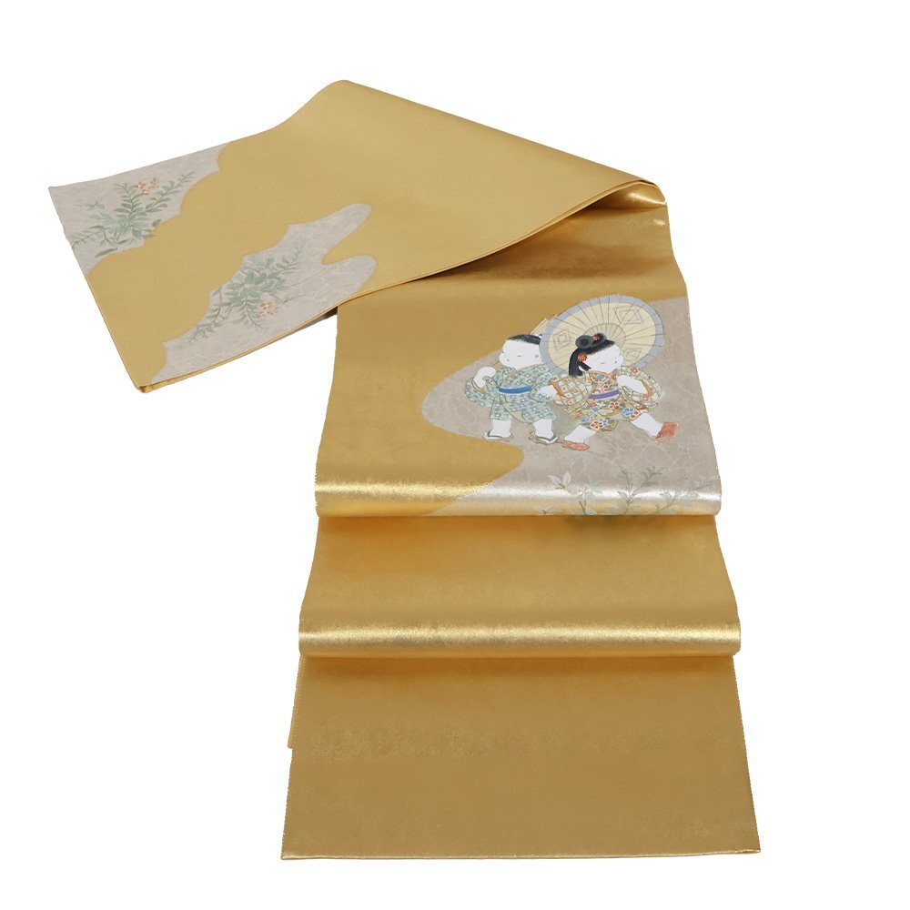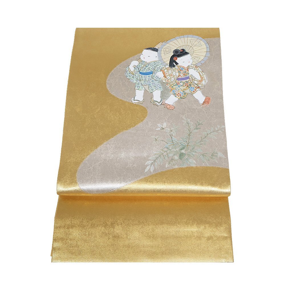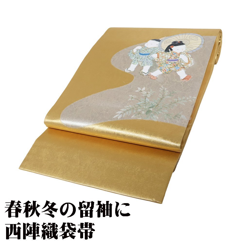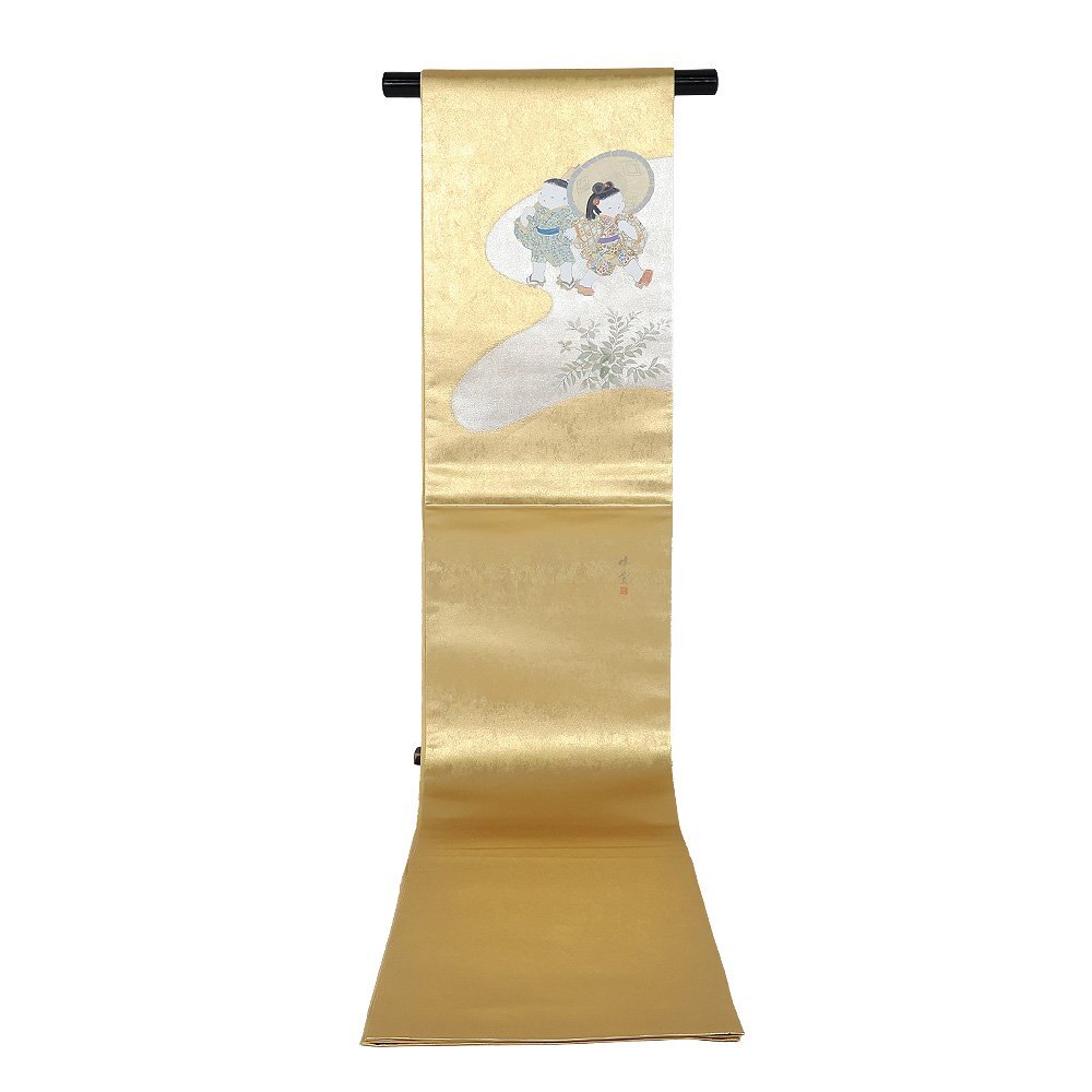 | 富田峰雲氏作 西陣織袋帯 金箔・銀箔地 童 作家落款入り 未使用品 仕立て上がり |