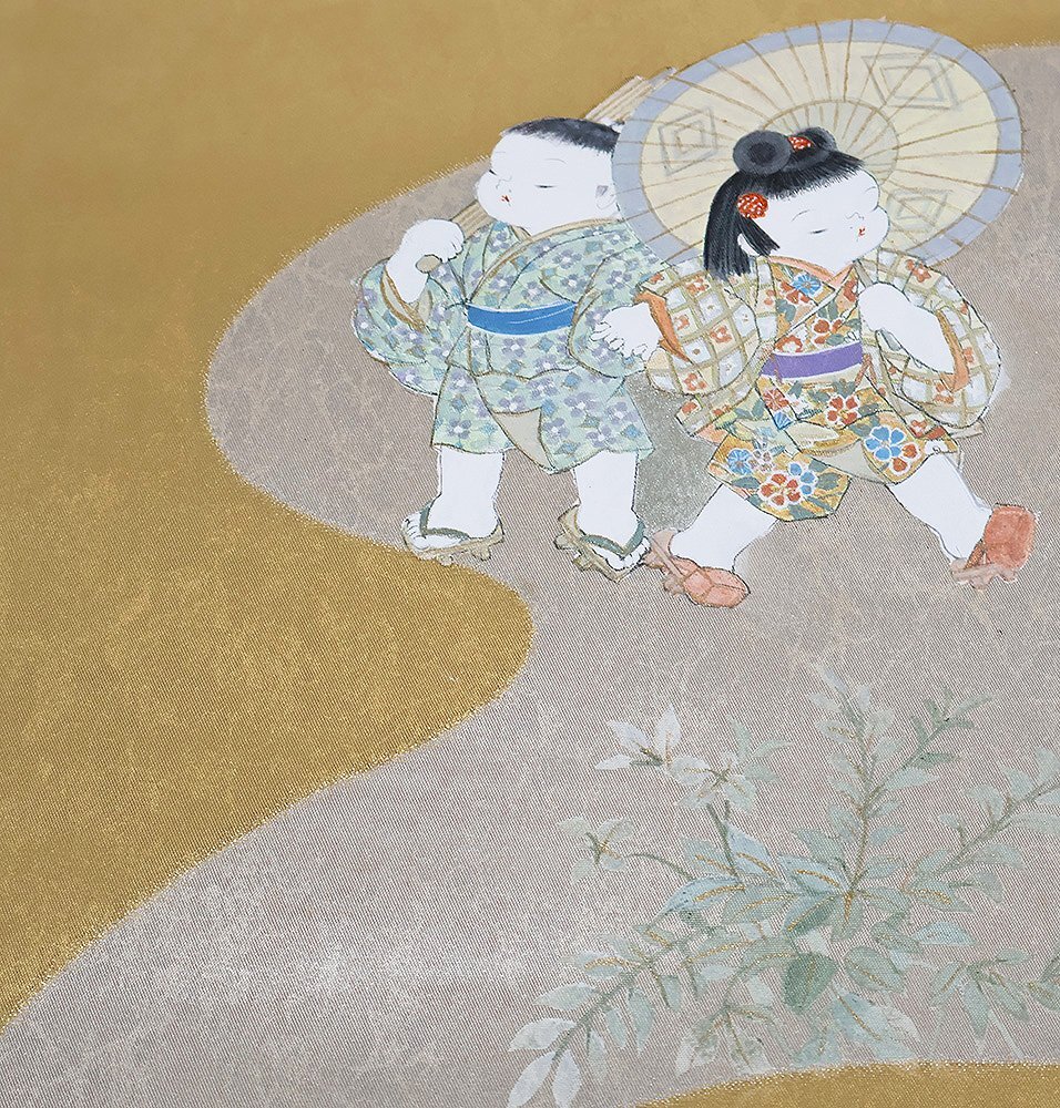 富田峰雲氏作 西陣織袋帯 金箔・銀箔地 童 (写真では上手く色が出ない場合があります。ご了承下さい) ※お使いのディスプレイの種類や設定の差により 実物の色と画像の色が少々異なることもございます。 写真の枚数が多いので一度パソコンでご覧ください。 |