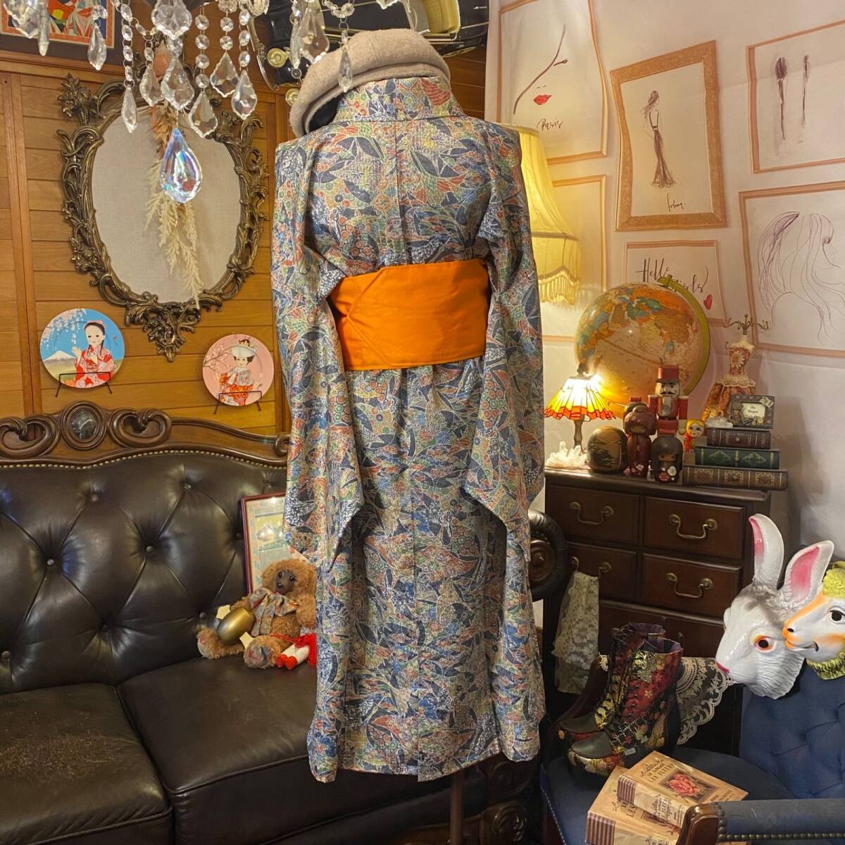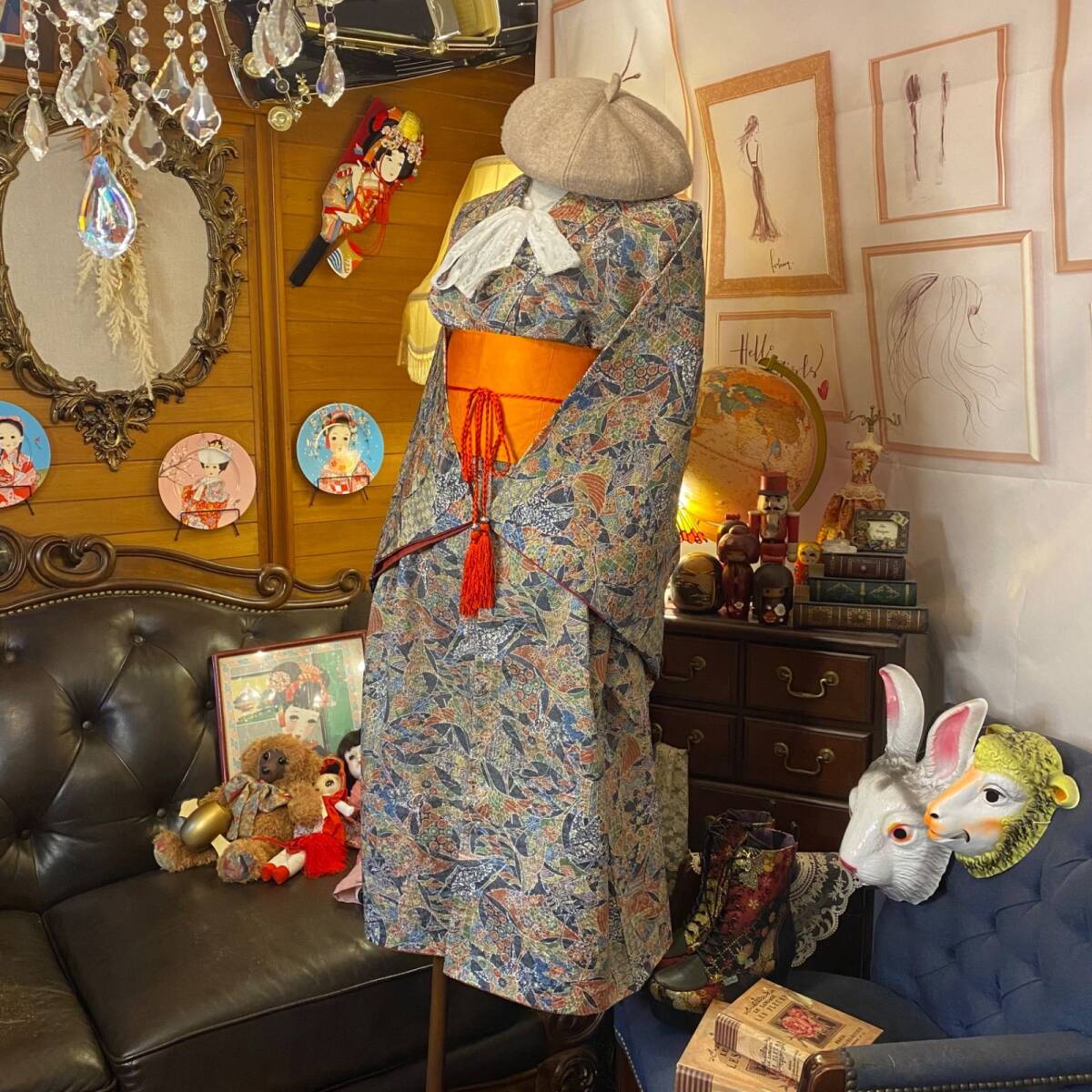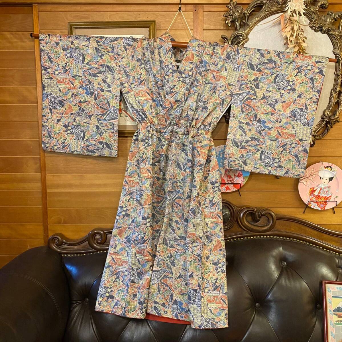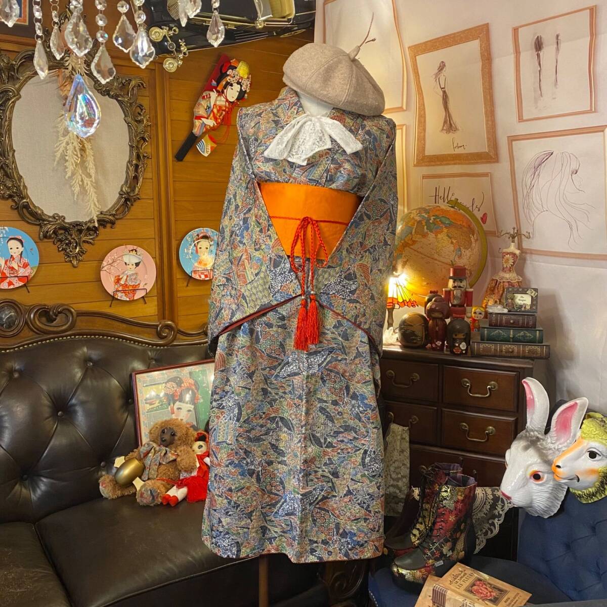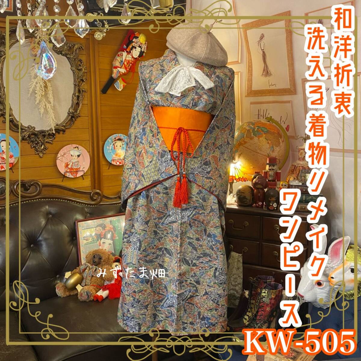【 和洋折衷 着物 リメイク ワンピース ドレス 洗える 化繊 帯サッシュベルト レトロ 古着 和 ハンドメイド 素敵な和柄 KW-505】