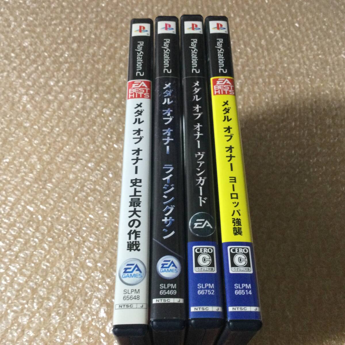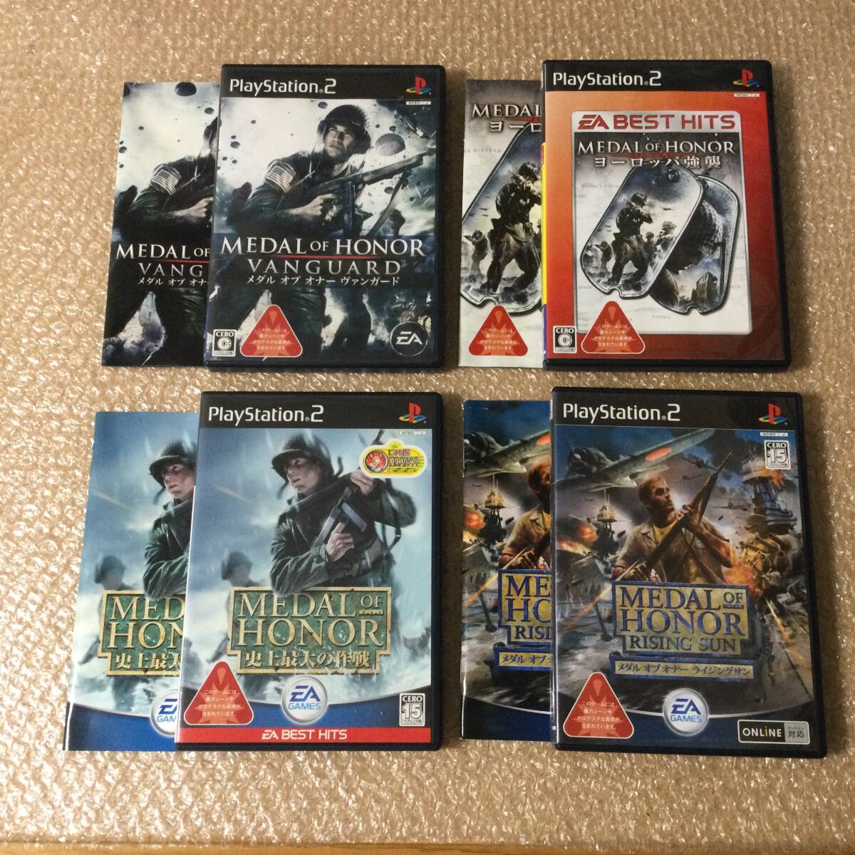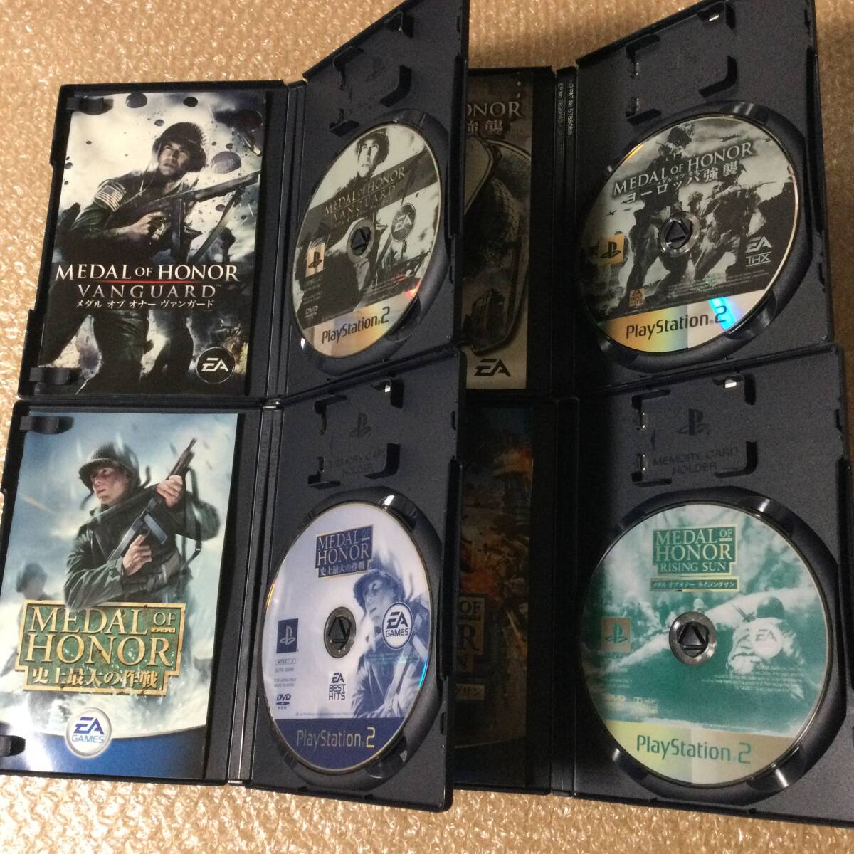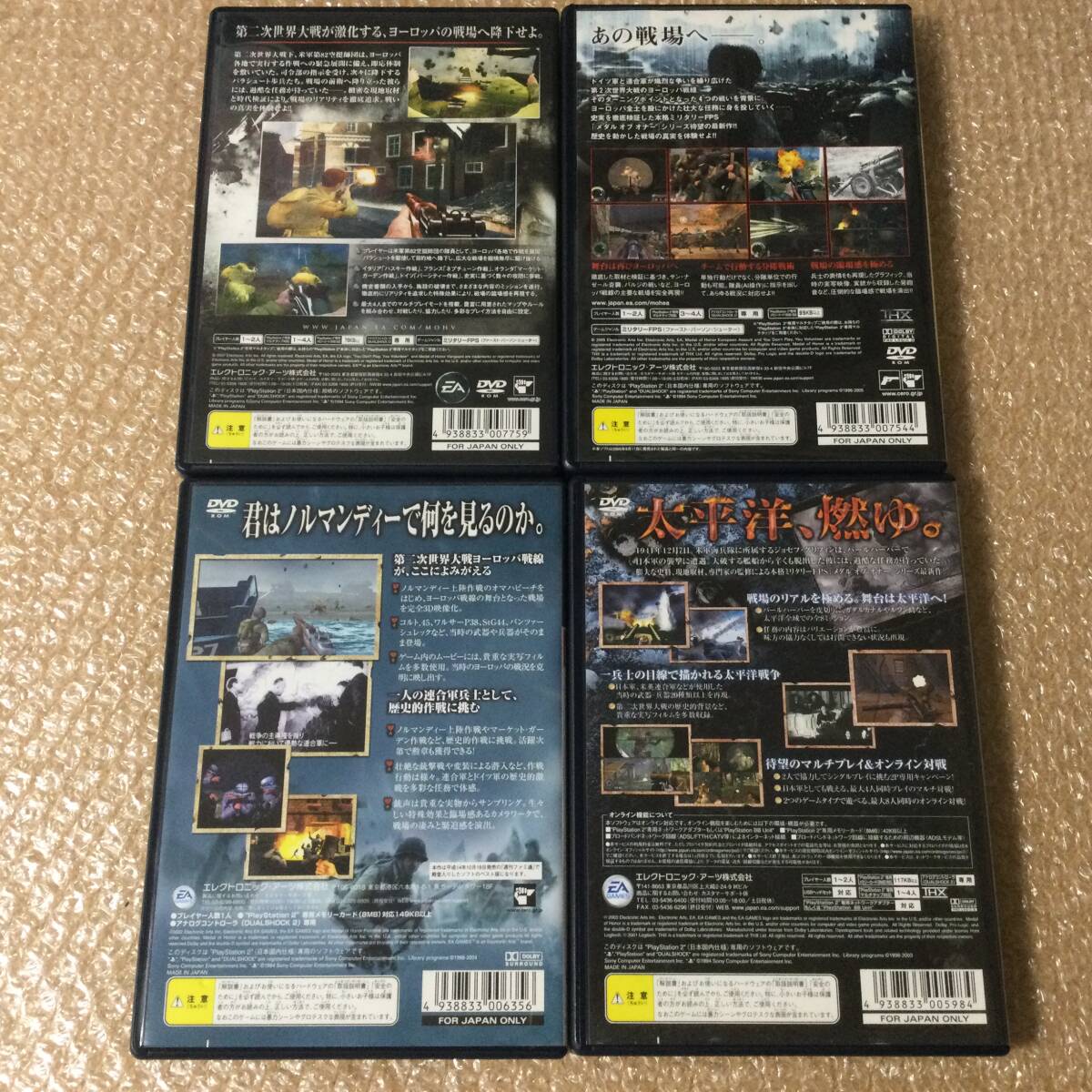 ○ 中古品、多少痛みキズあり。動作確認済みです!PS2で発売された人気作、メダルオブオナーのPS2版全4作コンプリートセットです!手に汗握る攻防戦仲間と共に歴史を体感せよ!「君はノルマンディーで何を見るのか。」「太平洋、燃ゆ。」「あの戦場へー。」「第二次世界大戦が激化する、ヨーロッパの戦場へ降下せよ。」ライジングサンから3本は2人プレイも可能ですよ!EA BEST HITSは、価格が改定され新しく販売され、パッケージが変更されただけで、ゲーム内容に変わりはありません。ご存じない方はご安心ください!(^ ^)コレクション整理のため出品しております。他出品物まとめてお取引可能です。欲しい方にお譲りできれば嬉しいです。(^ ^)