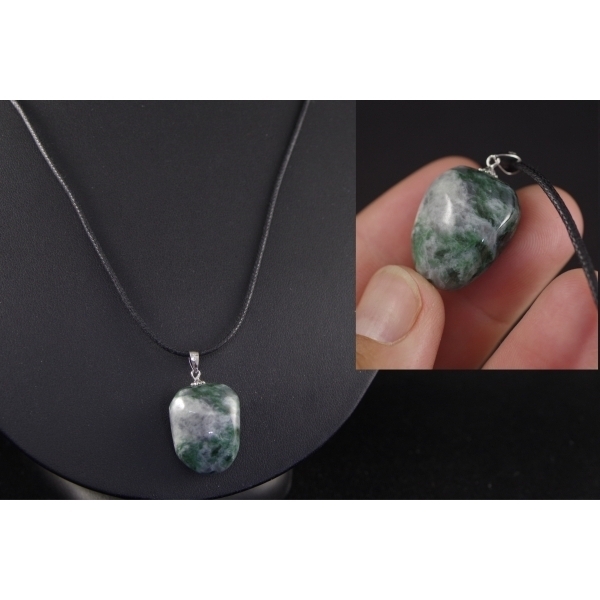 ラフな形に研磨し革ひも風の黒いワックスコードを通しております。