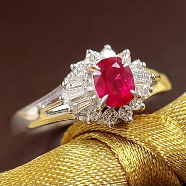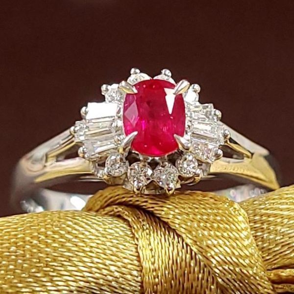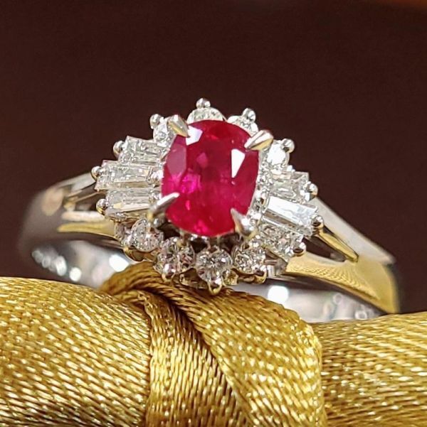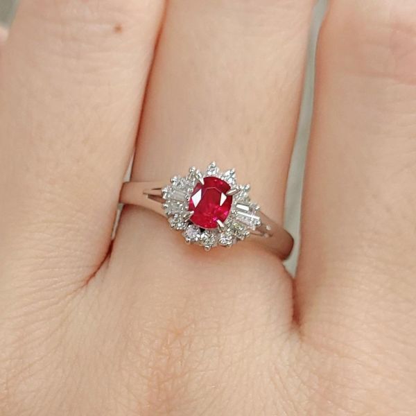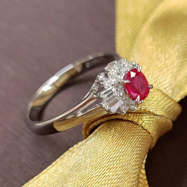 こちらは、0.44ctのルビーをラウンドとバケットカットダイヤモンドの取り巻く、クラシックなデザインです。