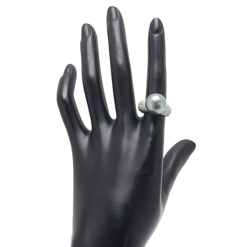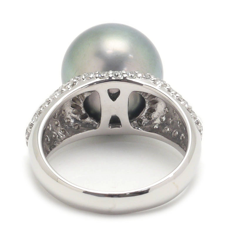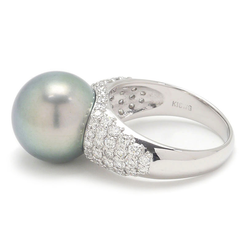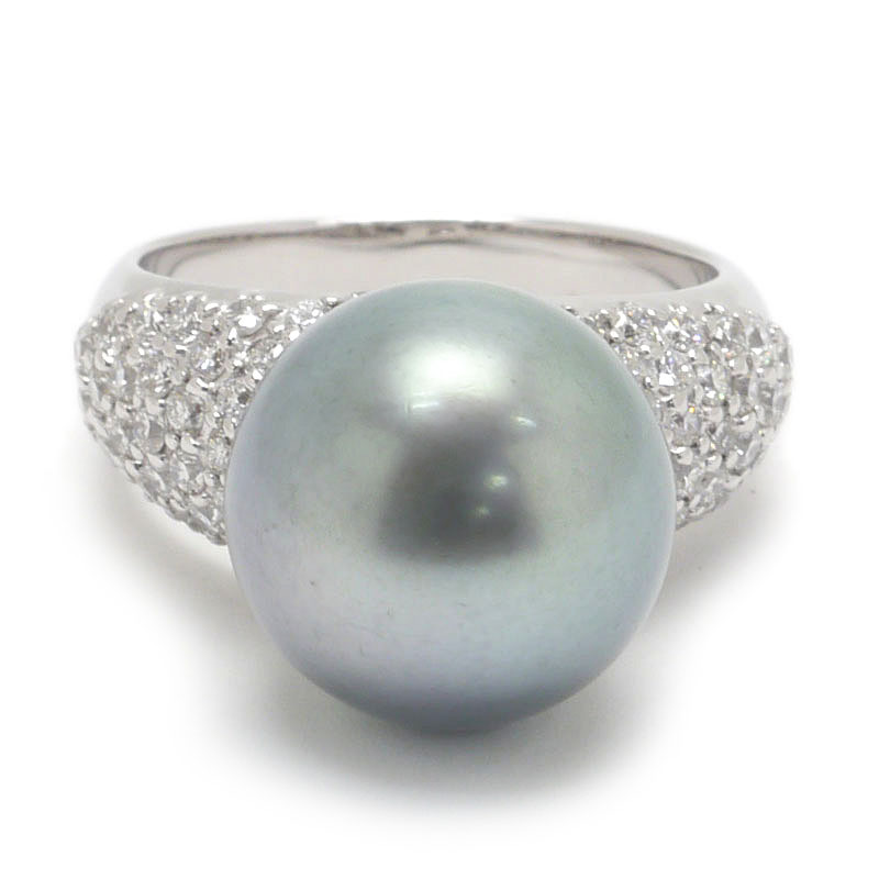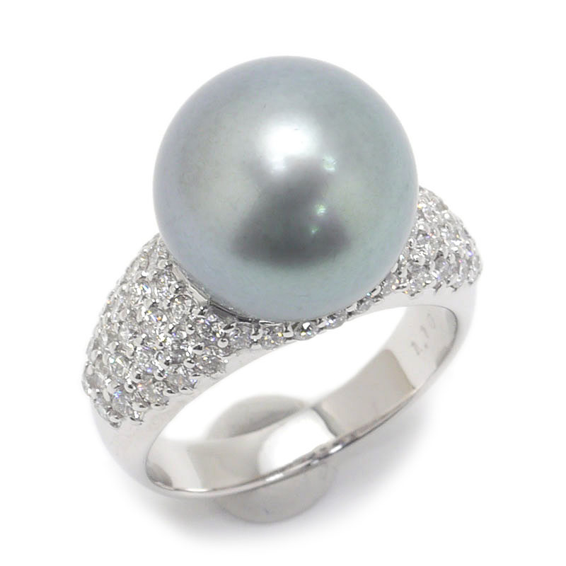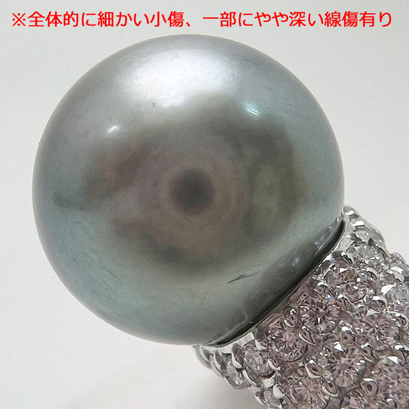【中石・脇石】照り艶の良いグレー系のクロチョウパール。鑑別書には「プレミアムシルバーグレーカラー」の記載有り。注視すると全体的に細かな傷や、やや深い線傷箇所もございますが、身に着ける際には目立ちません。ダイヤは高品質な石がセレクトされており、照り輝き抜群です。