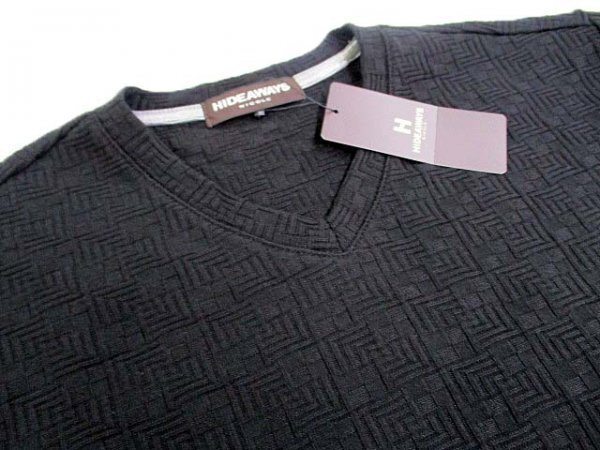 新作★50(LL)★\8690〓HIDEAWAYS by NICOLEニコル〓幾何学柄風ジャガード長袖VネックTシャツblack