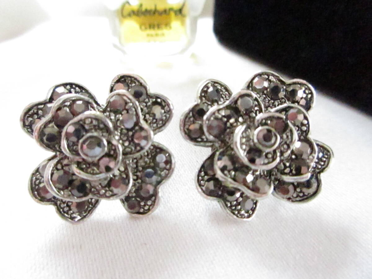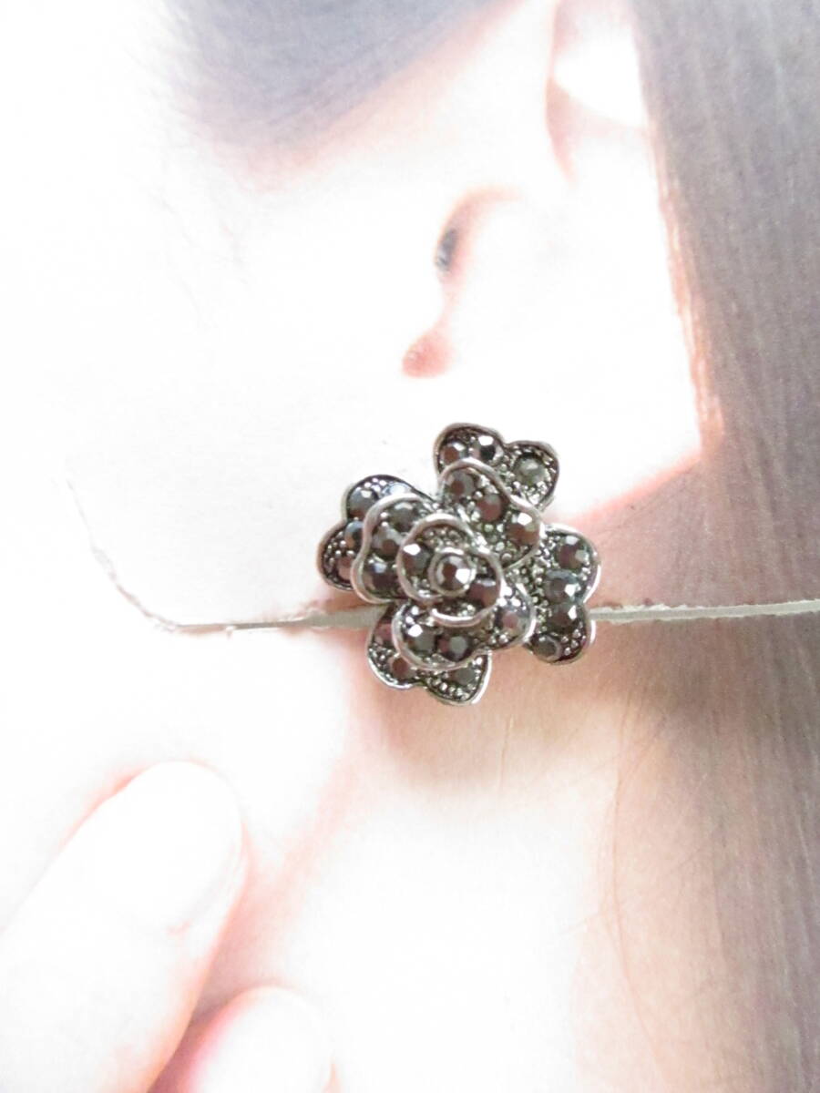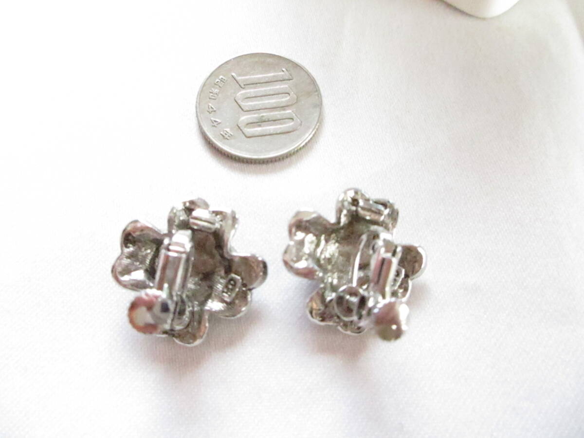 ♪ビンテージ/ヴィンテージ 何かの刻印?シルバートーンのラインストーンが輝く 薔薇のお花 ROSE ローズ形 レトロのイヤリング