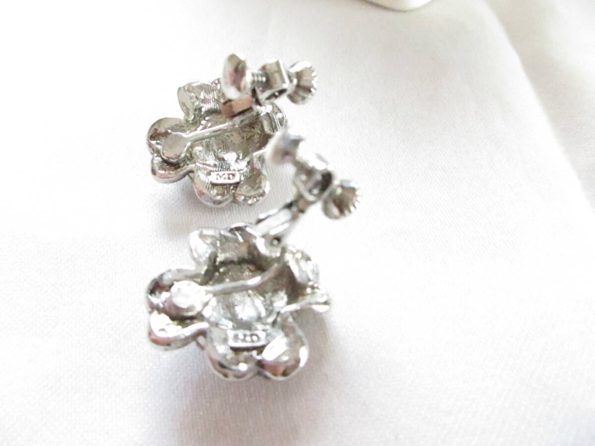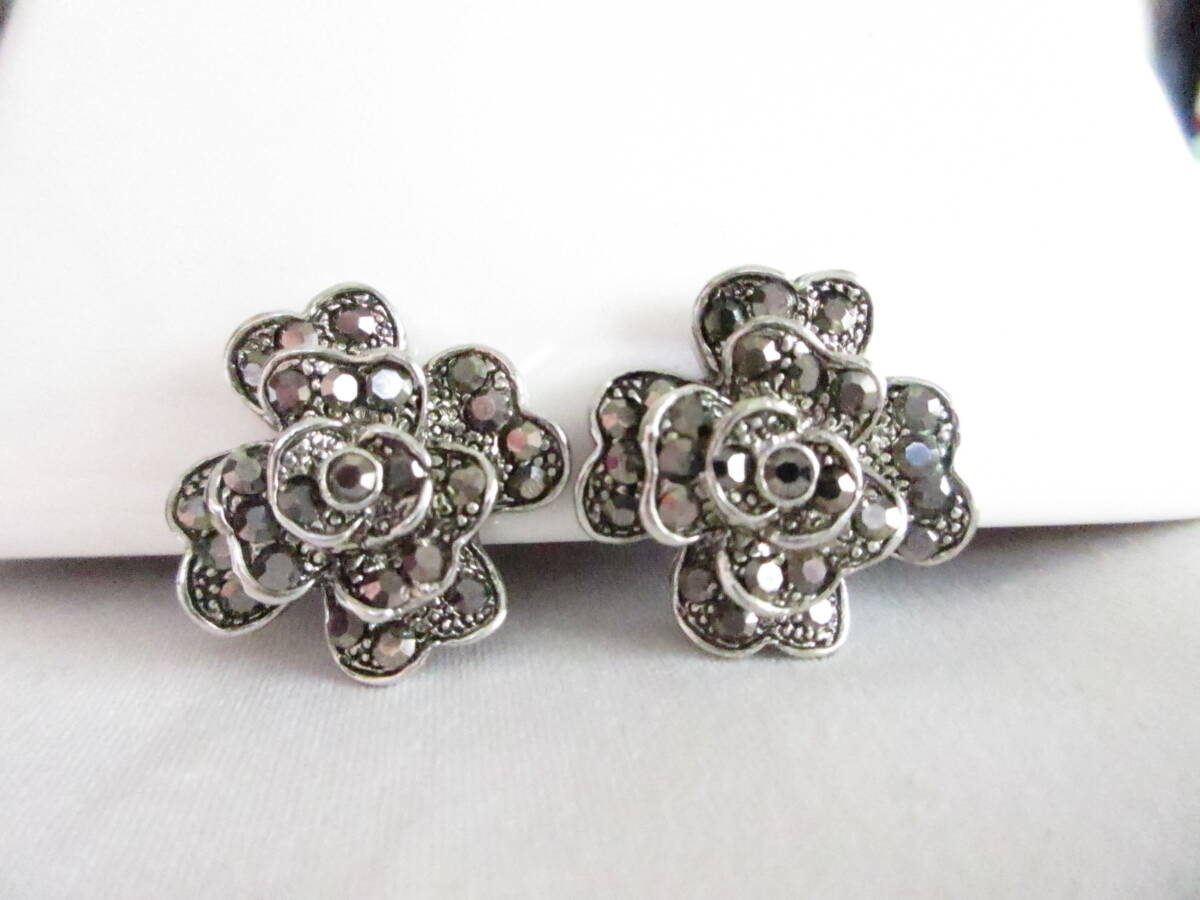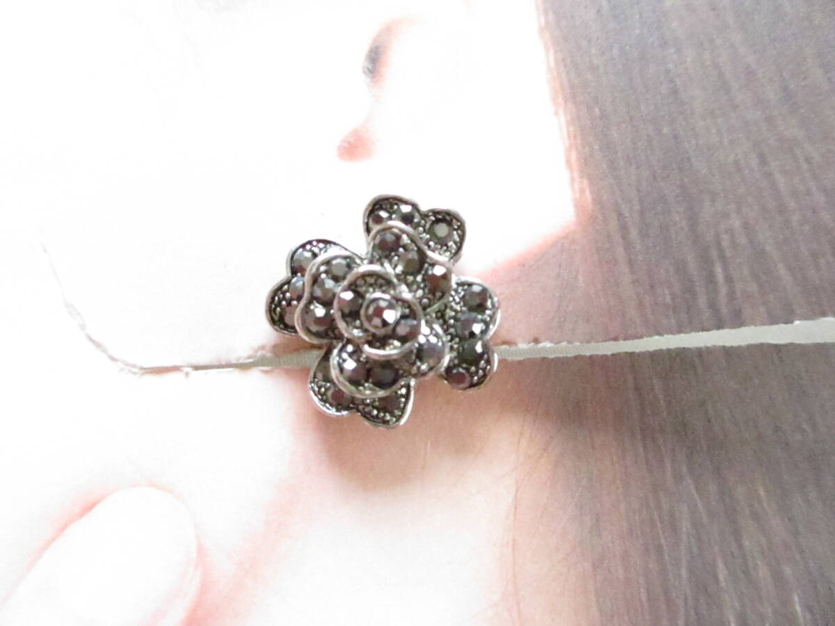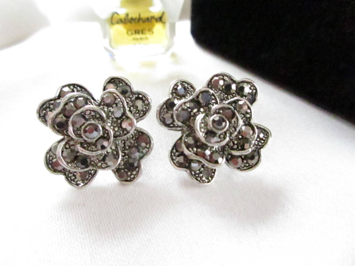 ♪ビンテージ/ヴィンテージ 何かの刻印?シルバートーンのラインストーンが輝く 薔薇のお花 ROSE ローズ形 レトロのイヤリング