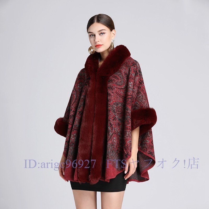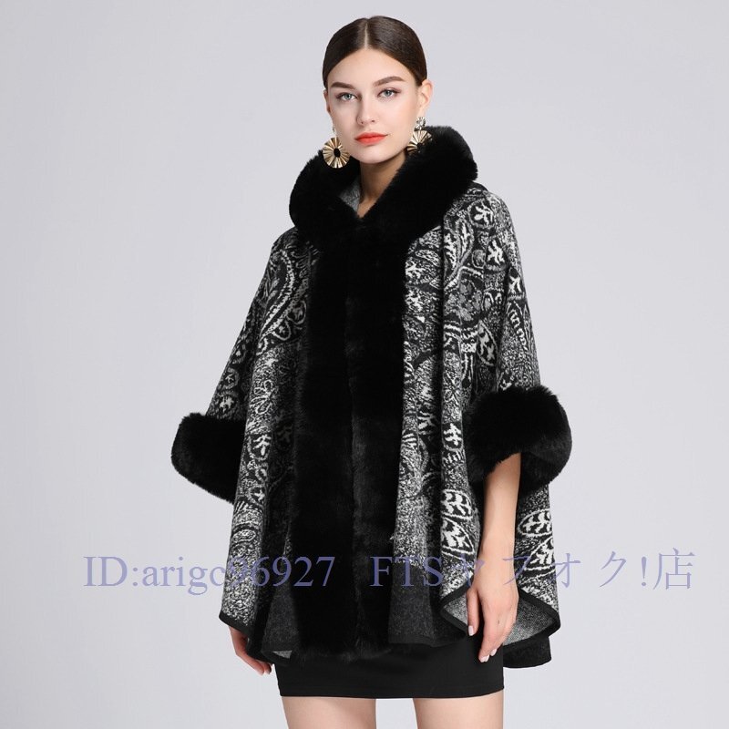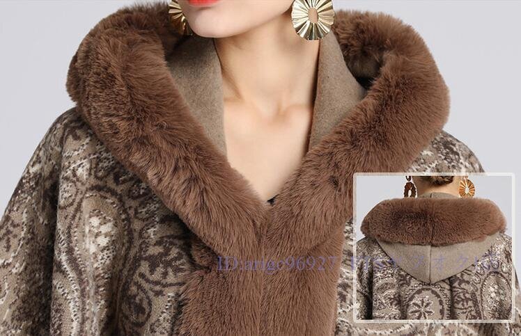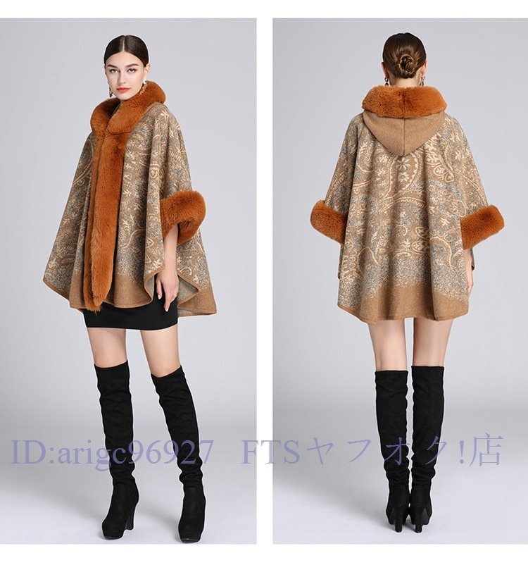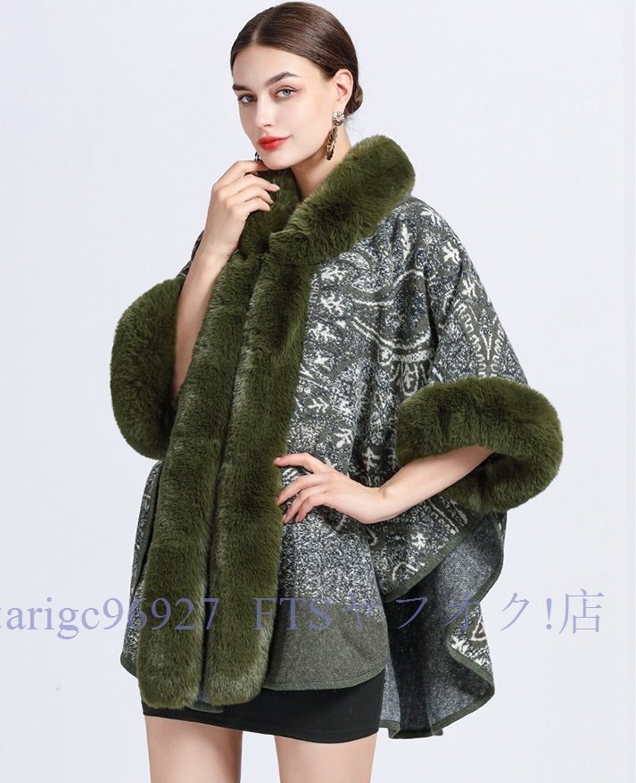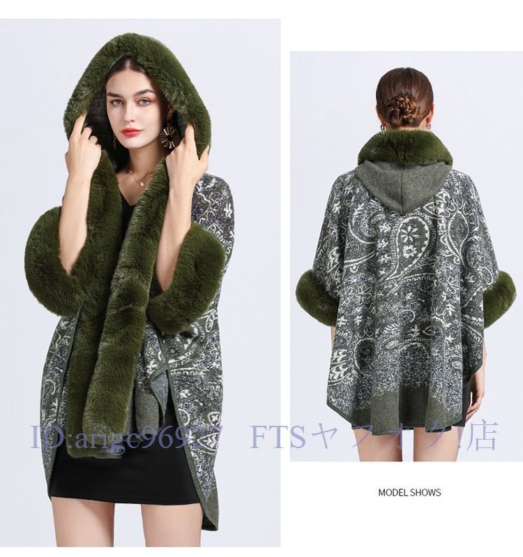 A6488☆新品冬新品 ポンチョコート レディース マントコート おしゃれ フード付き総柄上品フェイクカシミヤニット カーキ