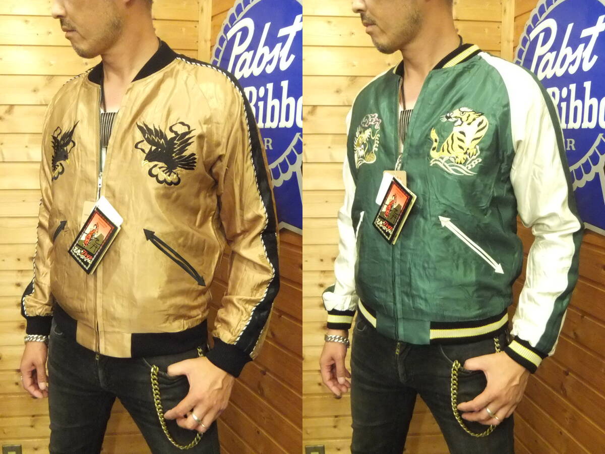 ・特徴    : ◎スカジャンの代表的柄でもある、[虎][鷲][龍][Japan文字]などが刺繍された、「スカジャンとは、こういうモノです!」といった雰囲気の、代表的な絵柄の一品です。    ◎中綿無し仕様で、暑くなる時期にも対応!⇒中綿無し&両面アセテートならでは!の、「ヒラヒラした感じのドレープ感」が特徴的な着心地です。
