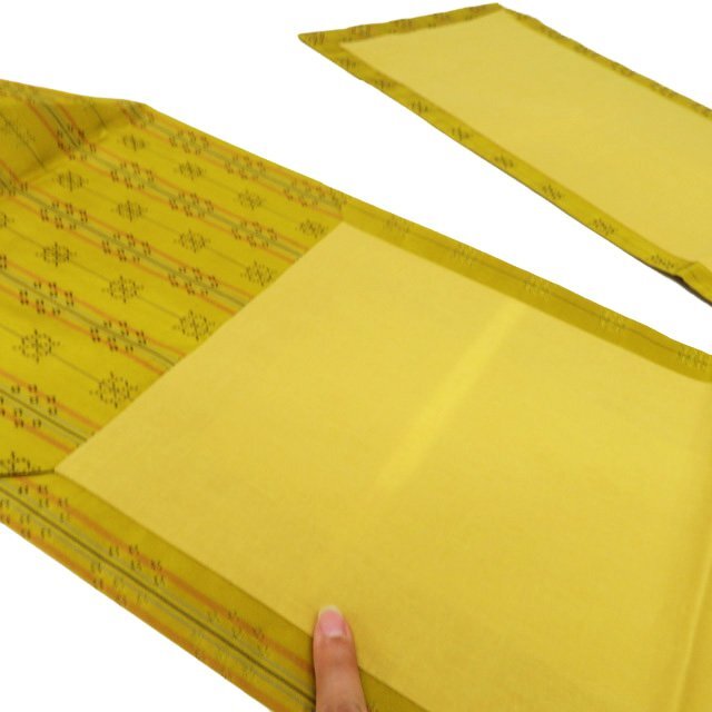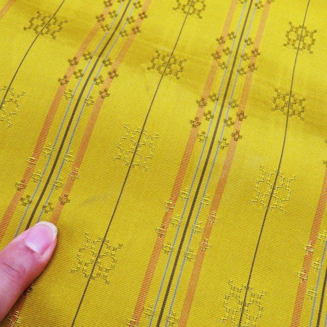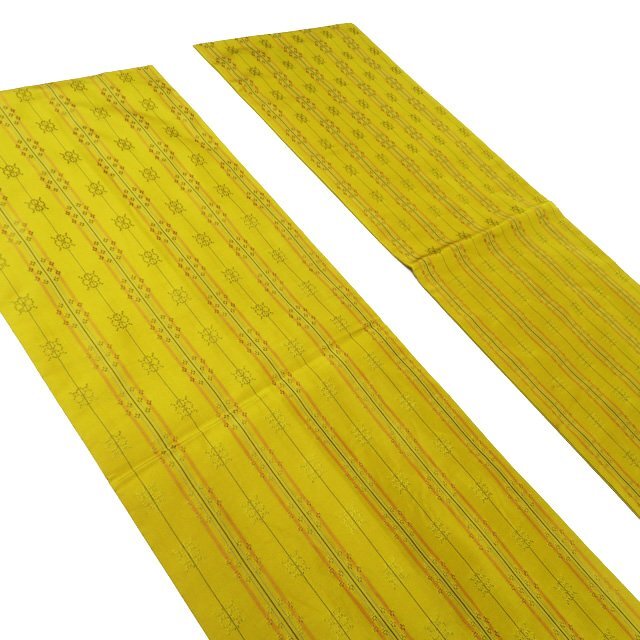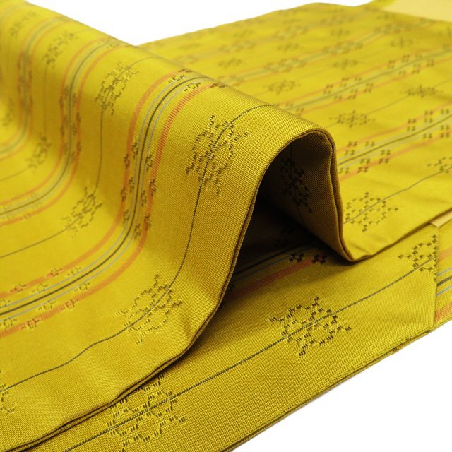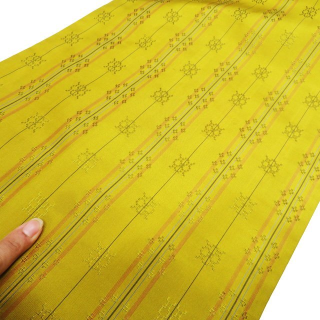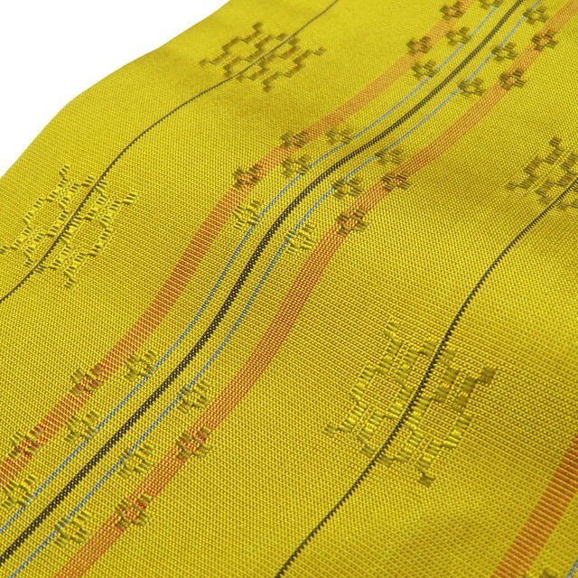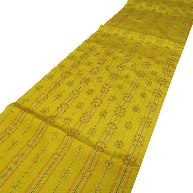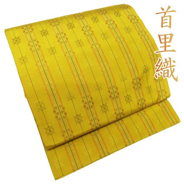 サイズ 368cm x 31cm 素材 正絹 商品ランク C ●お色 櫨染色 多色 沖縄が誇る伝統工芸品【首里織】。 沖縄が琉球王国であった時代に東南アジアや中国との交流によって学んだ技術を使い、首里で織られた織物。まれに化学染料などで染められる事もありますが、琉球藍やフクギ、テカチ、シブキ、グールなどの植物染料で染められる事がほとんどです。色鮮やかで気品溢れる模様が特徴です。 首里織は伝統的な作品ですが、その織りの工程はとても複雑で手間がかかり、熟練の職人でも1日に30センチしか織れない事もあると言われていました。 この独特の織り上がりの美しさを、是非お手元でご堪能下さいませ。 所々汚れ、裏側にヤケがございますが、まだまだご着用いただけるお品物です。 証紙等、付いていないお品物です。 写真に写っている帯のみの販売で、小物等の付属品はついておりません。 一部商品は実店舗・他サイトでも並行して販売しておりますので売り切れの際はご了承ください。 その他多数販売中 gu- | ||||||