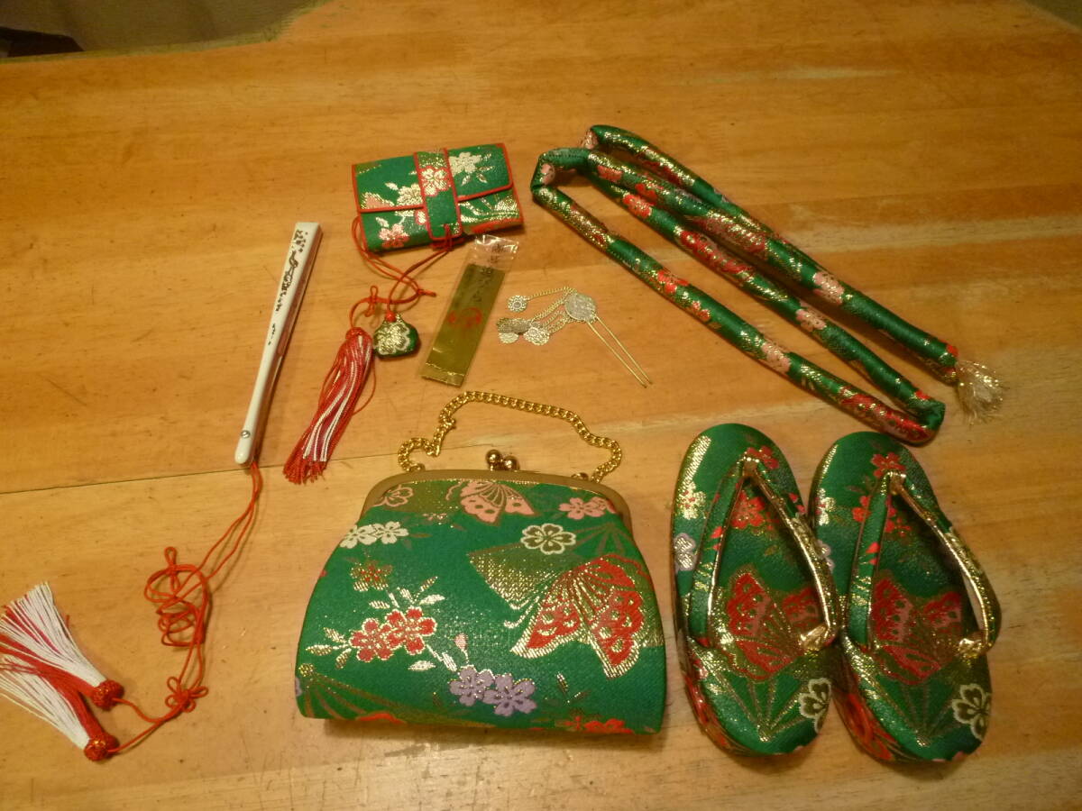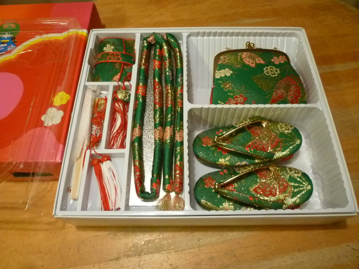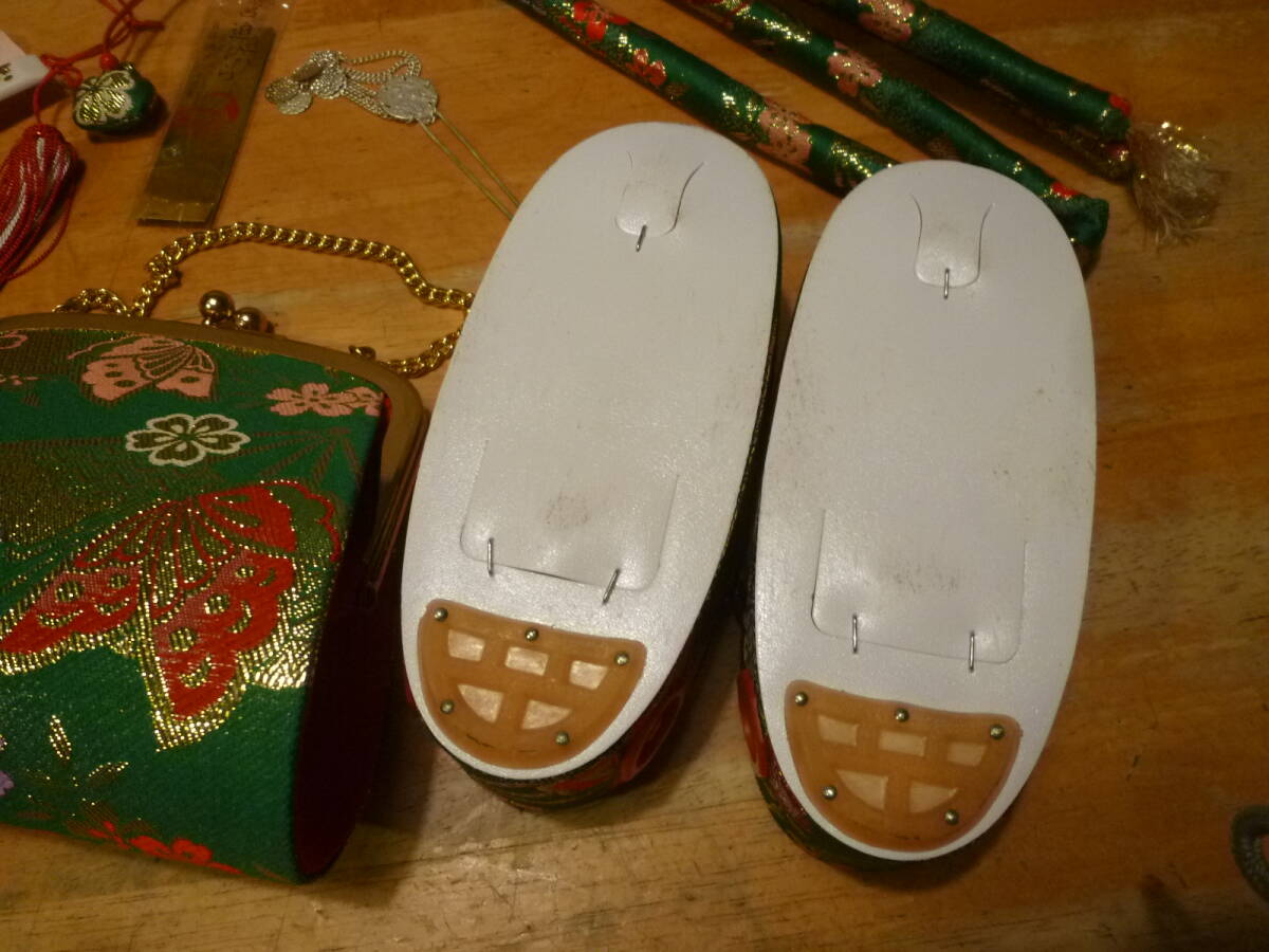 こちらは七五三用のお祝いセットの様で、本キルク使用とあります。6種類ほどのセットになり、当初の内容表示はありませんが揃っていると思います。草履のかかと両サイドには鈴入りで小さくシャラシャラとなる様です。