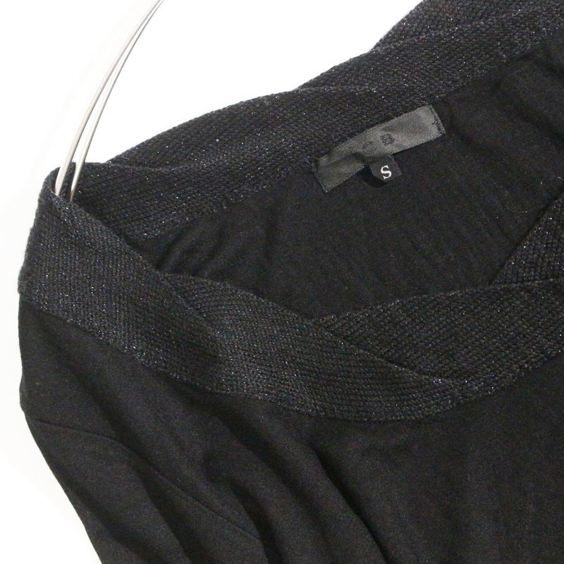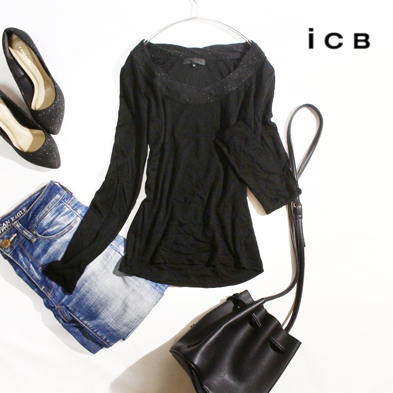 美品 ICB アイシービー 株) オンワード樫山 合物 首元ラメニット 丸首 ストレッチ Tシャツ 長袖 カットソー S ブラック 黒 無地 綺麗め