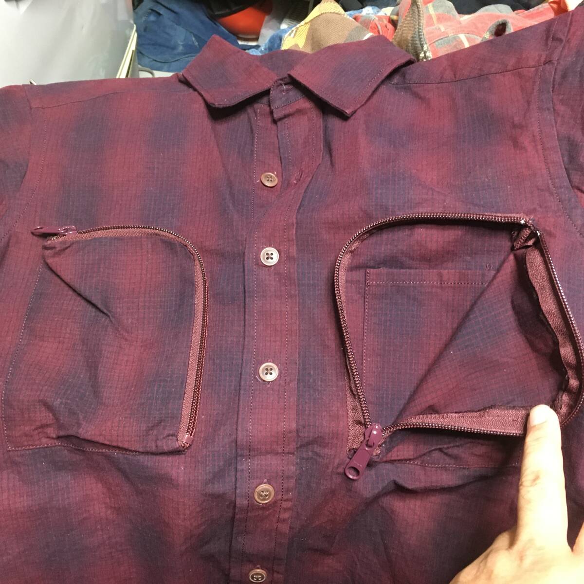 内側の下から外側上部まで開閉可能な両胸の立体ポケットが特徴的です。