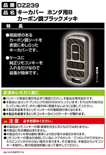 ホンダ車用・カーボン調ブラックメッキ カーボン調ブラックメッキ DZ239・Color:カーボン調ブラックメッキ・ホンダ純正リモコンキー(スマートキー)専用キーカバー・高級感のあるカーボン調のデザインをあしらったキーカバー・ケースにリモコンキー(スマートキー)を入れるだけの簡単装着・【適合車種例】Nボックス(H23.12~)、Nワン(H24.11~)、Nバン(H30.7~)説明 商品紹介 【ホンダ純正リモコンキー(スマートキー)専用カバー】 本製品はホンダ純正リモコンキー(スマートキー)専用のキーカバーです。 おすすめ車種 ※2023(R5)年9月現在・以降のモデルは未調査 ・年式、グレード、仕様によりキーの形状が異なる場合があります。必ずキーの形状が同じであることを確認の上お買い求めください。 ホンダ Nバン (H30.7~) JJ1/JJ2 ホンダ Nボックス (H23.12~H30.4) JF1/JF2 ホンダ Nボックス (H29.9~ R5.10) JF3/JF4 ホンダ Nボックススラッシュ (H26.12~R2.2) JF1/JF2 ホンダ Nワゴン (H25.11~R1.8) JH1/JH2 ホンダ Nワゴン (R1.8~) JH3/JH4 ホンダ Nワン (H24.11~R2.11) JG1/JG2 ホンダ Nワン (R2.11~) JG3/JG4 ※グレード・年式等でリモコンキーの種類が異なる場合があります。お持ちのリモコンキーが画像と同じ形かご確認ください。 ※上記にない車種でもリモコンキーのタイプ(形)が同じであれば装着可能です。 【簡単装着】 本製品はコインでケースとカバーを外し、リモコンキー(スマートキー)を入れてカバーを取り付けるだけで簡単にお使いいただけます。 【大人の装いカーボン調デザイン&ブラックメッキ】 リモコンキーを傷から守りながら、カーボン調&ブラックメッキでリモコンキーを大人の装いに変えます。 【ロックアンロックの刻印入り】 本製品には、ロックとアンロックの刻印が入っています。※ロック・アンロック以外の刻印は入っていません。ボタン操作時に間違えないように注意してください。