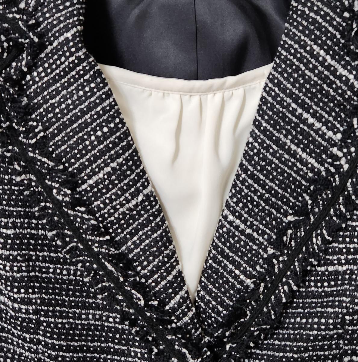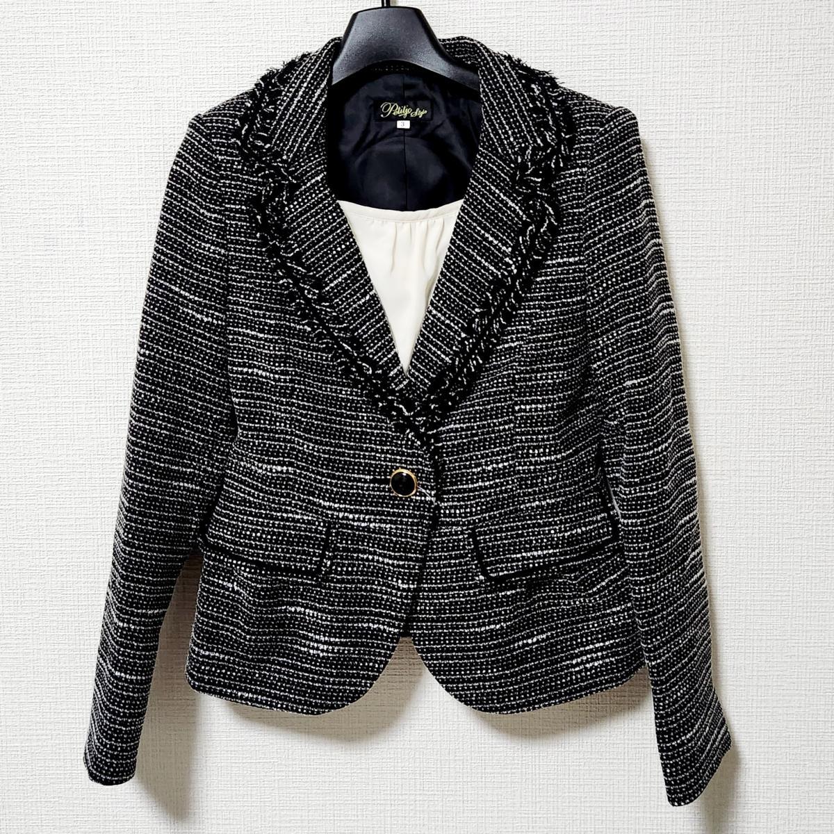 フリンジが可愛らしいツイード調のテーラードジャケットと、透け感のあるふんわりスカートの上下2点セットです