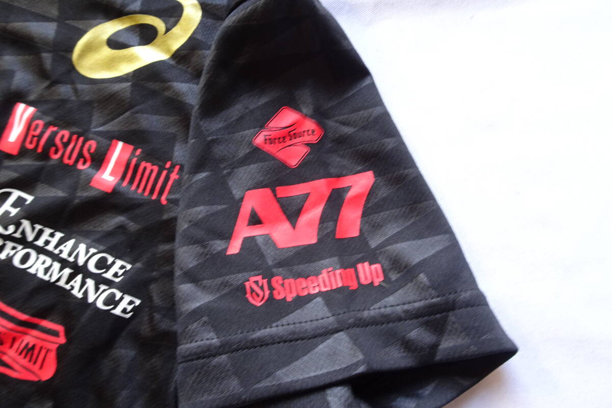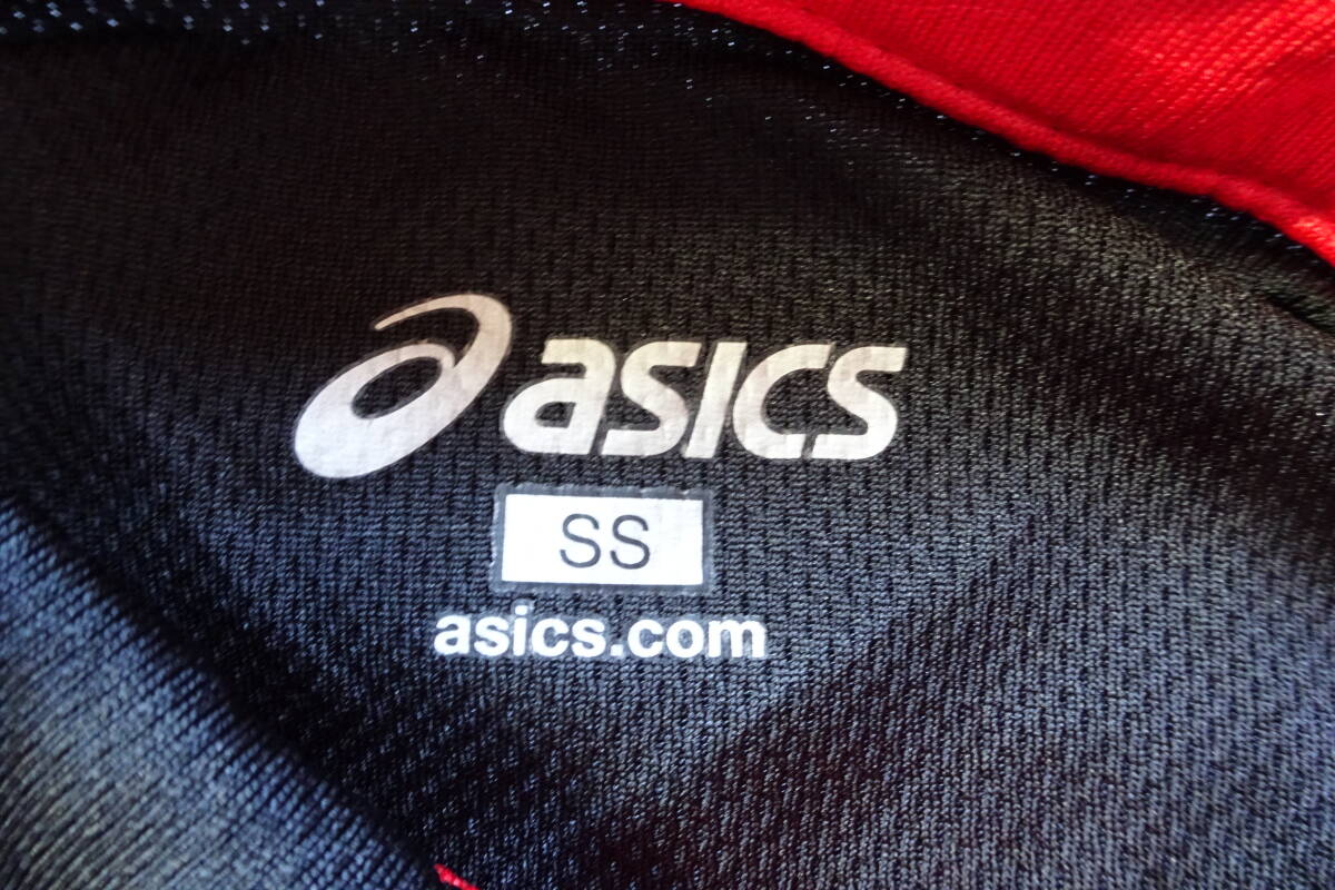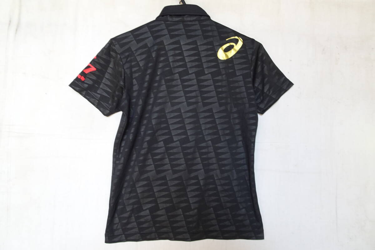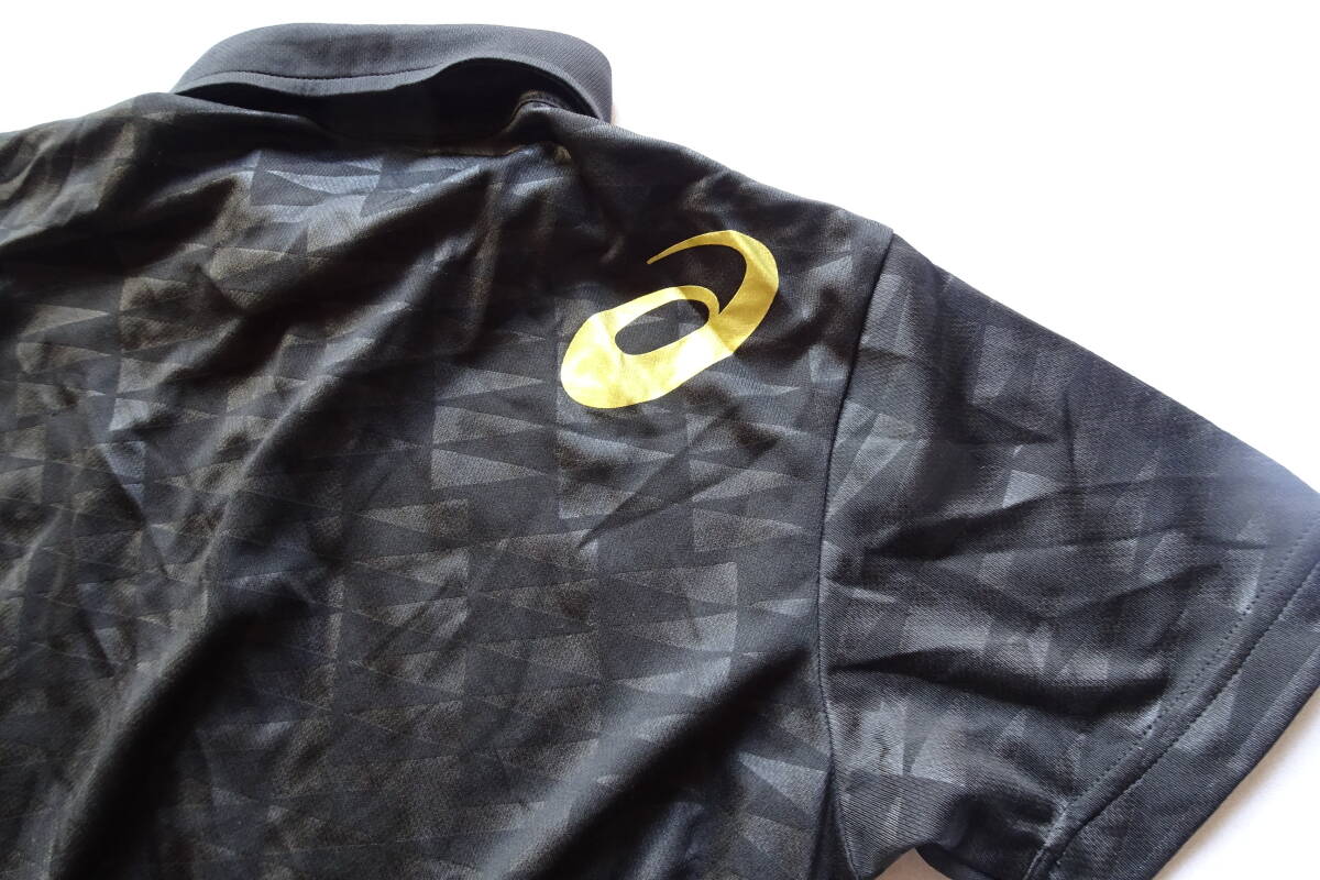 asics/アシックス/A77/半袖ボタンダウンシャツ/速乾性素材/三角形グラフィック柄プリント/ロゴプリント/黒/ブラック/SSサイズ(9/17R)